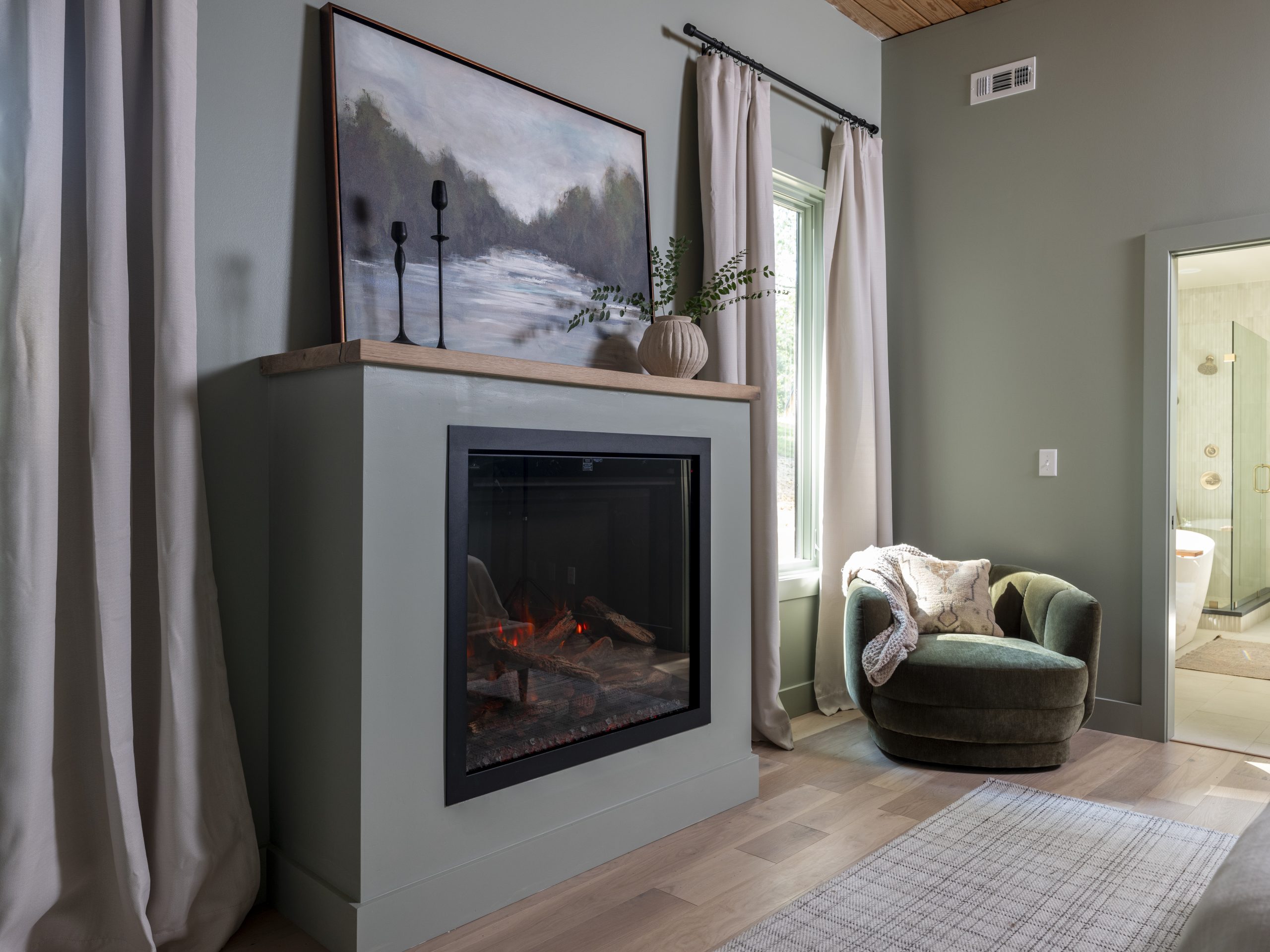 We poured concrete to create a new floor and added the necessary framing and drywall to put the house back together. The bedroom turned out so soothing and relaxing, thanks to an original wooden ceiling that had been hidden by the trailer, a new fireplace, and fresh paint. I chose a color that has become one of my go-tos, a bluish gray that feels modern while still soft and peaceful.