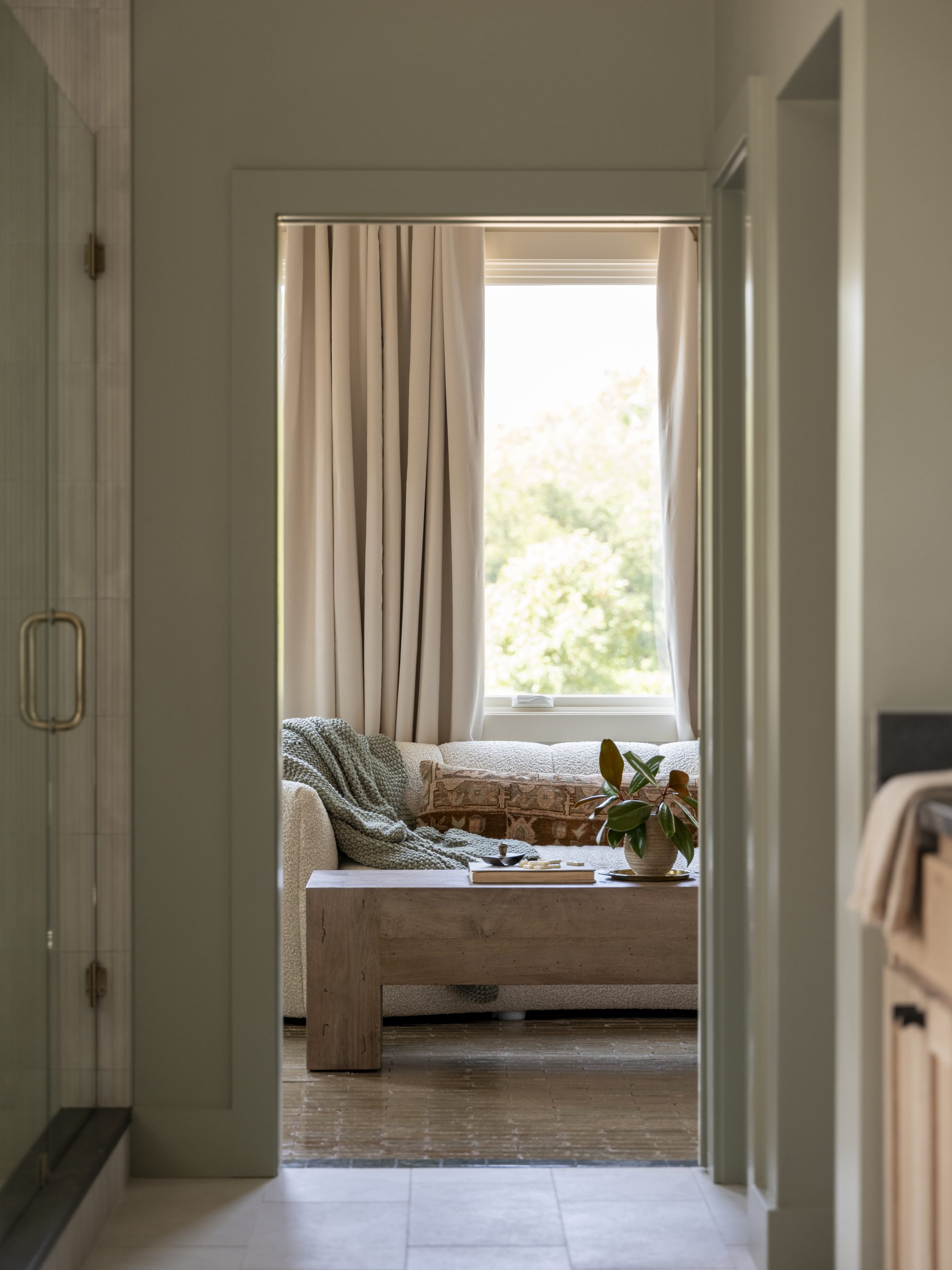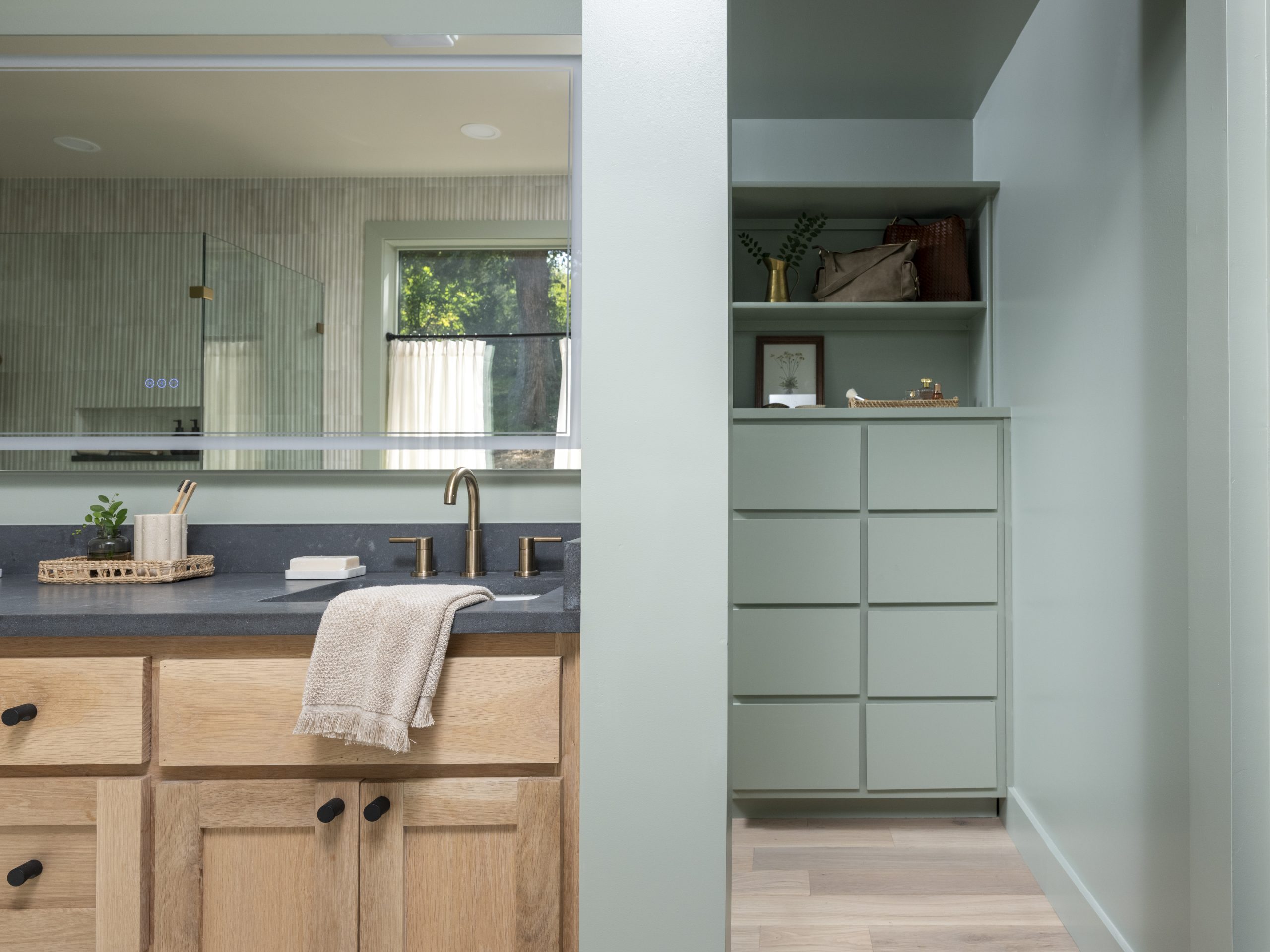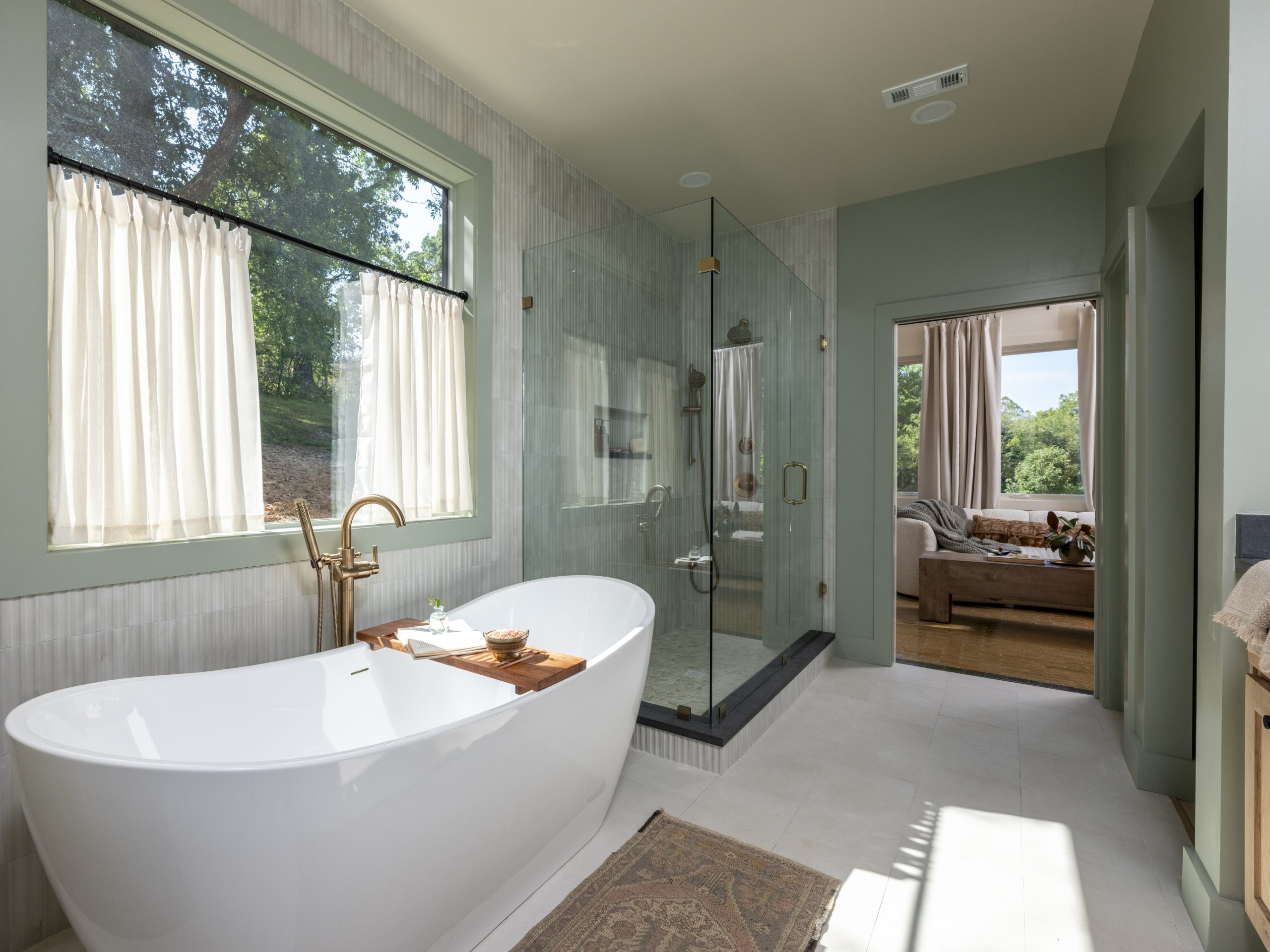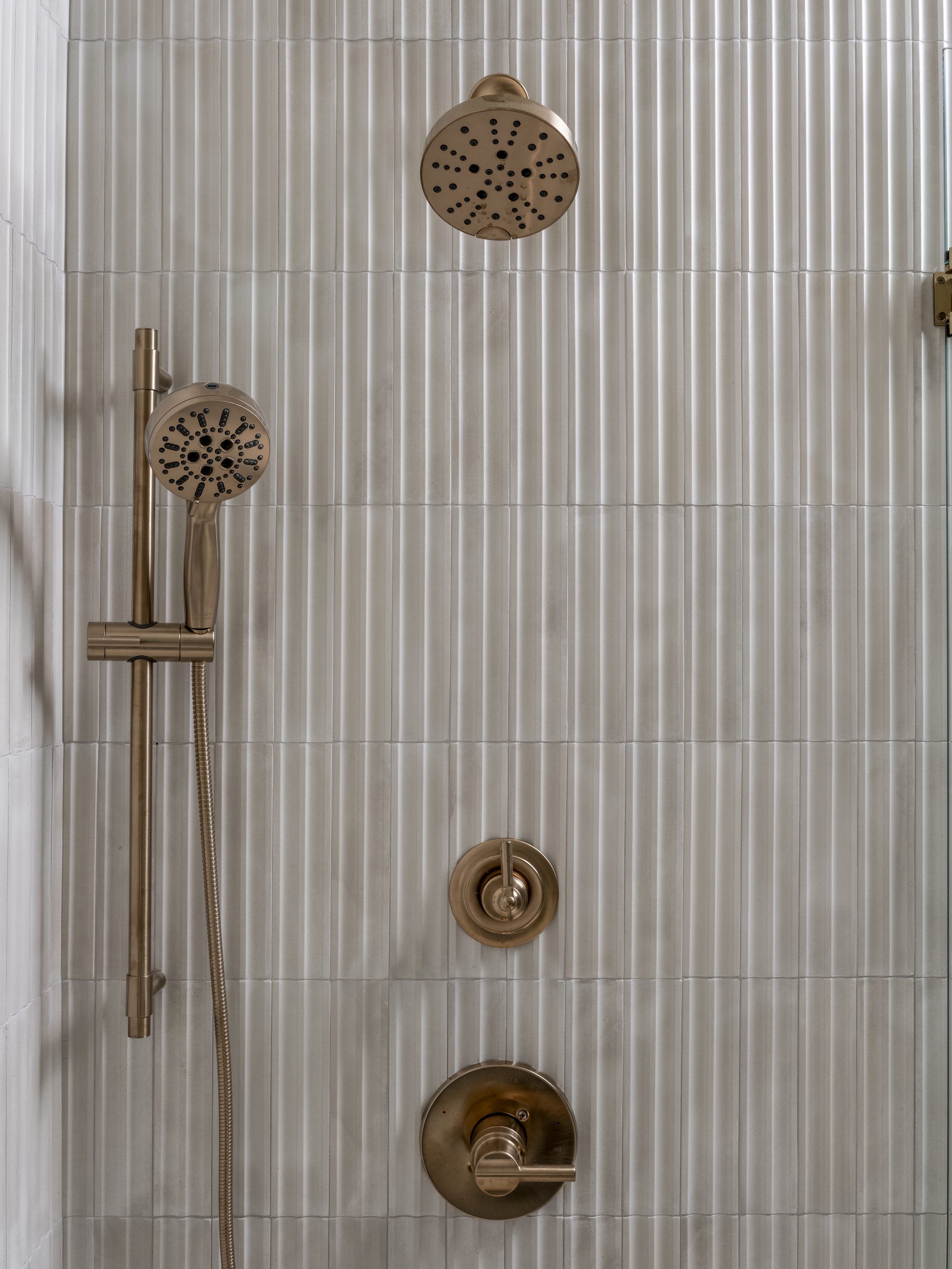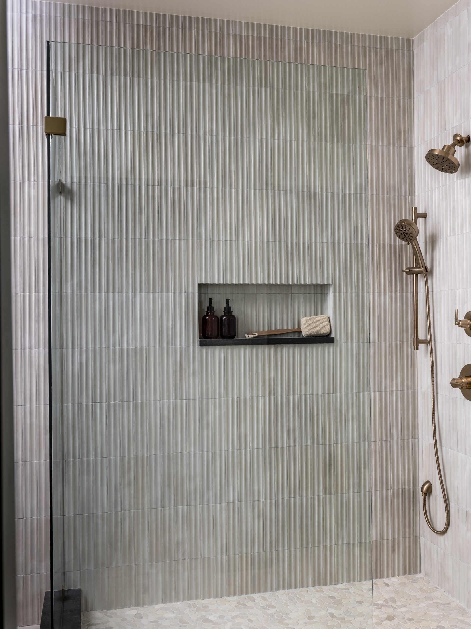 With a fresh slate, we were able to give the Wolfes a large, modern bathroom, complete with a tub under the window and a spacious walk-in shower. They loved the unique wavy tile pattern and the bright, airy feel of the space overall.