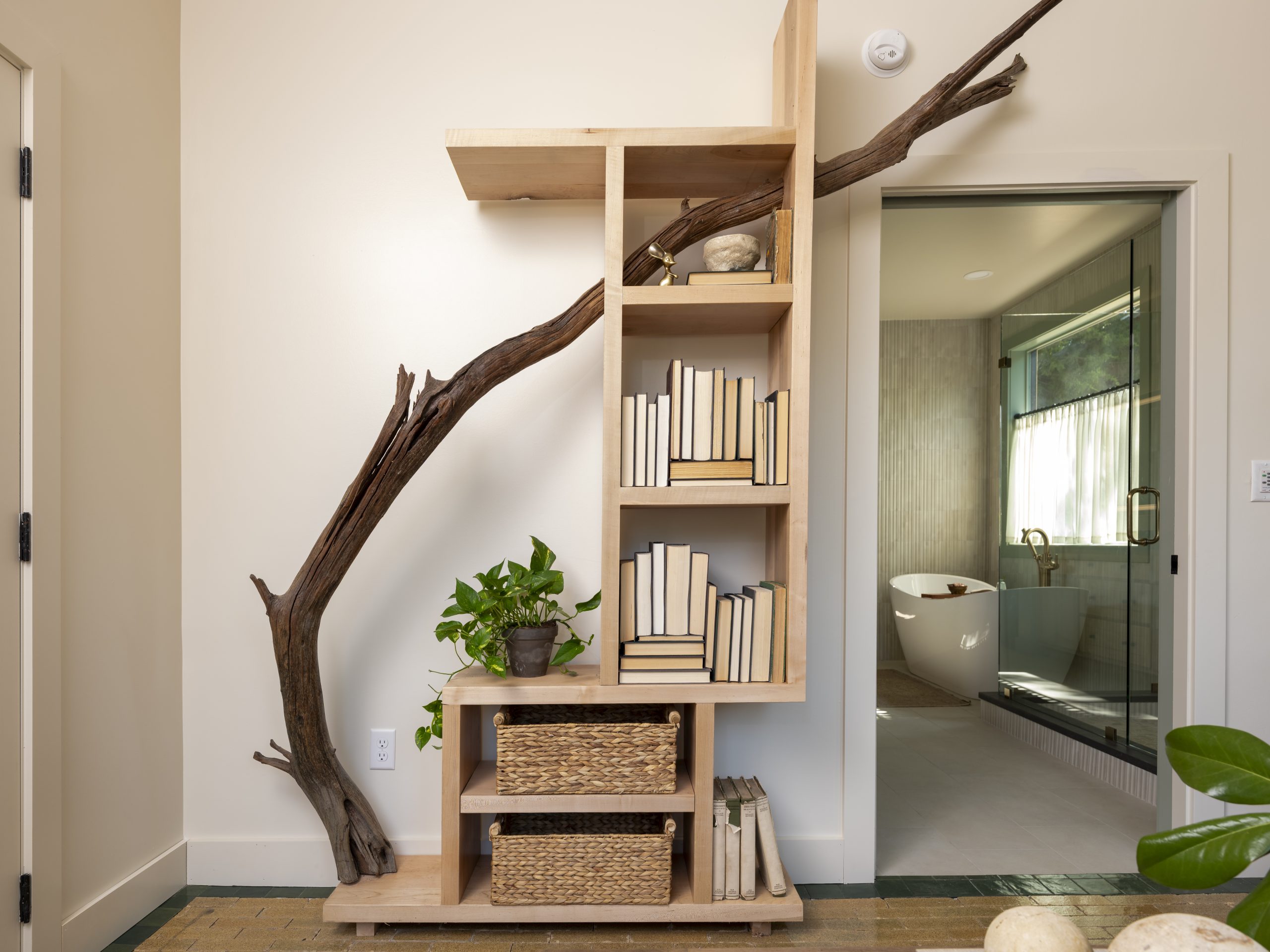 It was important to Emily to have a designated workspace in her new home. Since she tutors students online, I wanted to give her something fun behind her where she could sit opposite the windows. Dave built a bookshelf with a unique piece of driftwood running through the center, adding a whimsical, natural element that fits perfectly with the style of the house.
