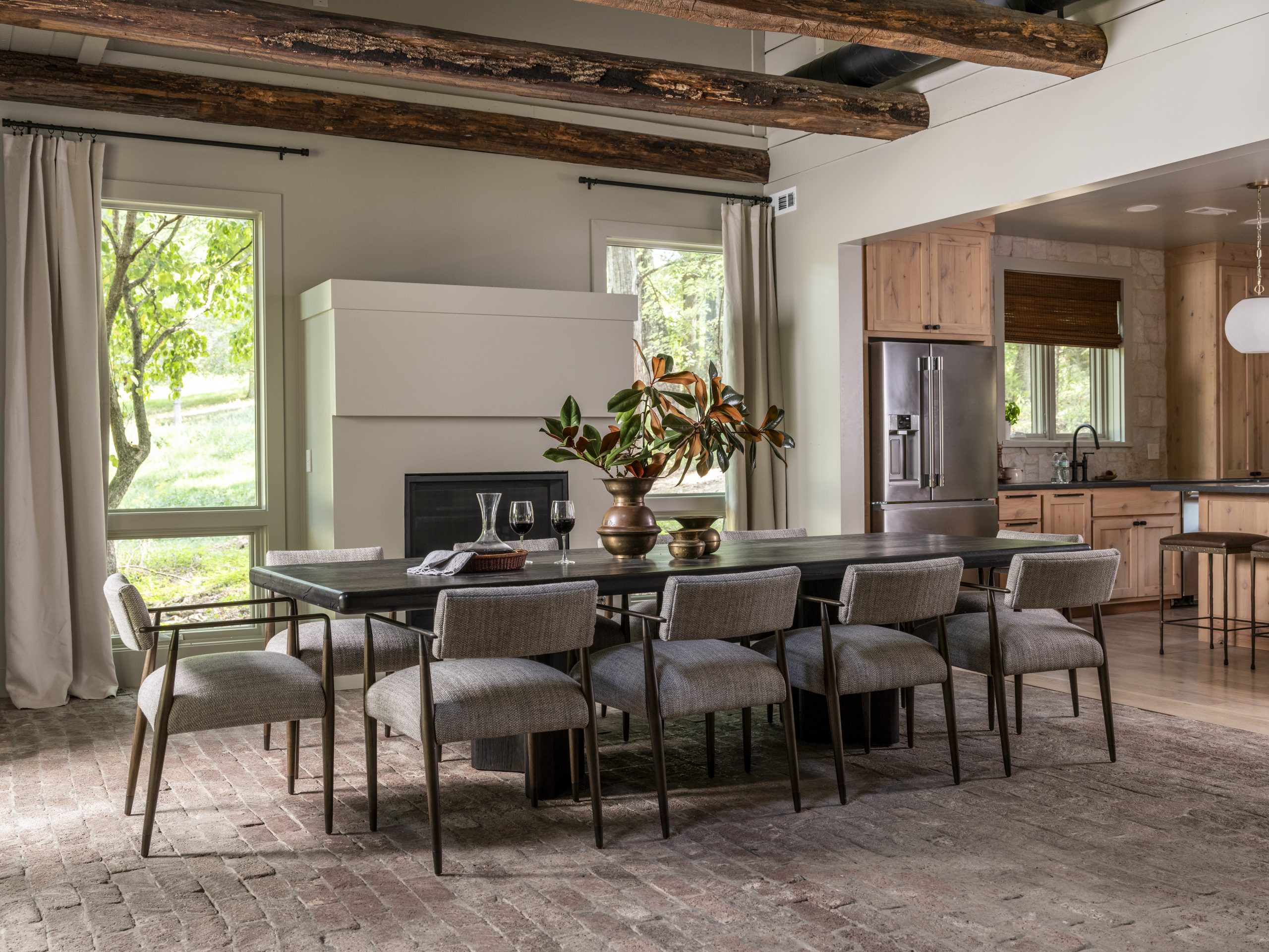 Between the open kitchen, living room, dining area, and the high vaulted ceiling, this part of the house could have felt cavernous if we had gone with a traditional white paint. Instead, I chose a warmer taupe that complements the brick and wood beams, creating a much cozier feel.