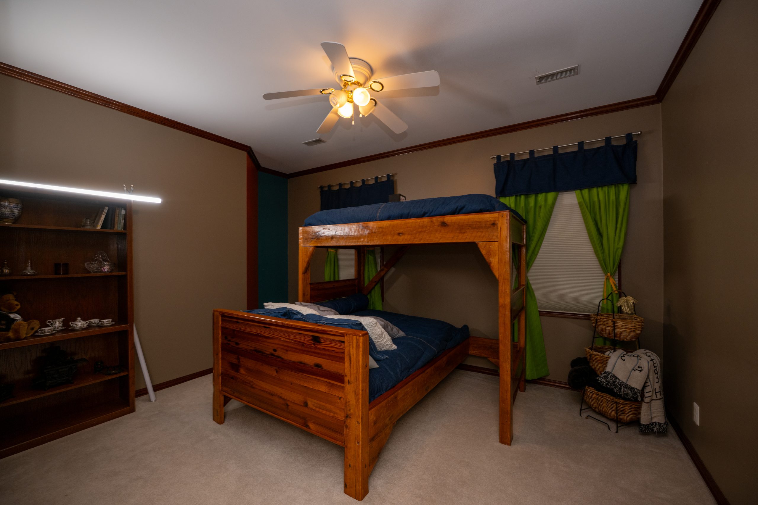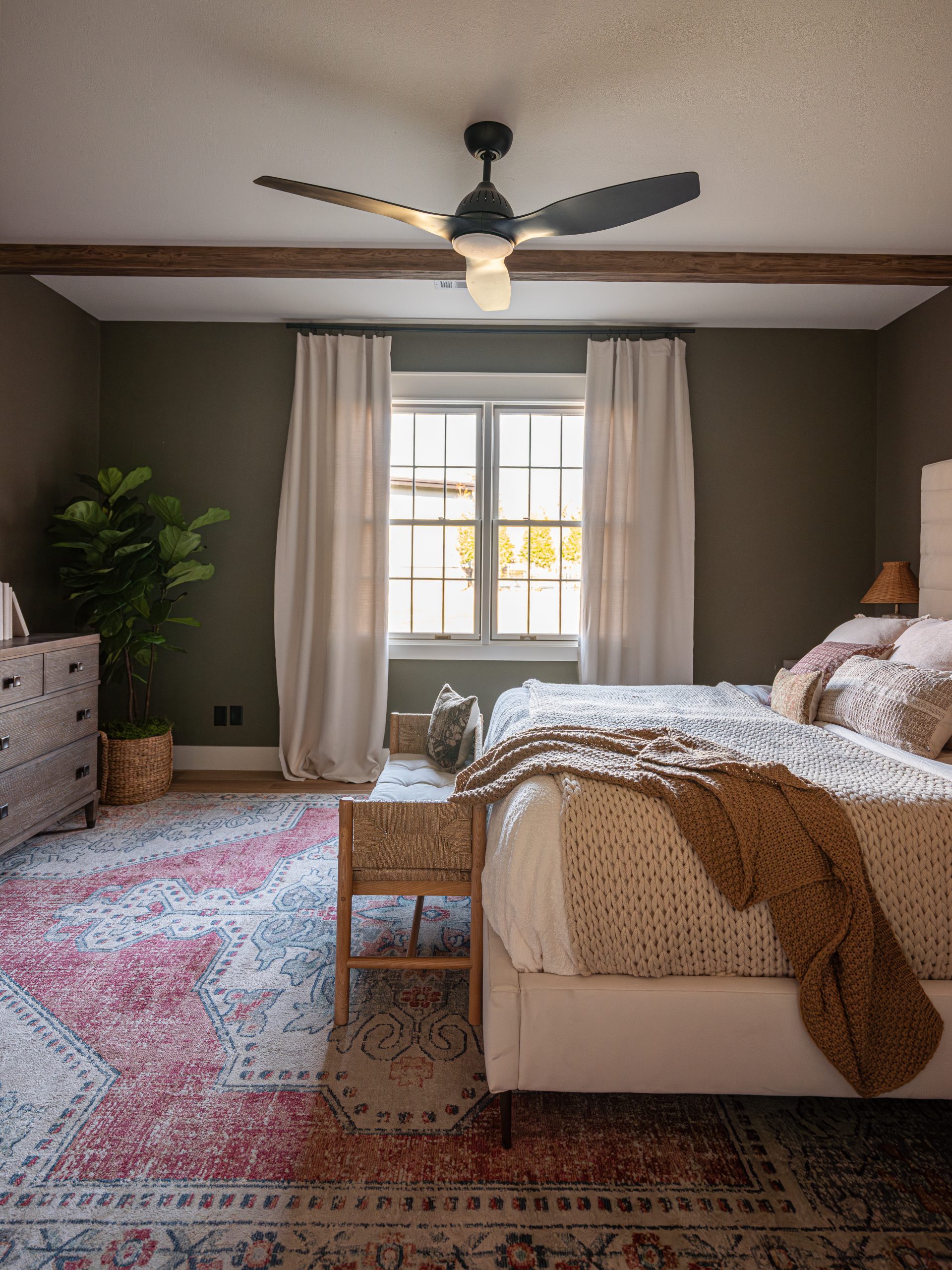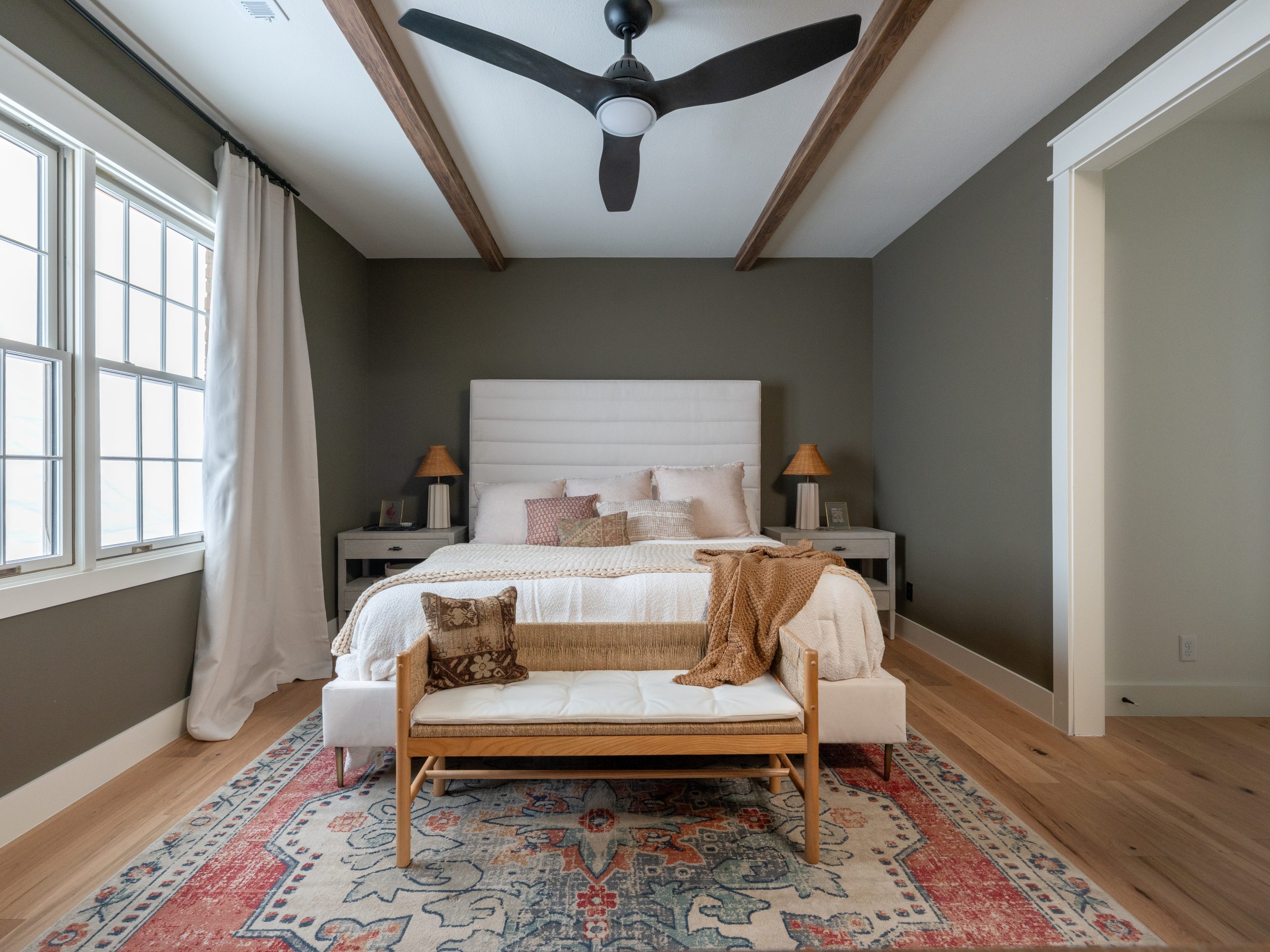 Angie asked for the room to feel dark and peaceful, so we painted the walls a calming green and added warmth with wooden beams along the ceiling.