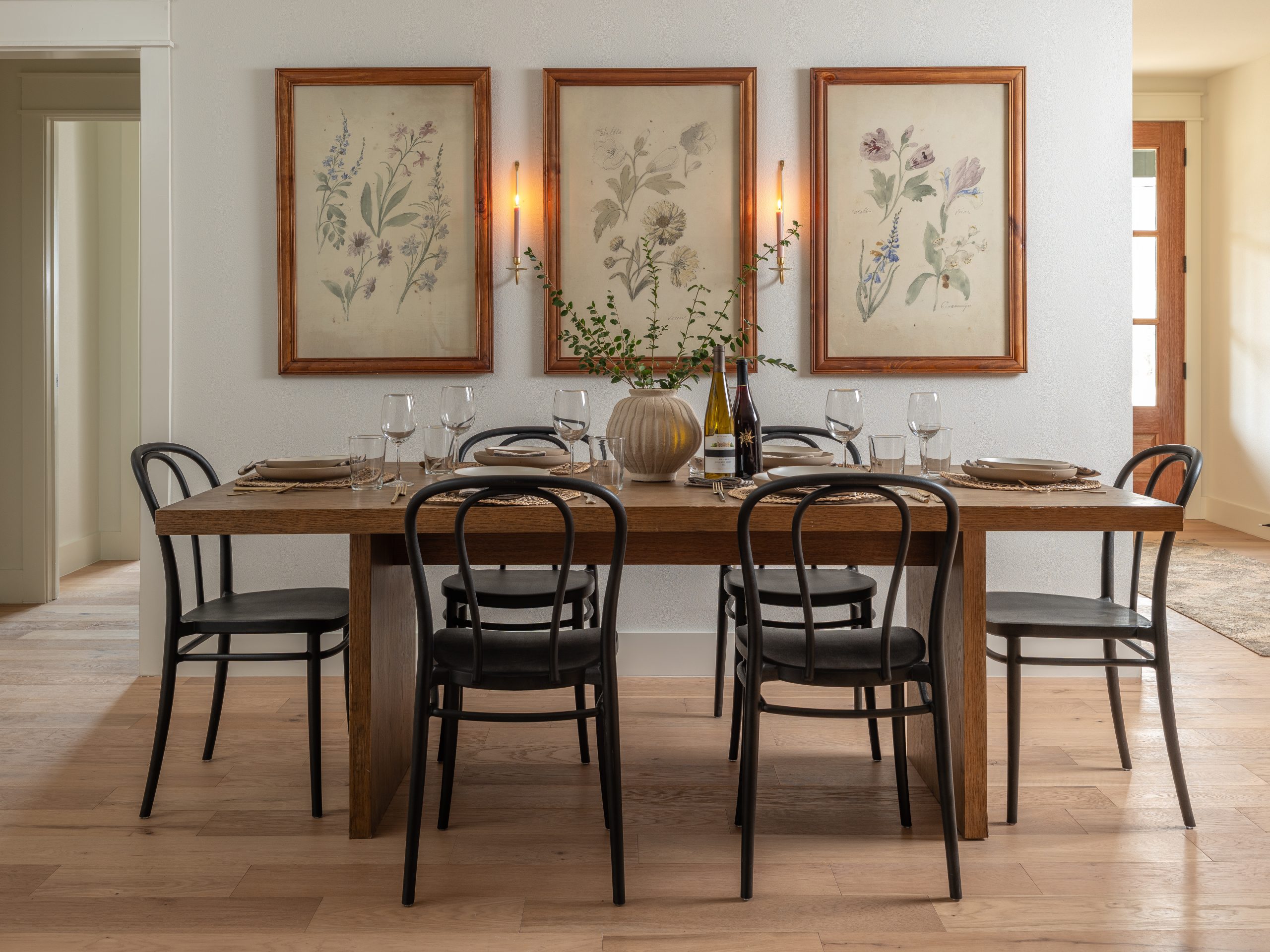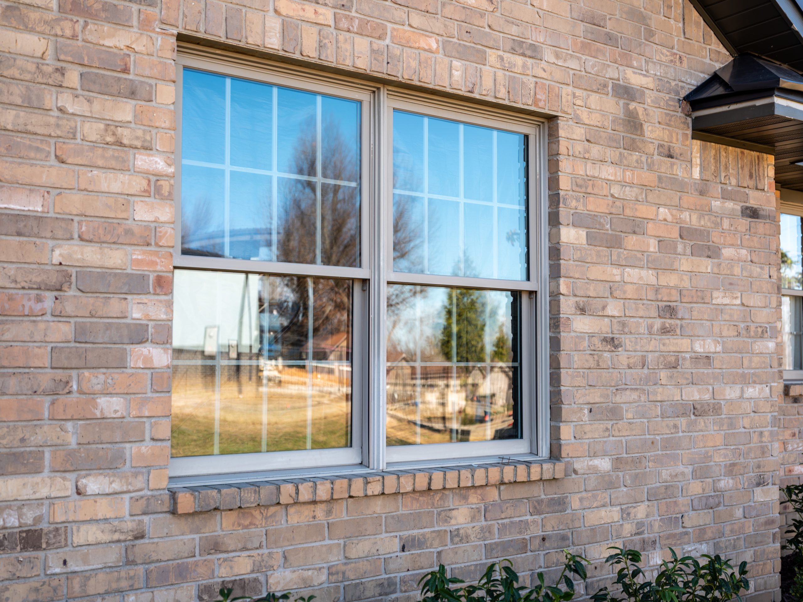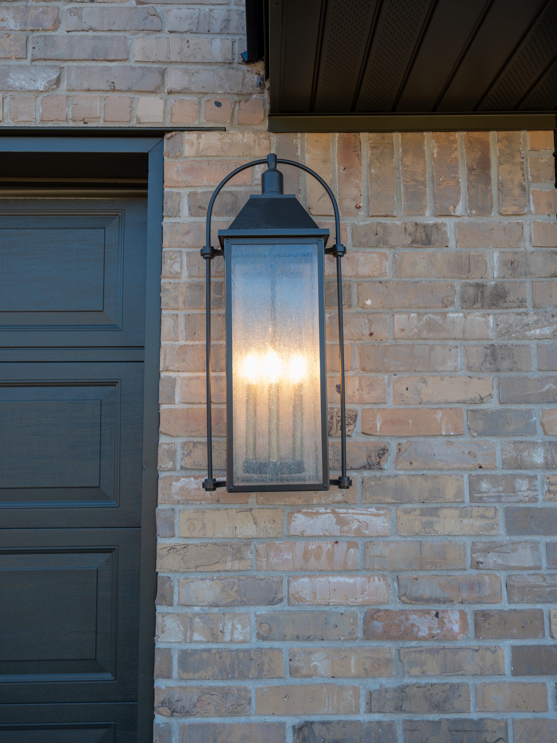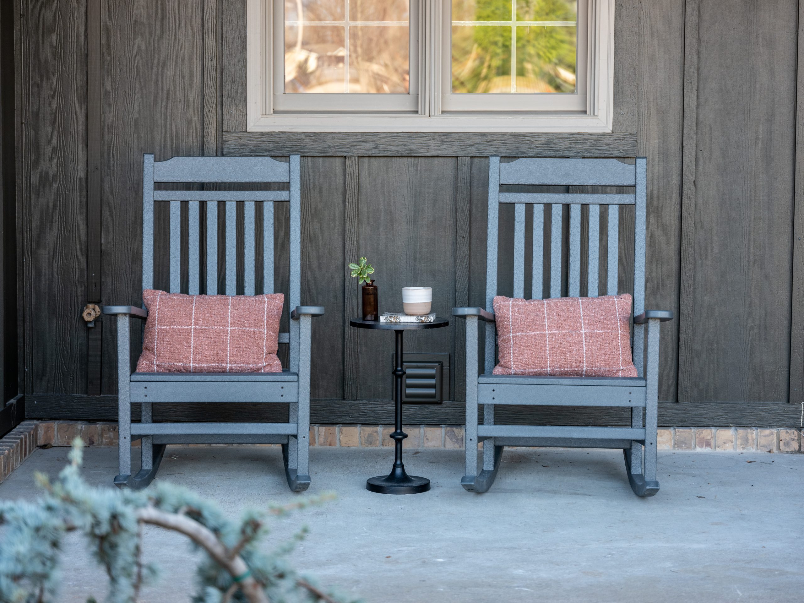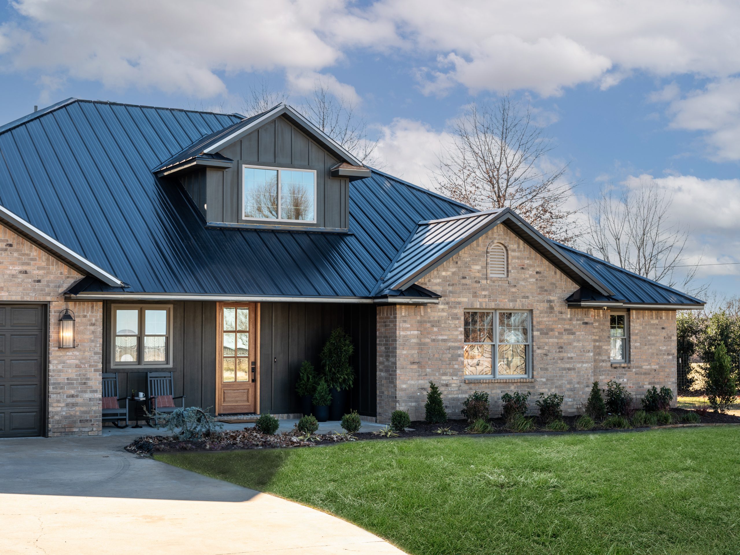 To do that, we replaced the large arched window with a more streamlined version, added board and batten to break up the brick, and incorporated a metal roof to tie in with their son’s house. We also added a new wooden front door, which brings warmth and creates a beautiful contrast against the darker tone of the board and batten.