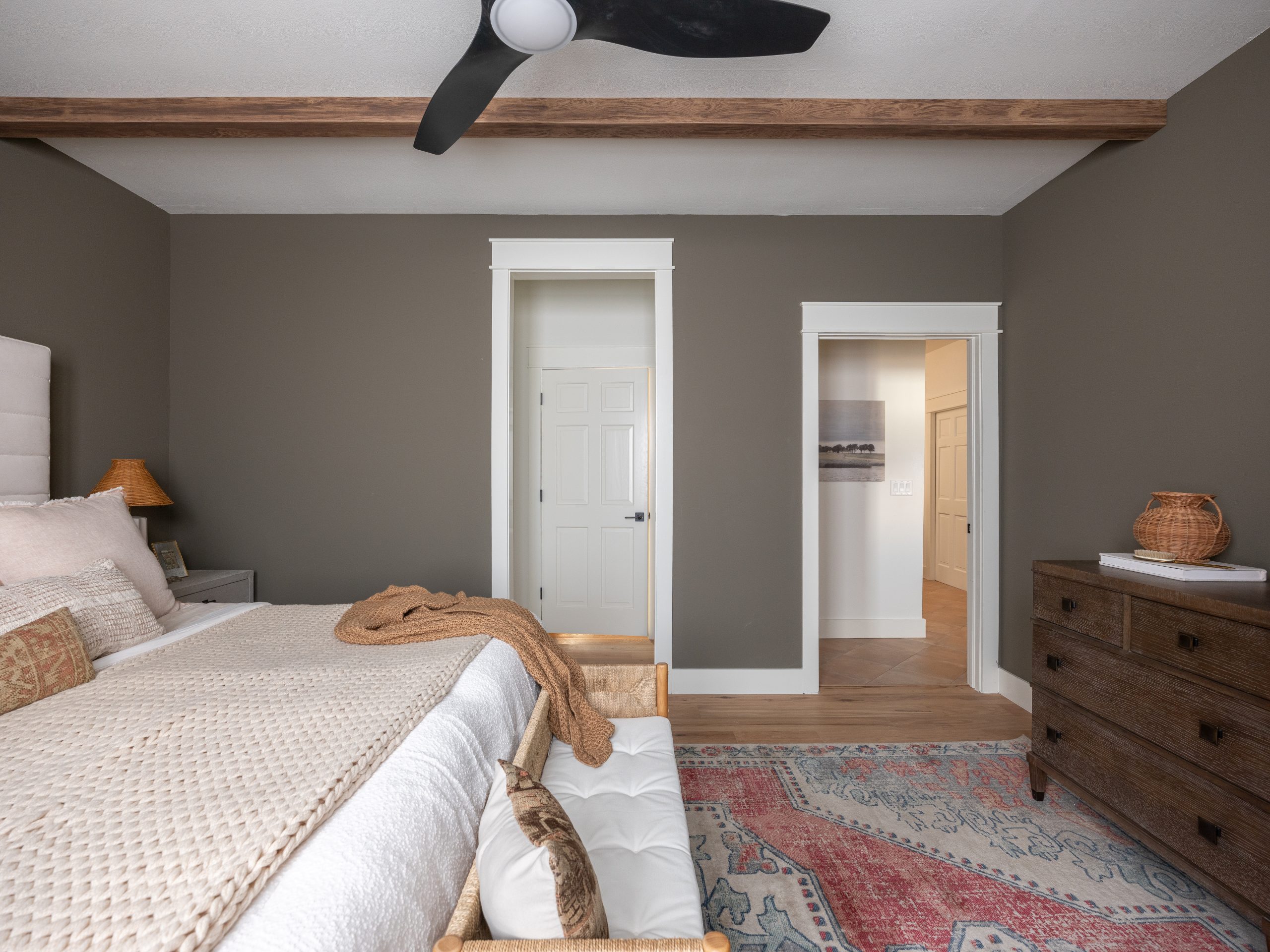 The Baileys’ biggest request for the bedroom was privacy and quiet. Originally, their bedroom was located right next to the kitchen, where they could hear every sound. They wanted to move it to the other side of the house, so we took the space that had been two guest rooms and a guest bathroom and turned it into a primary suite, complete with a main bathroom, walk-in closet, and a washer and dryer.
