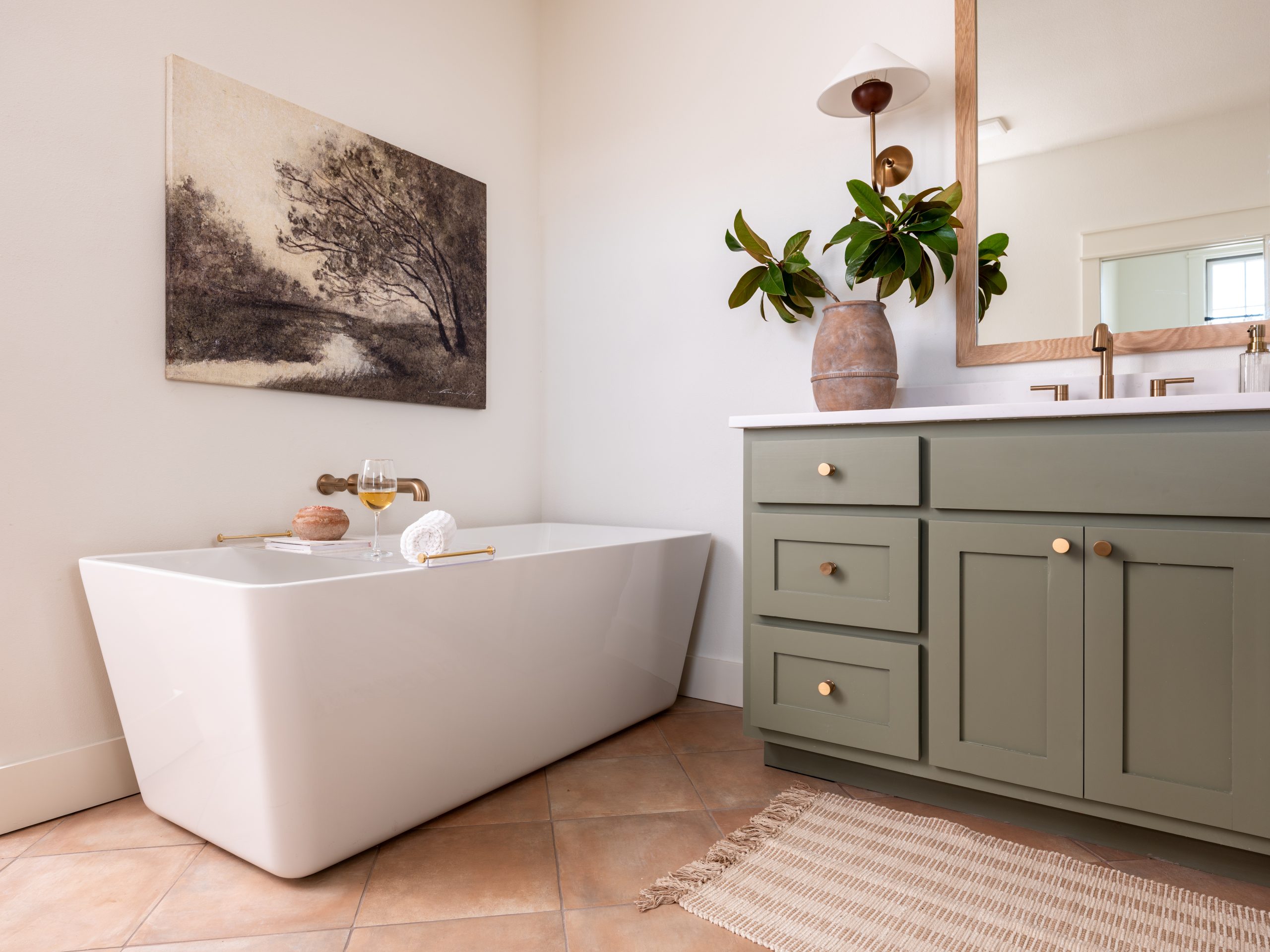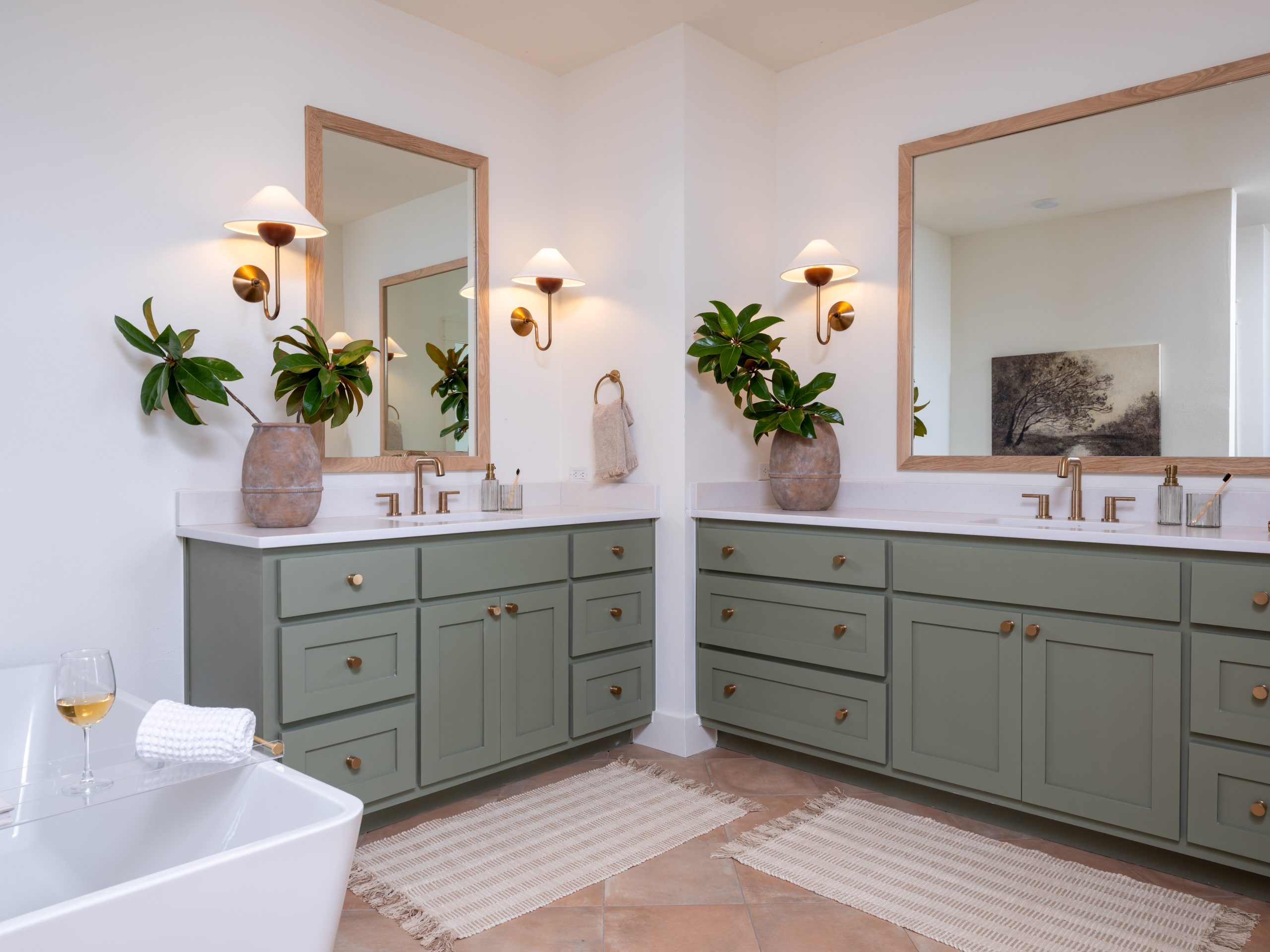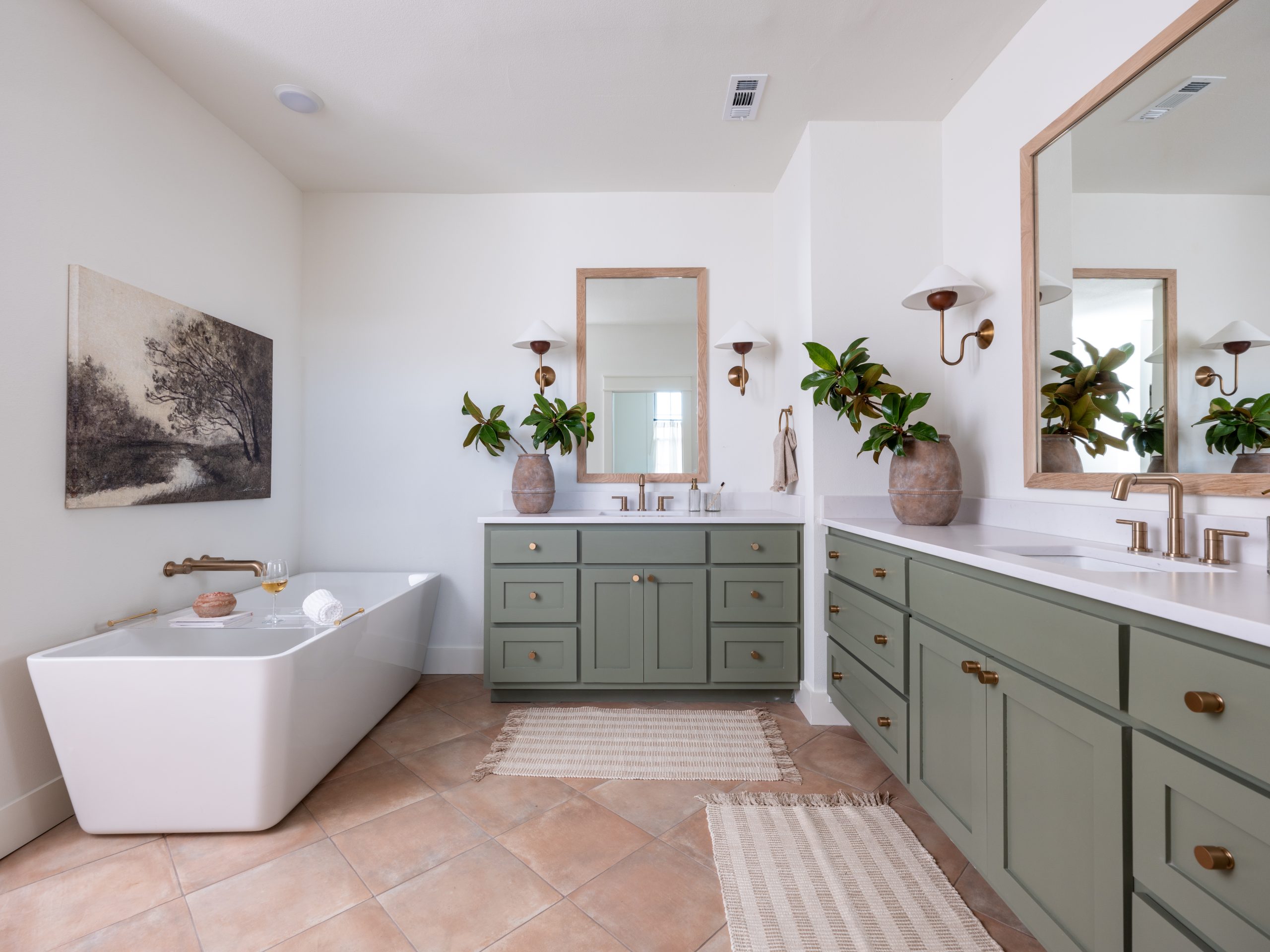 n the main bathroom, we continued the earthy green tones and mixed them with warm materials. Handmade Moroccan tile in the shower pairs beautifully with the terracotta tile on the floor. A luxurious tub, two vanities, and gold details give this space a relaxed, spa-like feel.