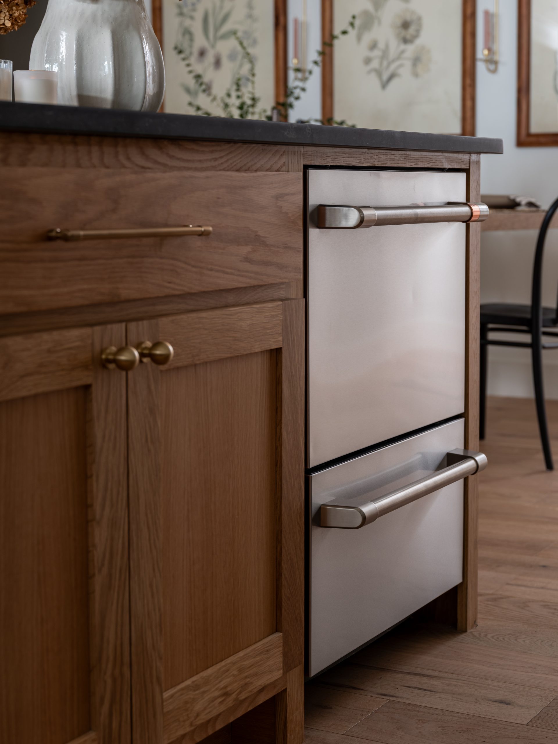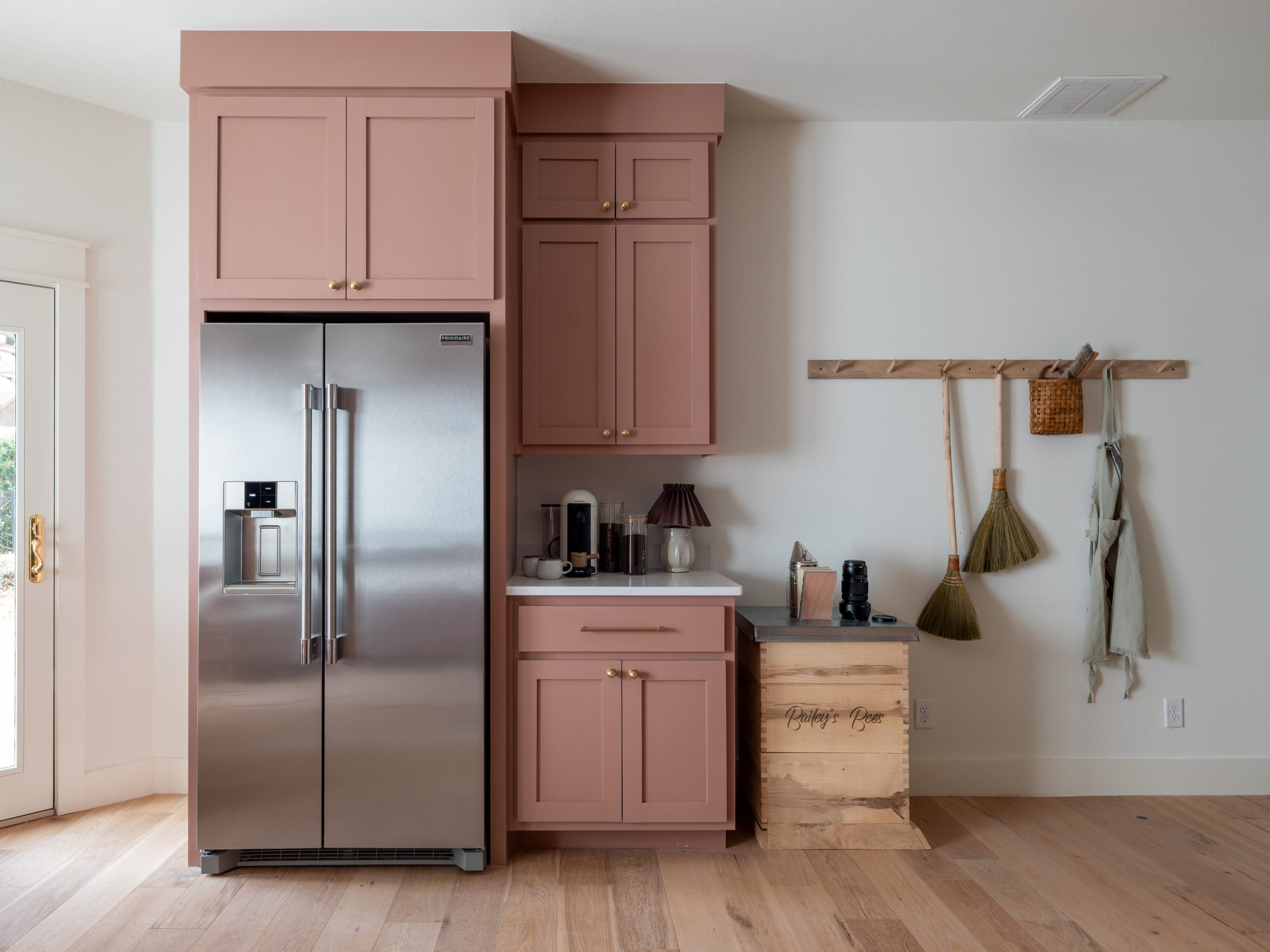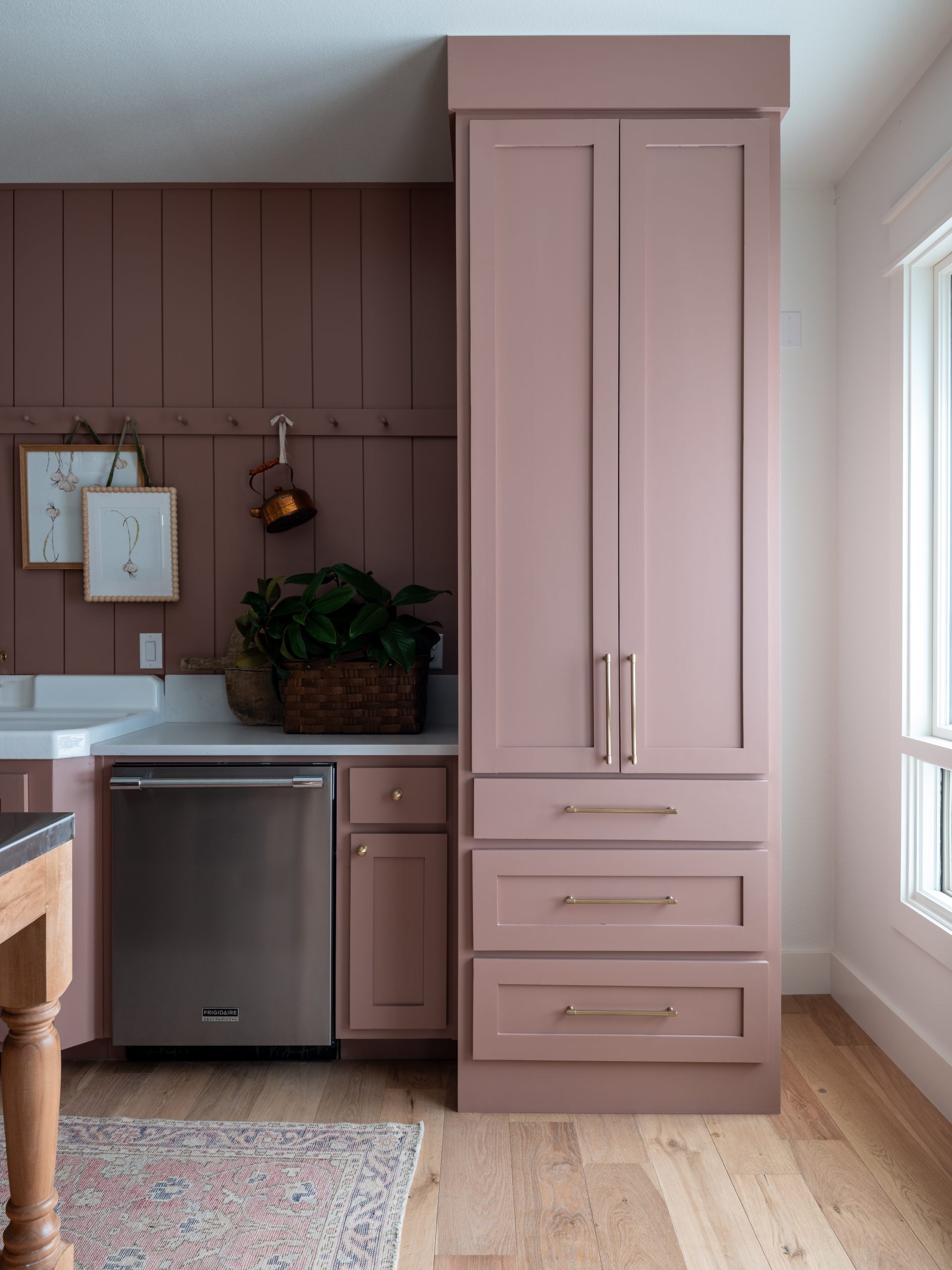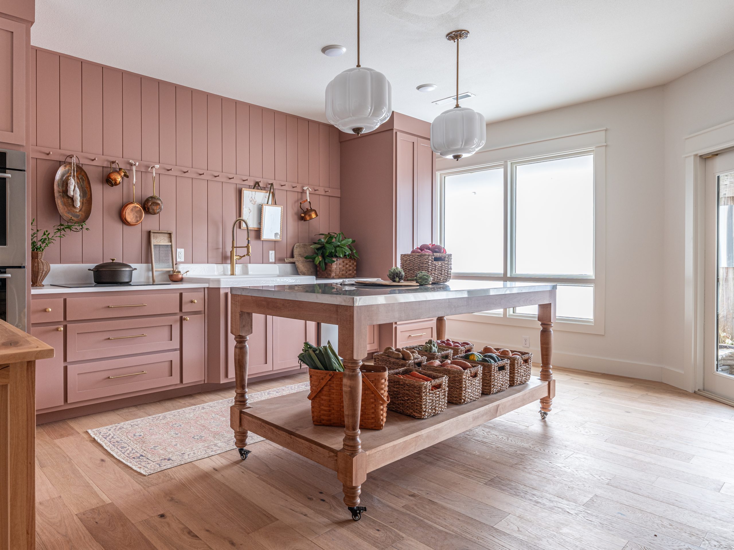 We gave Angie plenty of flexibility with a stainless steel island on wheels that can be moved around as needed. The freeze dryer blends seamlessly into the space, hidden behind a cabinet door. I chose a rose color for the cabinets to give the room a warm, earthy feel.