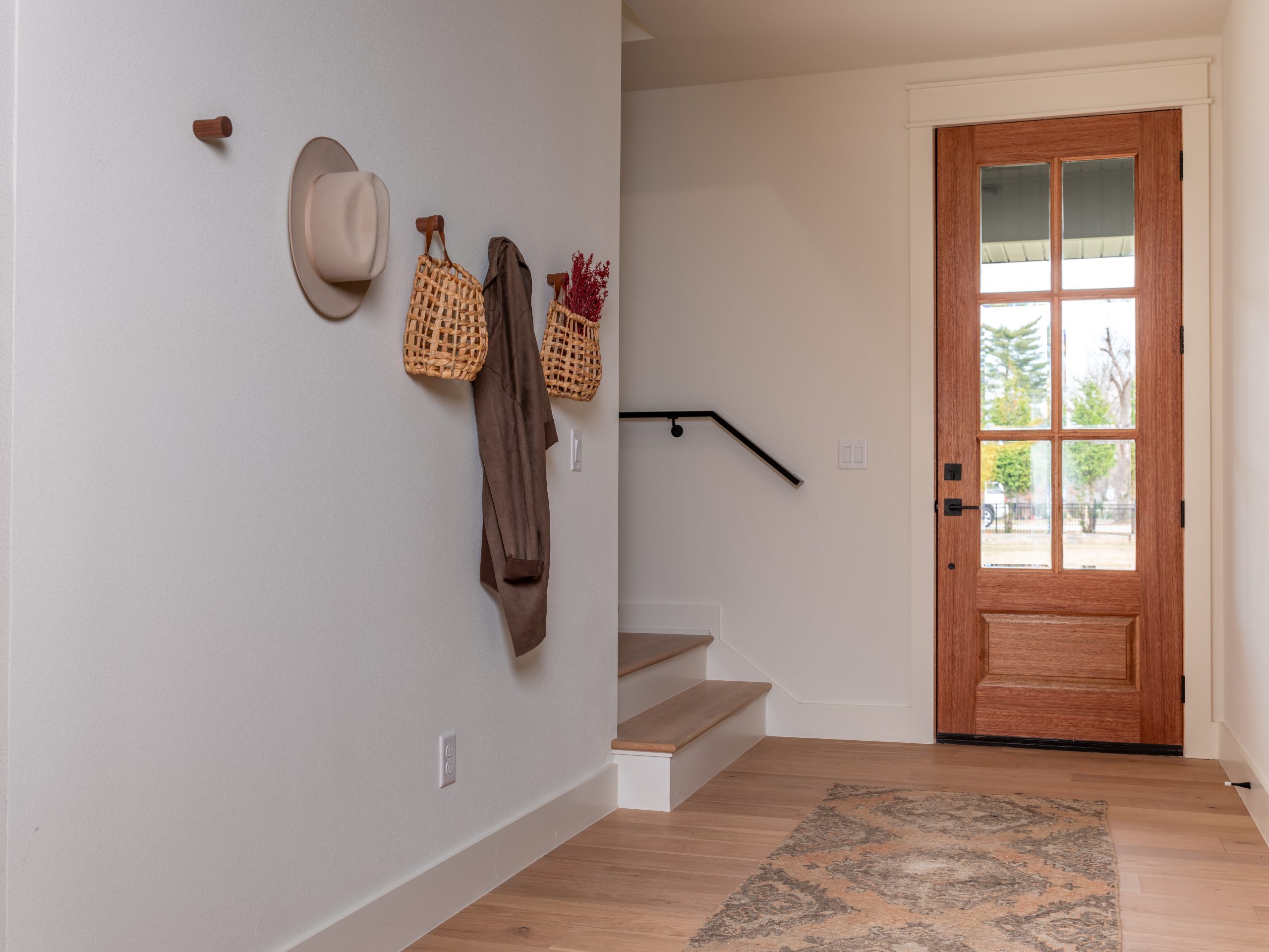 We relocated the staircase to begin at the front door and pivot around a corner, which allowed us to close up the high ceiling above. This change gave the second floor additional square footage to work with when its renovation happens down the road.