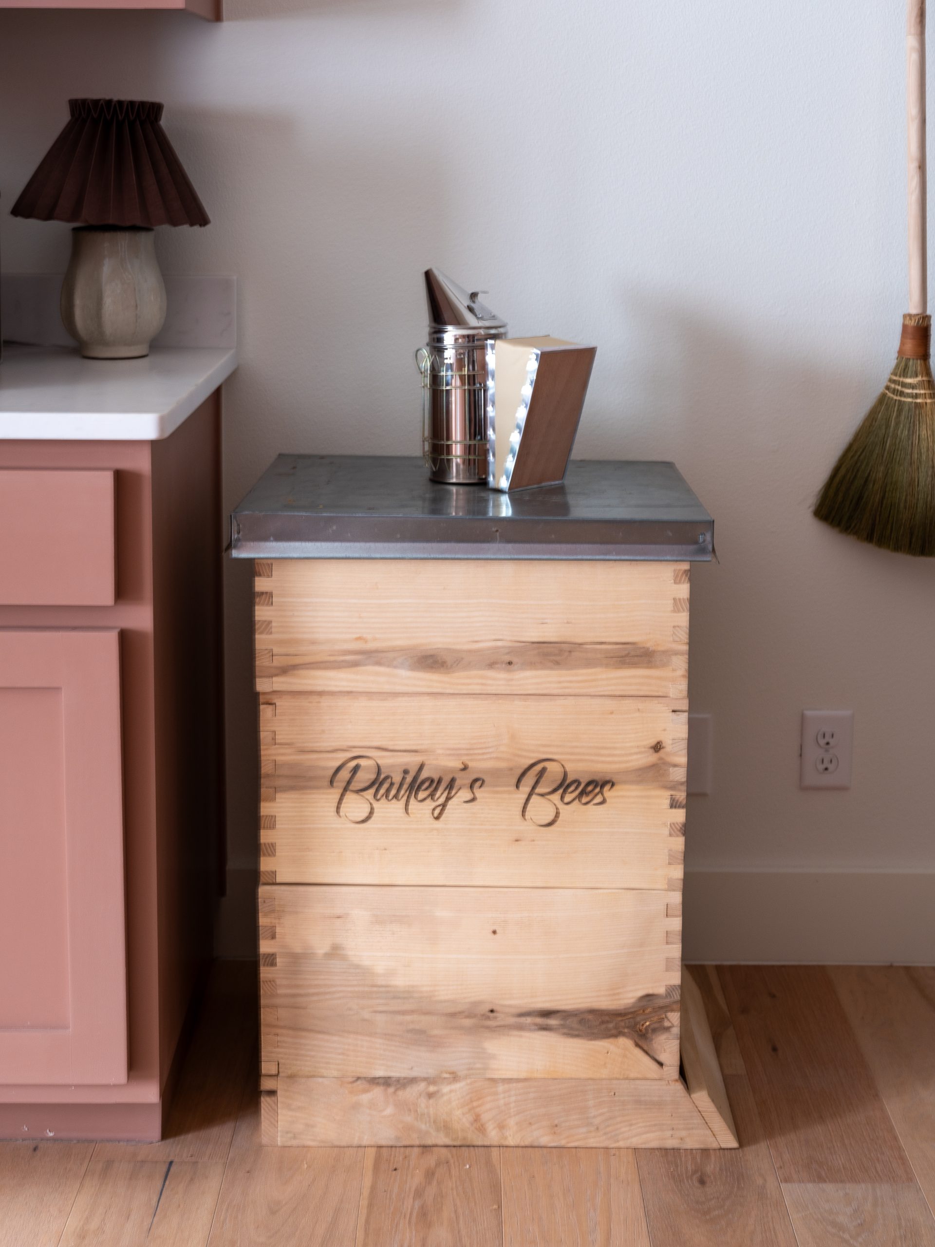 Dave also built a new canning cabinet that looks like an antique, and in honor of Angie and Dale’s garlic farm, I asked our friend Kelly to create an original garlic-themed wallpaper. We added it to the back of the canning cabinet as a special, personal touch. Dave also made a wooden bee box for the Baileys as a special project, which we tucked into the scullery for now until the weather warms up and it can be moved outside.