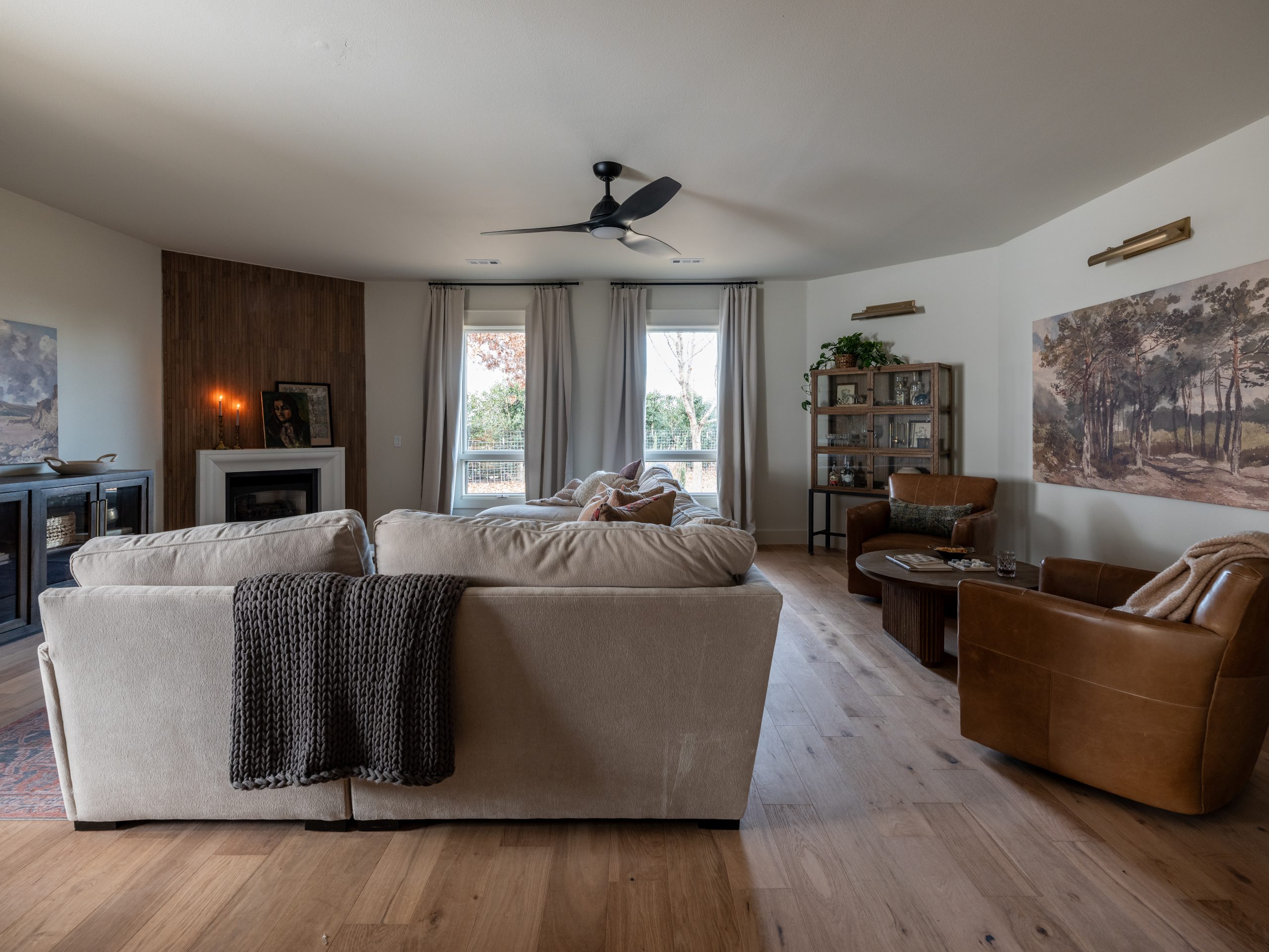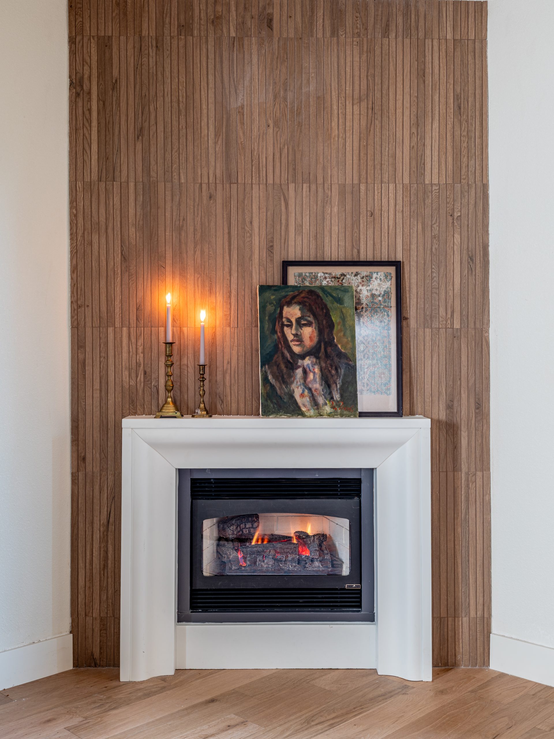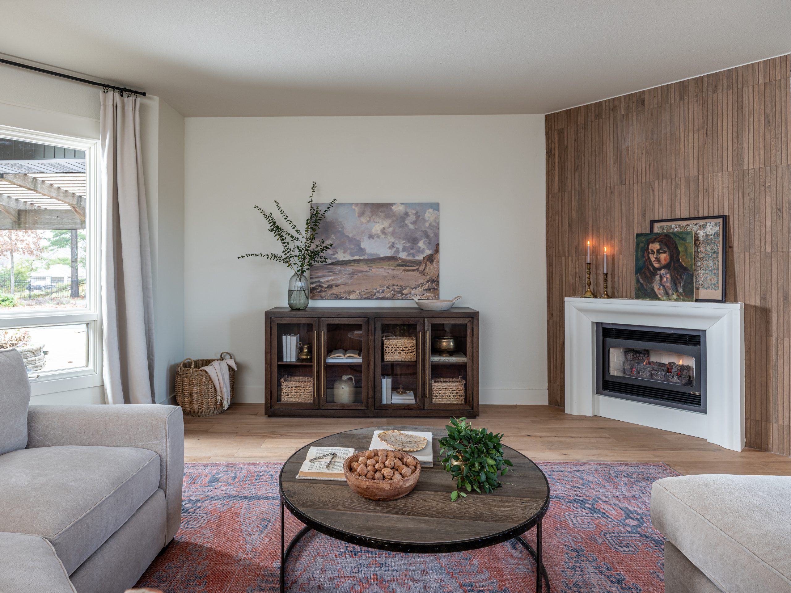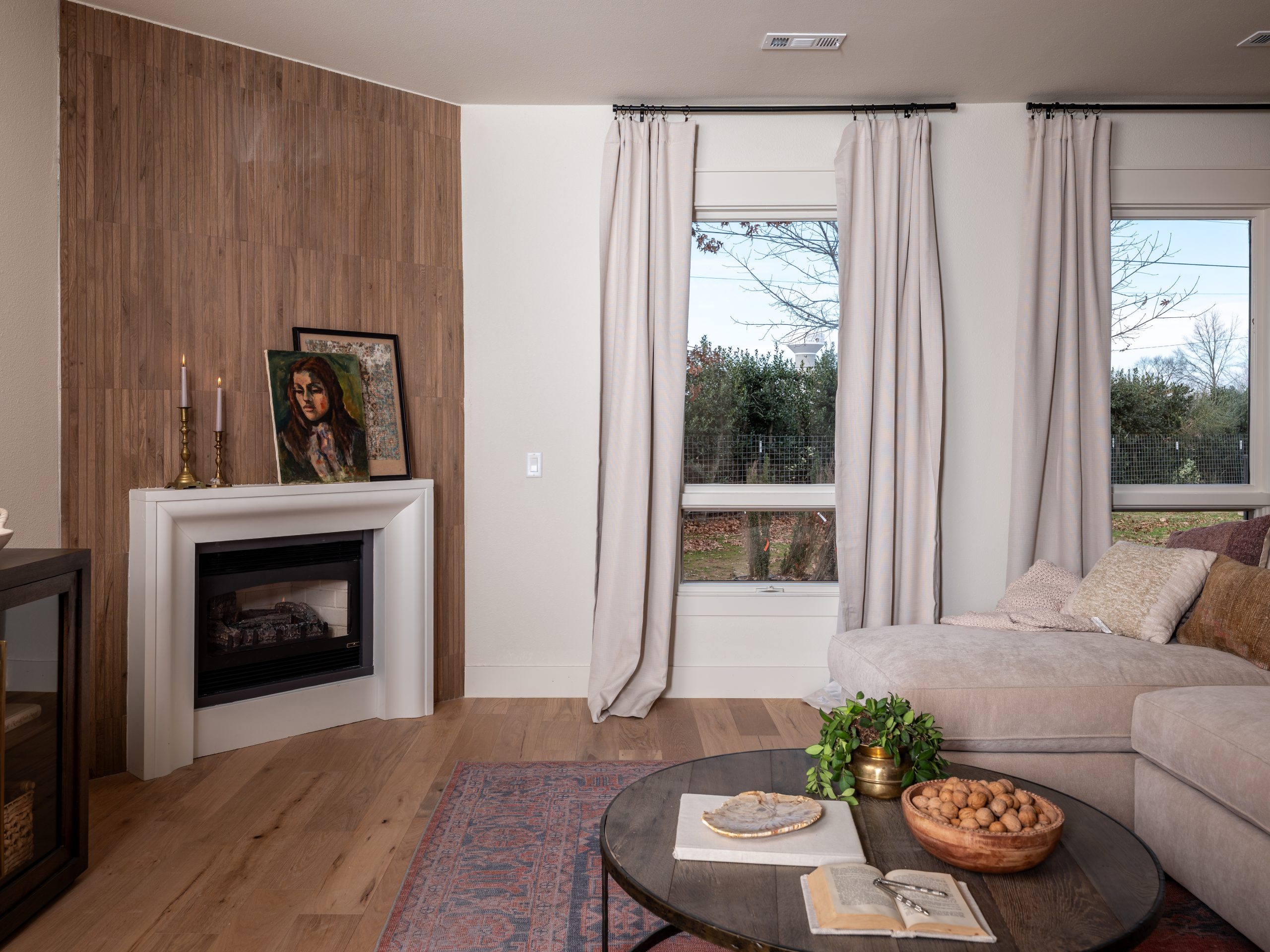 To create a strong focal point, we added a wood replica tile across the entire fireplace wall. The result is a living room that feels warmer, more functional, and finally easy to gather in.