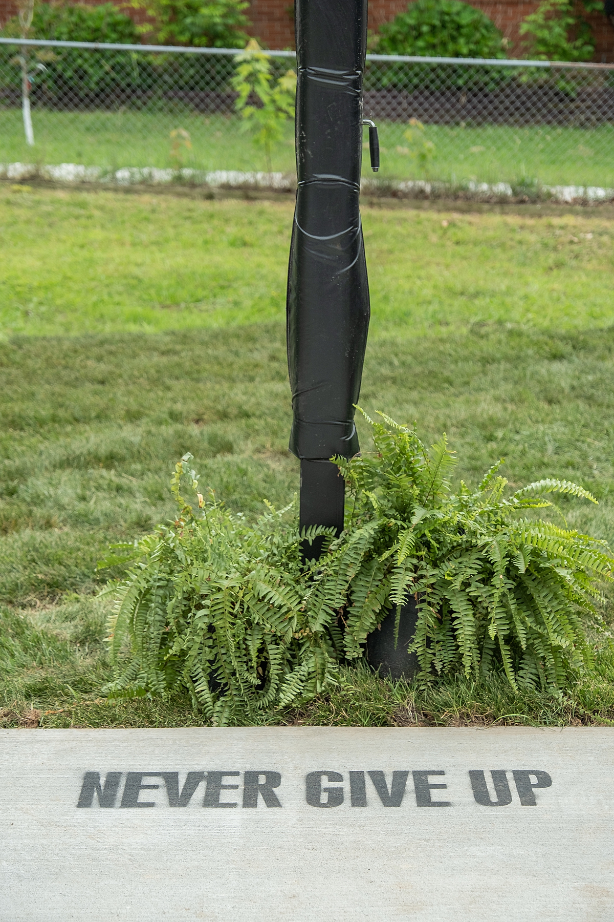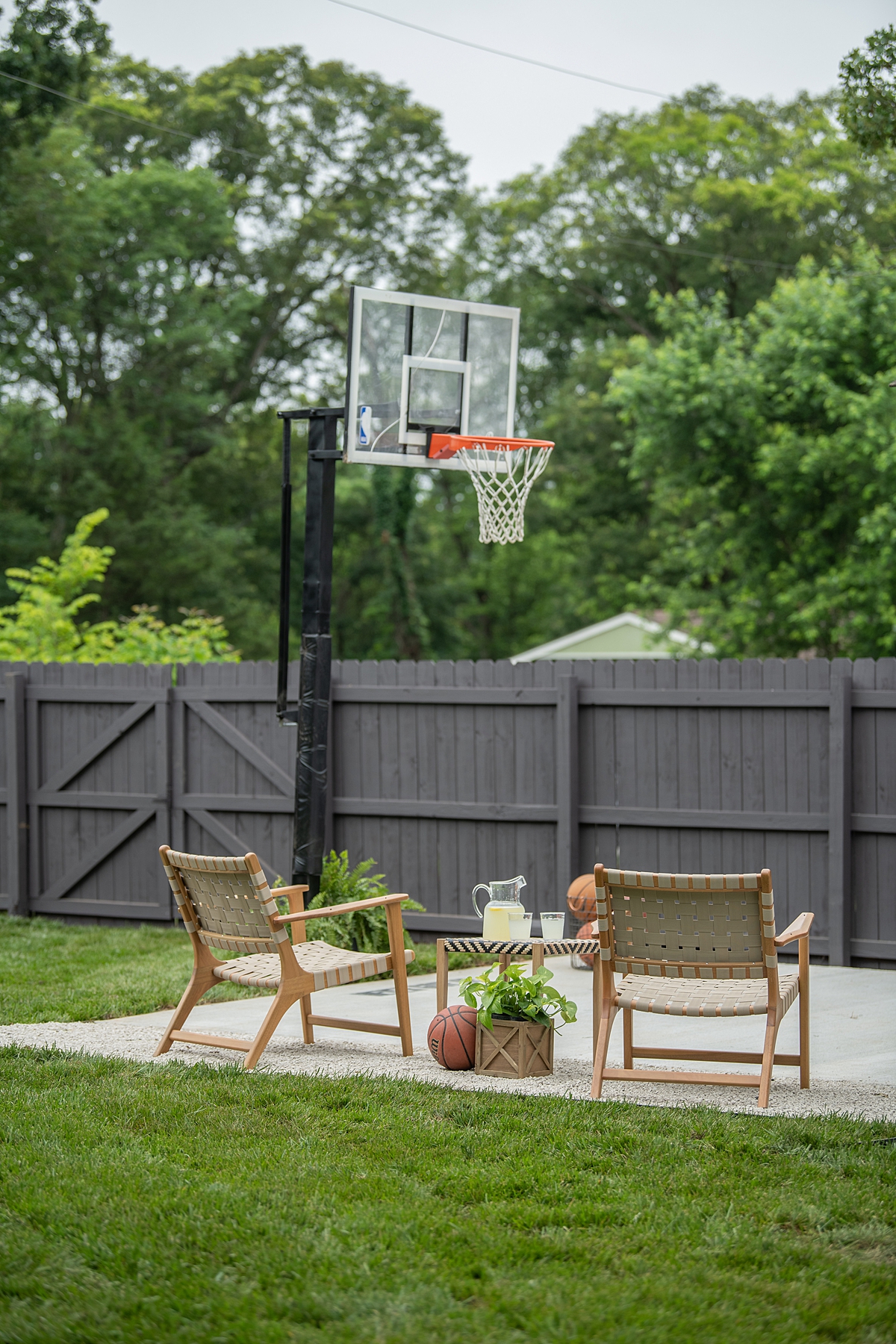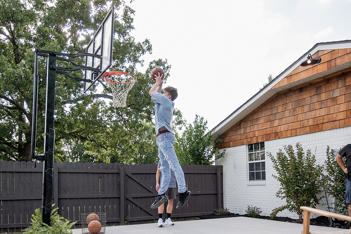 We had one more surprise to show Kimberley with this reveal. Her sons, who have no other place but the street to shoot baskets, are also wading through their teenage years without their dad, whose consistent message to them was to “never give up.” So we made a new basketball court for the boys and added that message right under the goal.