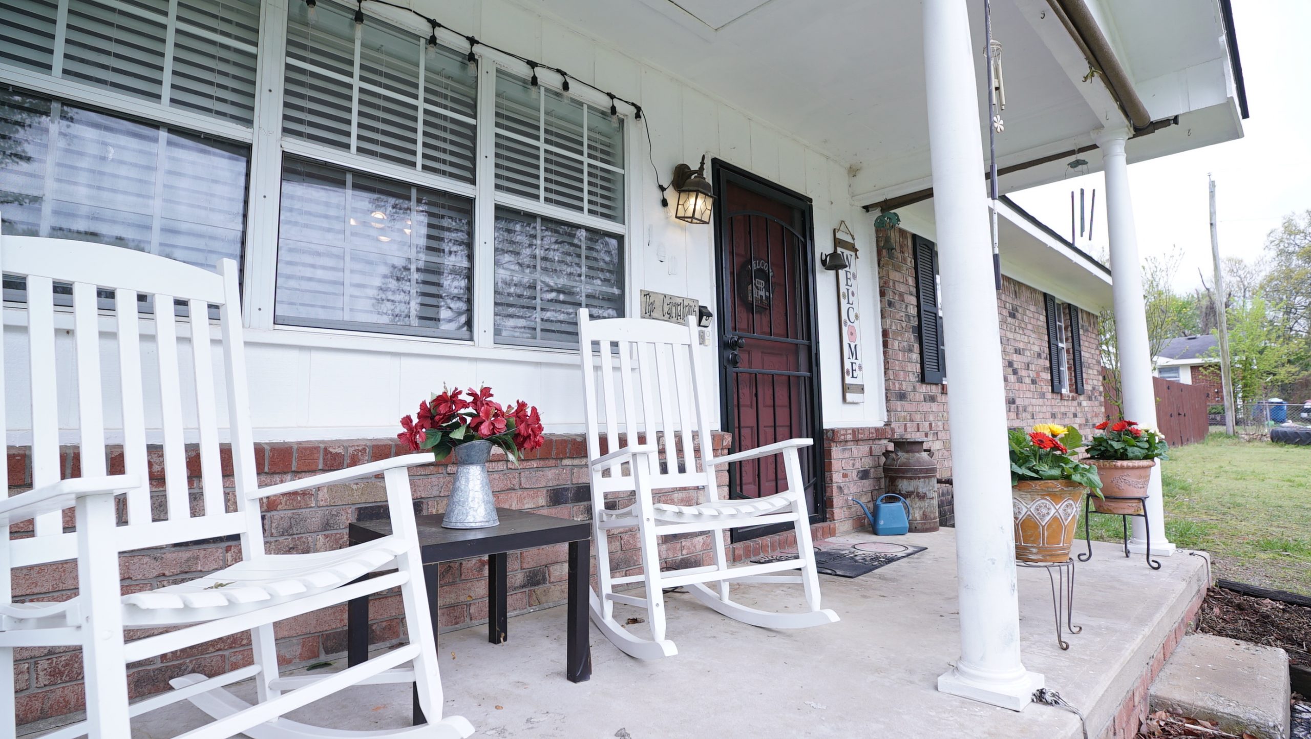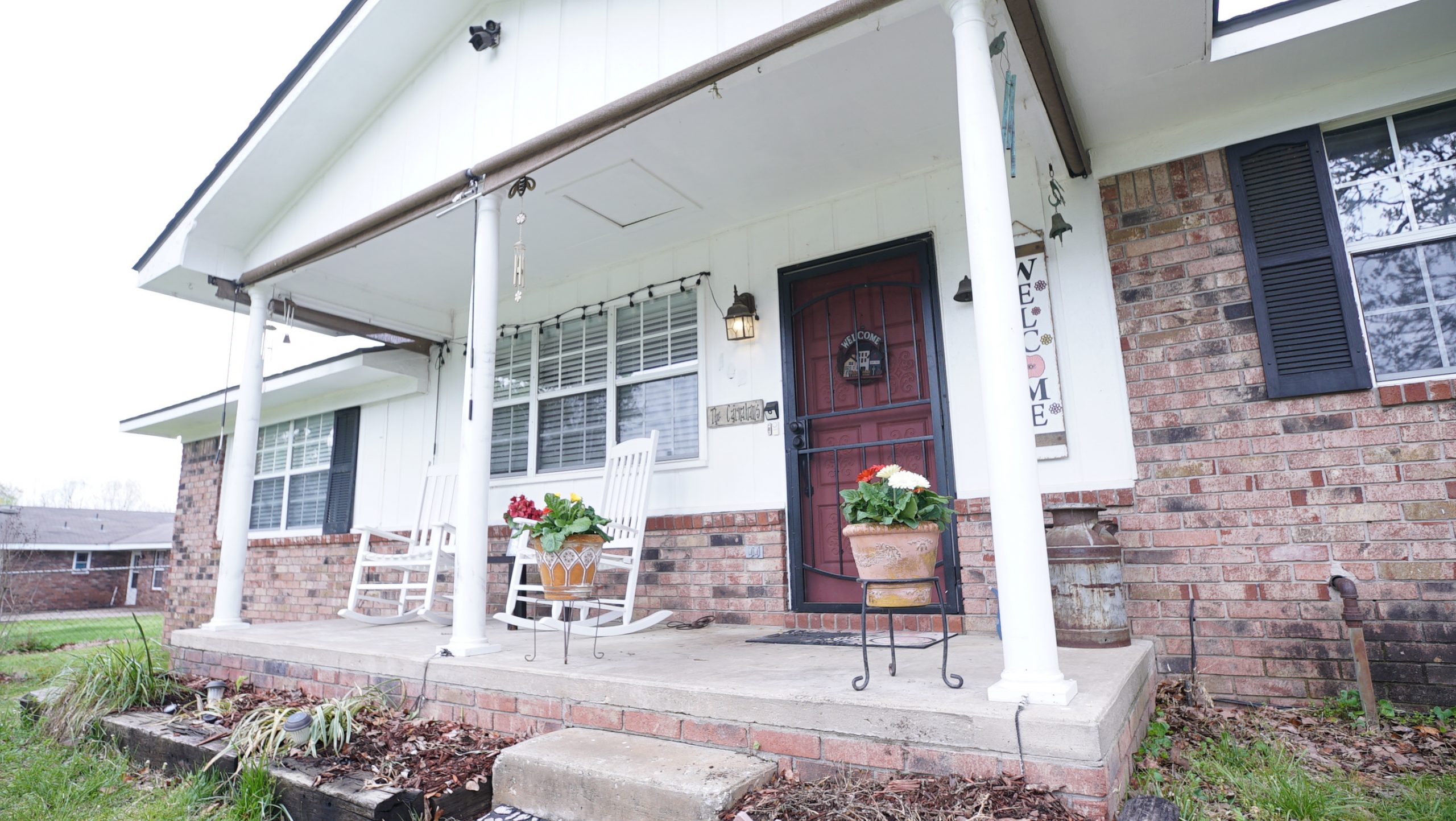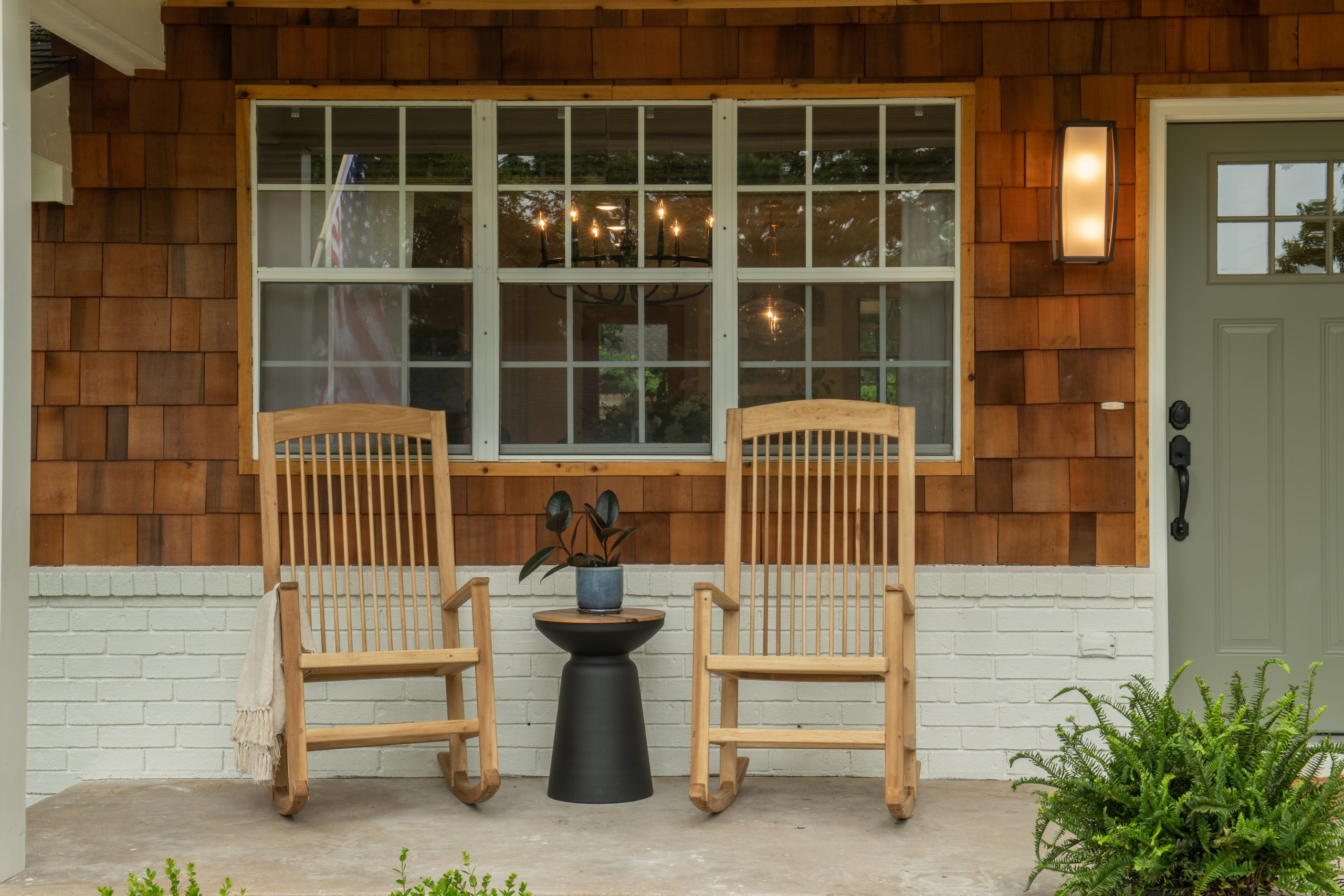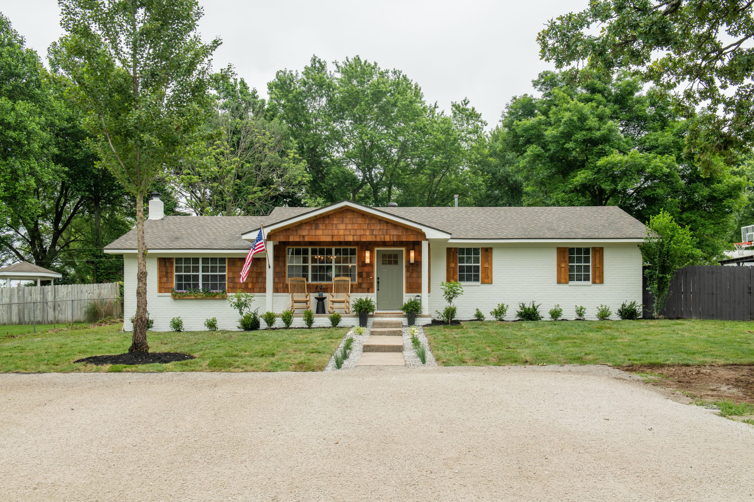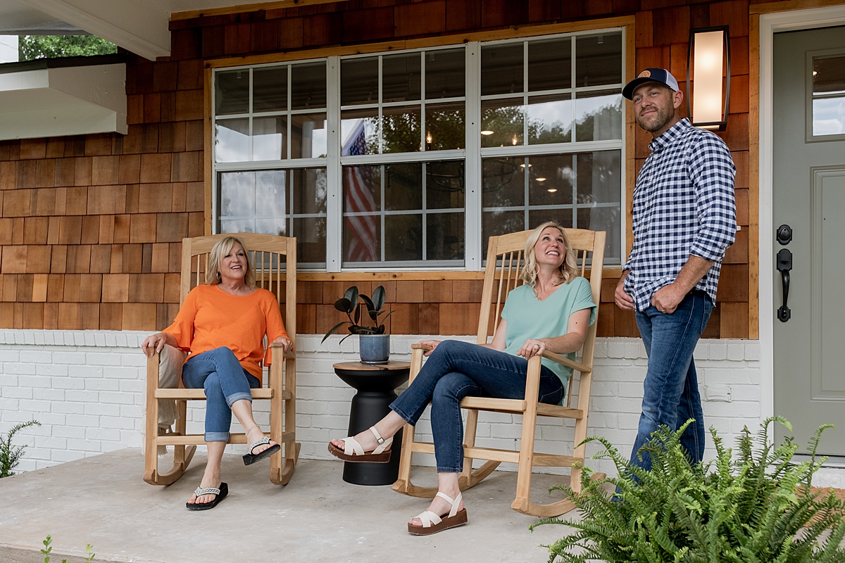 For other improvements here, we took inspiration from a conversation we had with Kimberley. She told us that one night, Darren had a dream that the two of them were sitting in rocking chairs on their front porch, watching their children play. This was before they moved to Arkansas and before their home had a front porch. To honor this dream, we created handmade rocking chairs for her to enjoy in this new life. Dave crafted two chairs with cane seating and a natural finish. The chairs, new exterior features, and refreshed landscaping gave the home a warm and charming appearance.