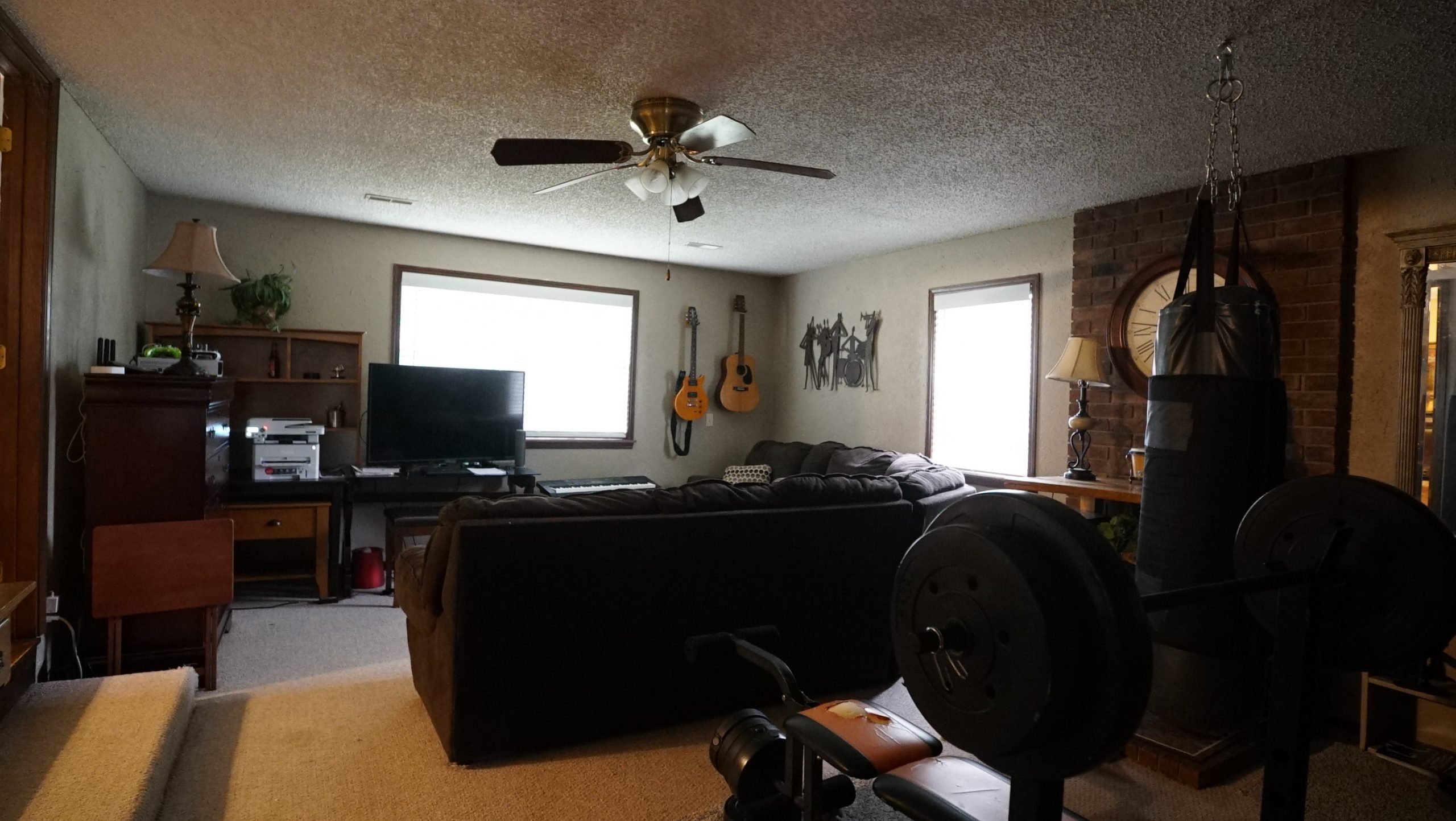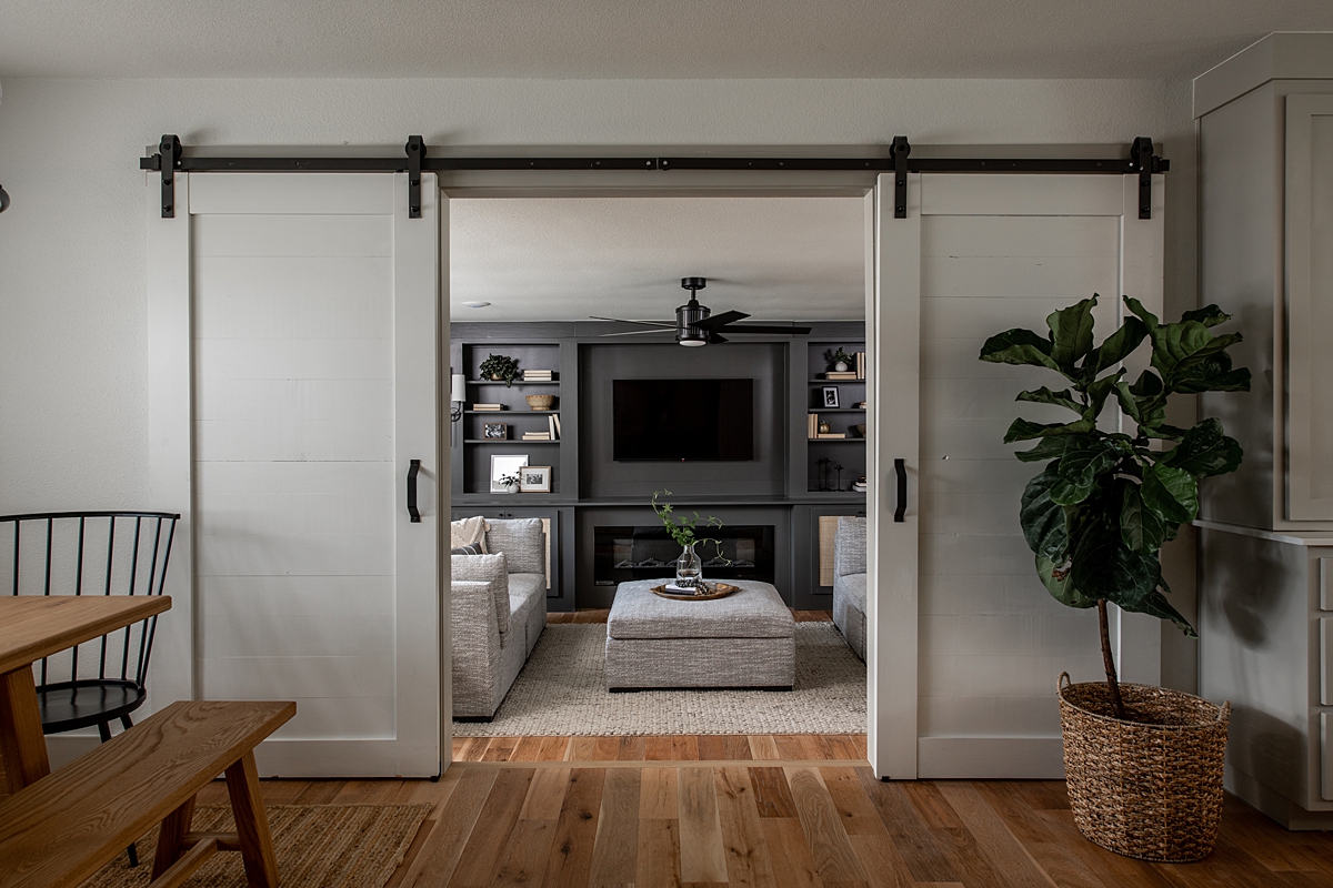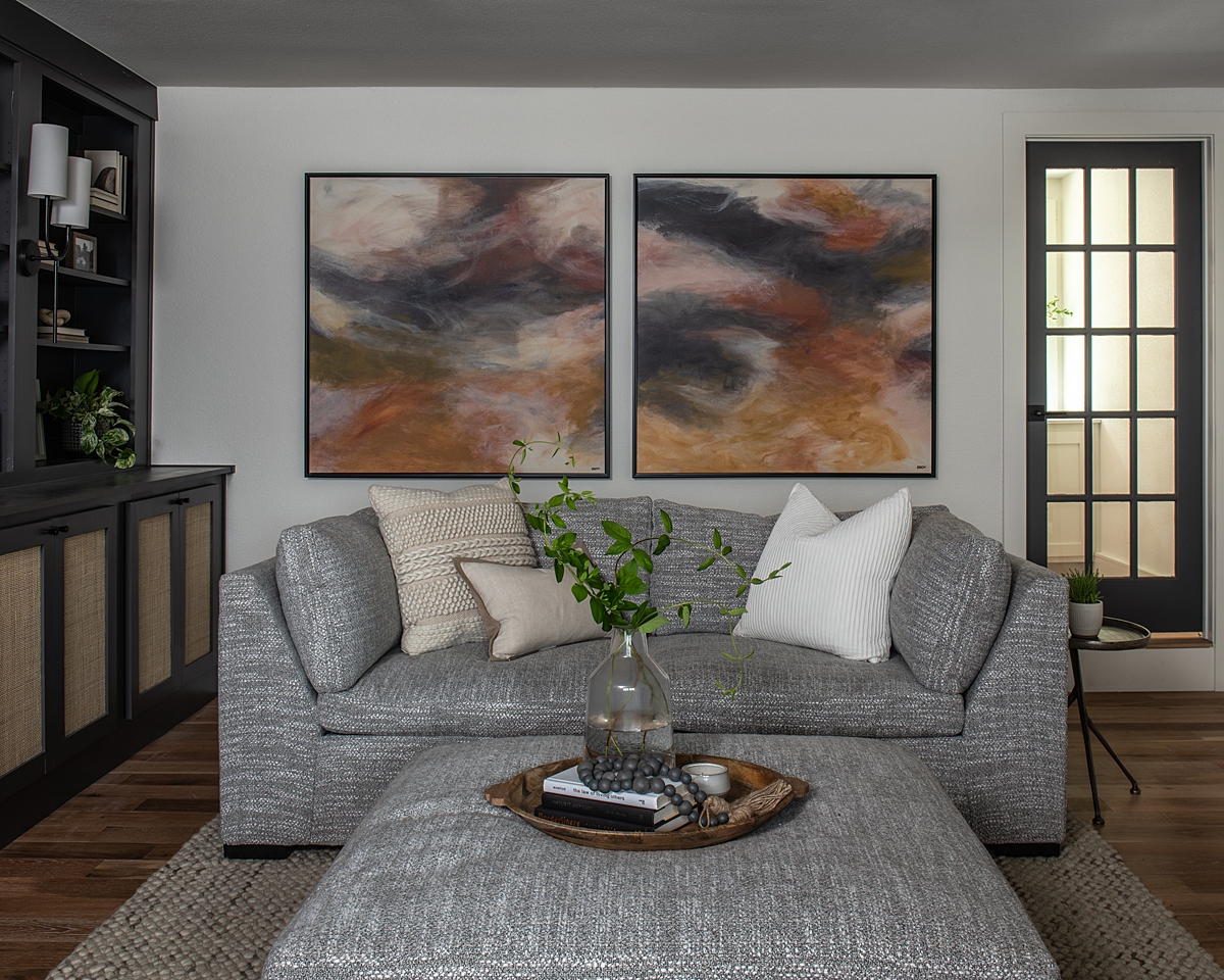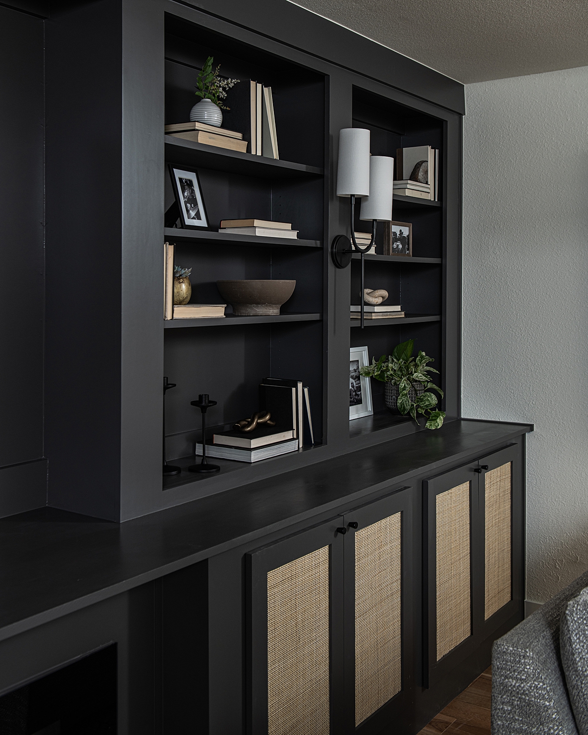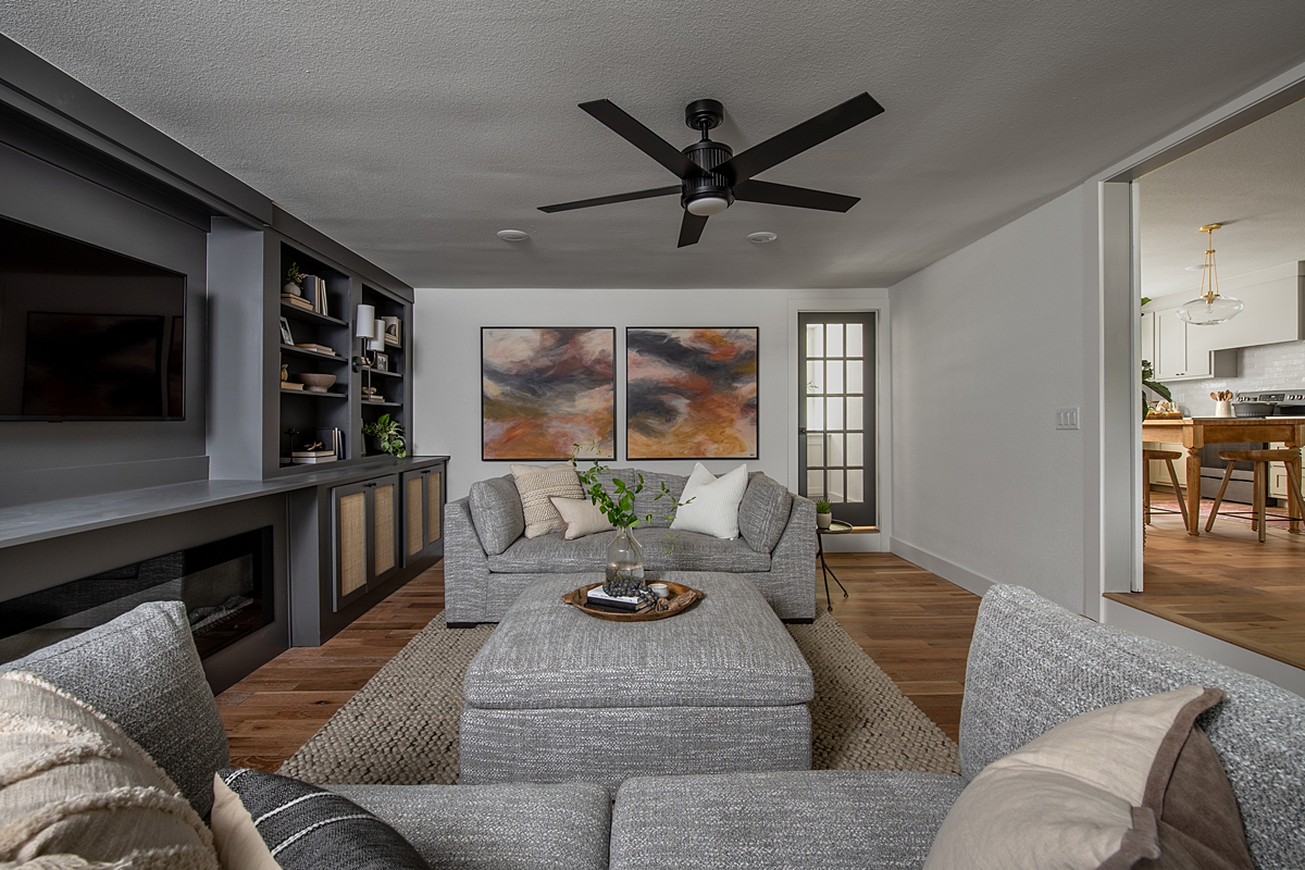 The family has many memories with Darren of spending time together as a family singing karaoke, and I wanted this space to be cozy and inviting as their new hangout spot. We replaced their old fireplace with an electric insert efficient enough to heat the whole room. With music on our minds, we added built-in entertainment walls on both sides of the fireplace, complete with compartments to house a karaoke system. We painted the structure a dark charcoal color and watched it become the focal point of the room.