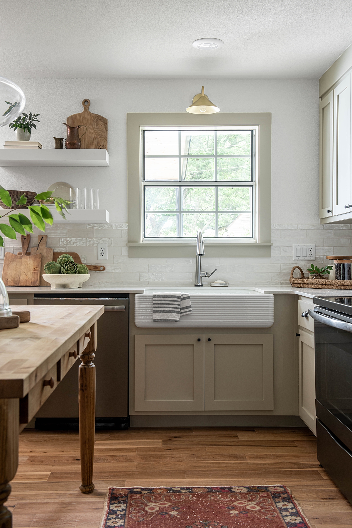 For the Carnahan’s kitchen, I wanted the space to be soft and warm and reminiscent of a countryside kitchen. I chose to paint the new cabinetry, as well as the trim, in a warm taupe to soften the entire space. A large, apron-front sink and a quintessential Dutch door leads from the kitchen to the backyard, securing the kitchen area as a quaint cottage space. I had a custom wall of built-in pantry cabinets created to maximize storage in the kitchen while enhancing the overall design – beautiful and functional!