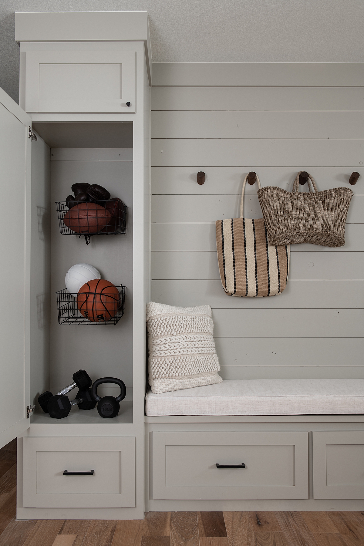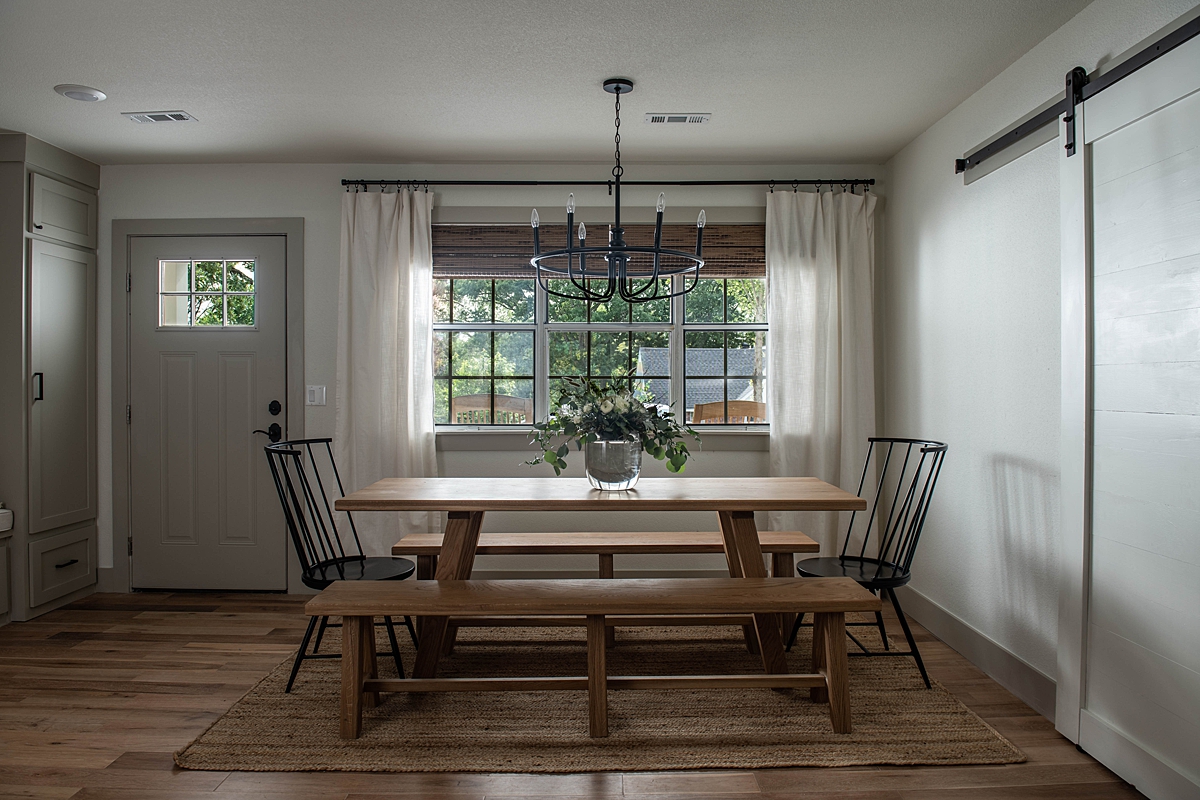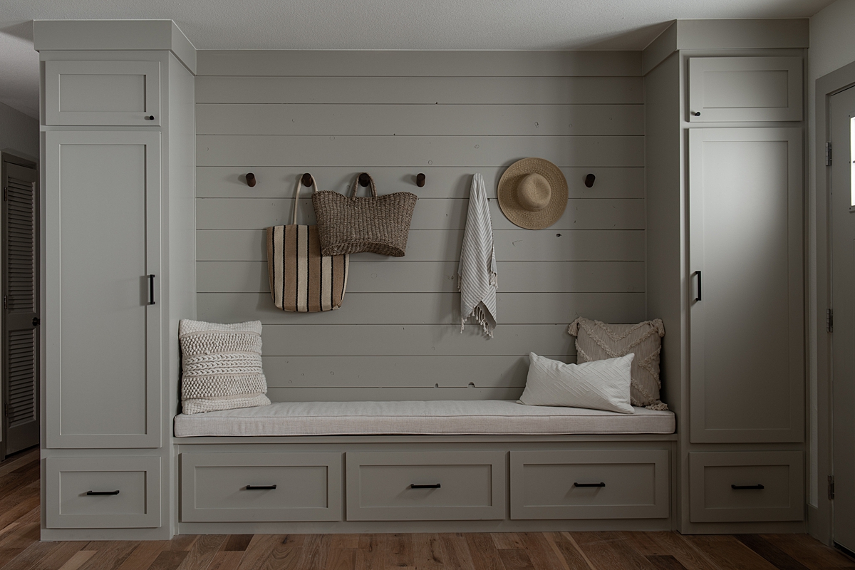 Kimberley wanted space here for her family to sit and eat and gather for relaxation and play. She also requested storage for coats and sports equipment. To make this entry work for her family, we turned this space into a dining area and a drop-zone for all the stuff she and her family needed to set down and store when they walked into the house. With wood paneling for texture, hanging storage, and a cozy bench, we turned this into an inviting, spacious, and functional entry space.