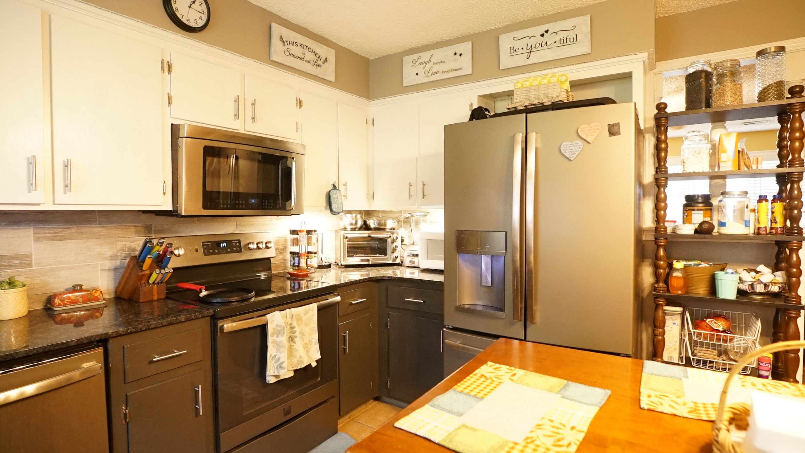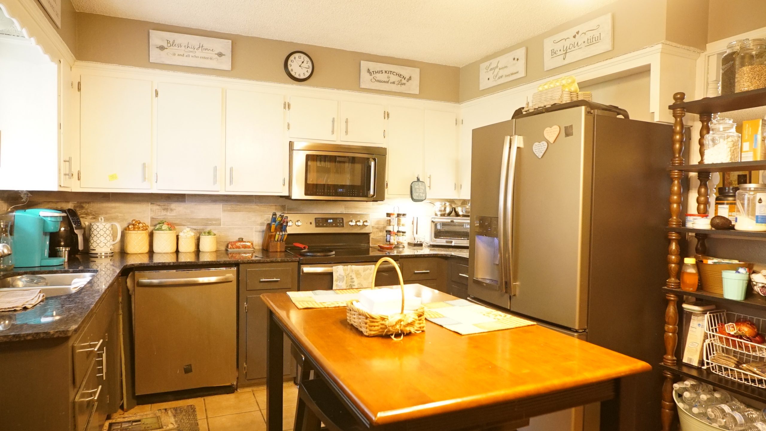 The handmade light fixtures add warmth and character to the kitchen while the big, butcher block island Dave built looks like a beautiful old piece of furniture. We had the island engraved with song lyrics Darren often sang to Kimberley, “You are always on my mind” because we knew this is a space where she feels especially close to him.