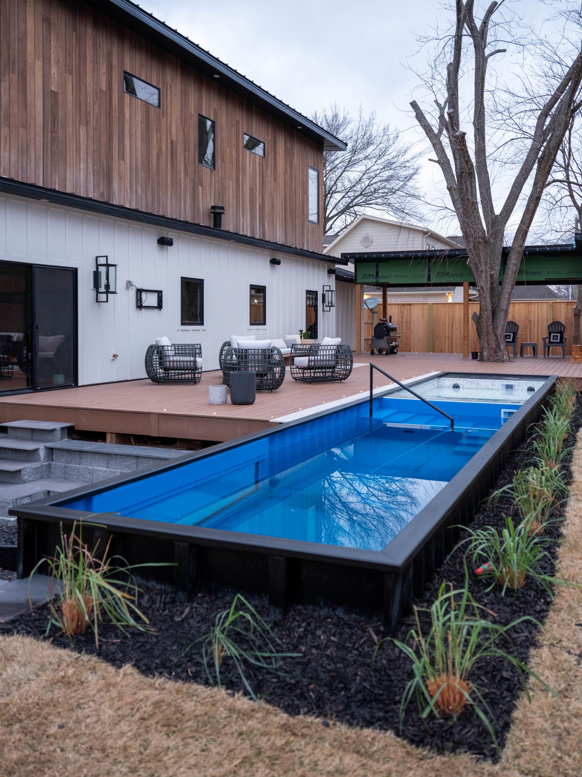 When Dave and I first got a glimpse of the yard, we immediately agreed this was the most hideous yard we had ever seen. Ha! After clearing out all the tree parts and mud, Dave was able to salvage a lot of the wood, which he used to build a bench for the backyard and the surfboard we put in the game room. We had a container pool delivered and built a moisture shield composite deck all around. New patio furniture and a coffee table made by our concrete artisan friend, Jason, complete the backyard as an outdoor entertaining space.