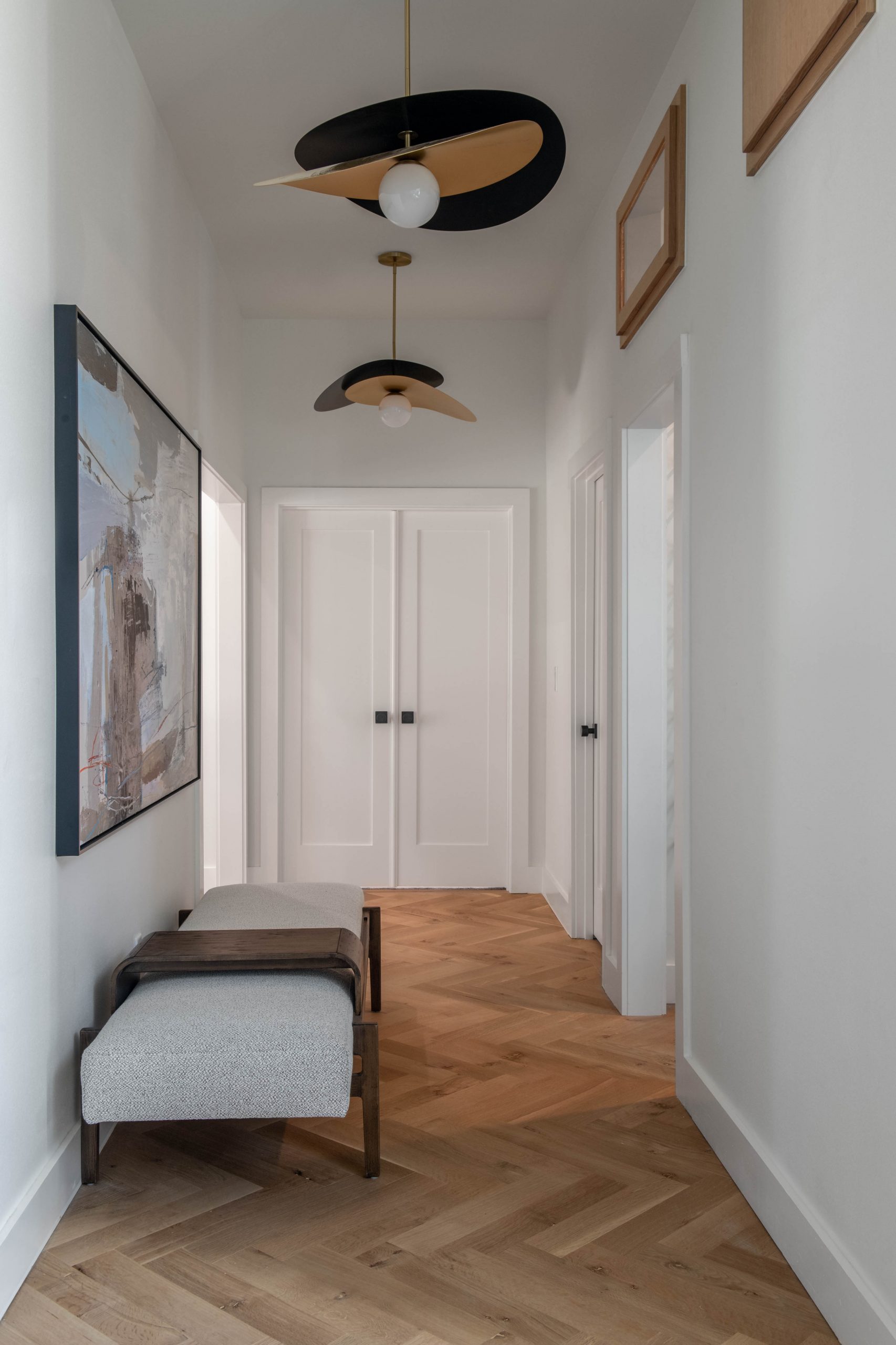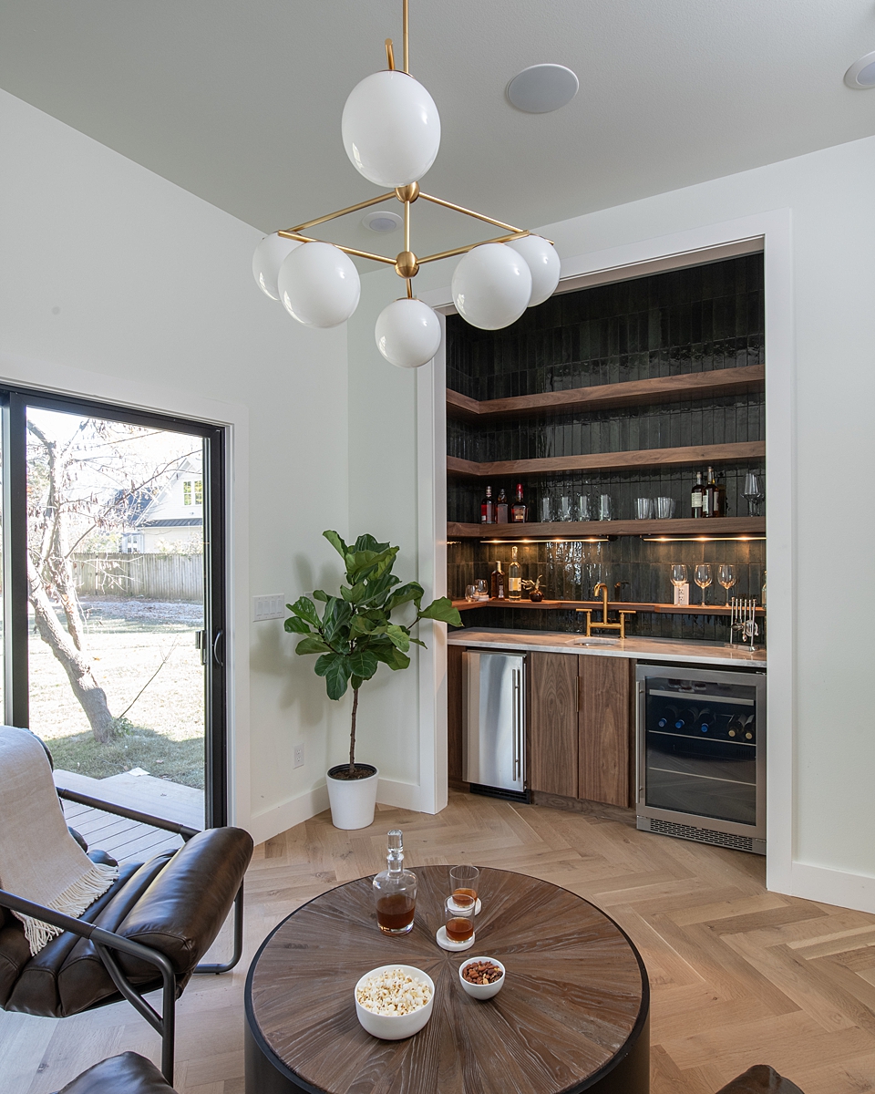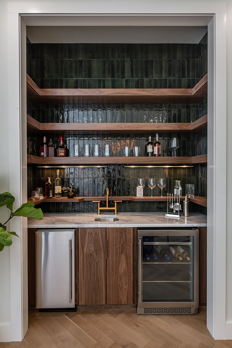 A little peek into another space we weren’t able to share on the episode (for time’s sake) is Rob and Angie’s new office / entertaining bar. I love the deep hue of this tile and the way the entire space feels like I’m stepping into an episode of “Mad Men.” It’s a very cool spot! It’s also at the end of my favorite hallway in the house – featuring two of my favorite pendant lights! I love how these lights look like a work of art and draw your eye down the hall.