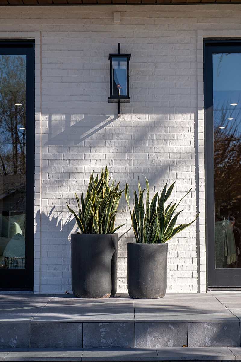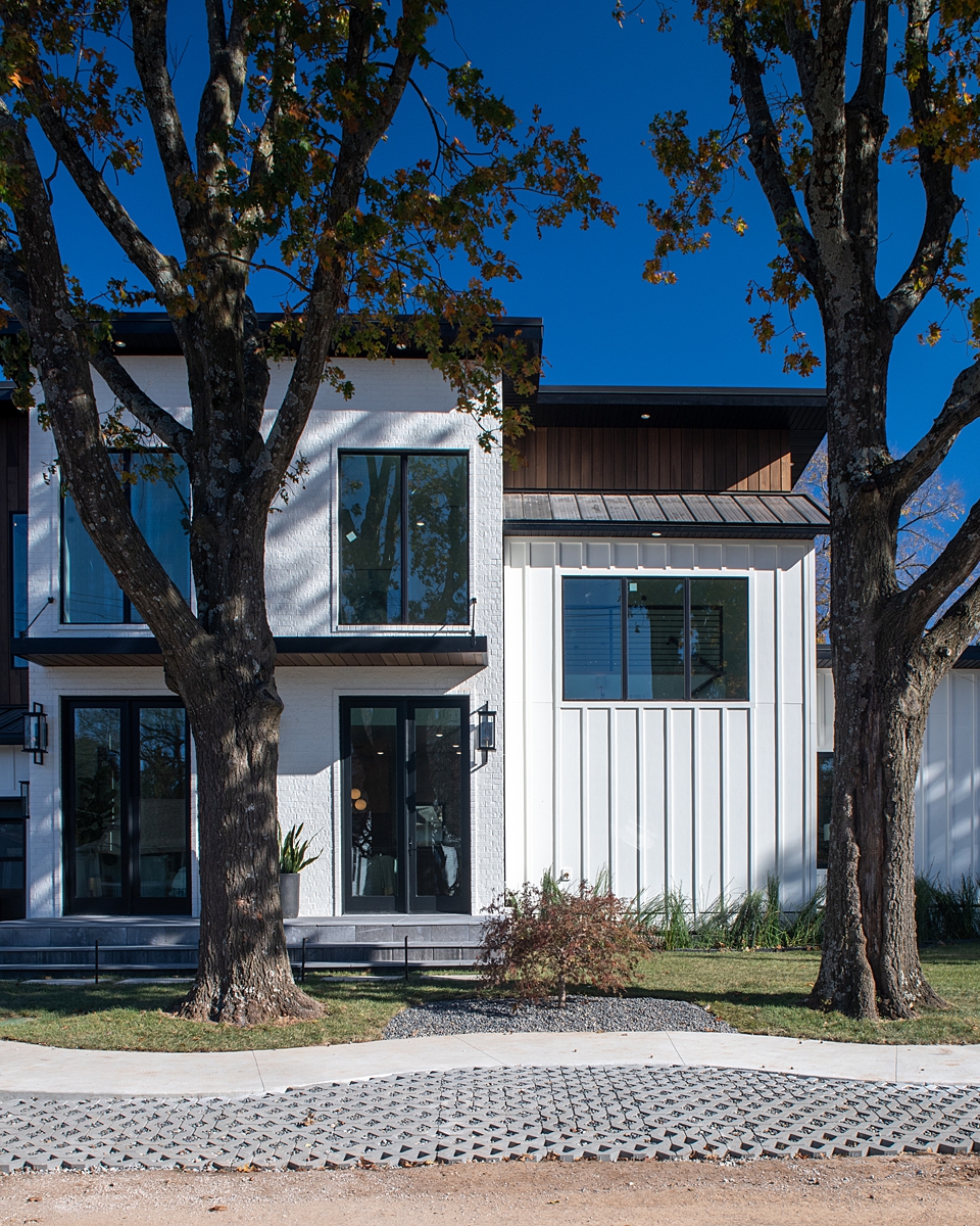 Angie and Rob wanted a house that is modern inside and out. I knew we needed to add texture in order to create a well-balanced exterior. So, we added a combination of brick, poplar wood paneling and board and batten siding all around the exterior of the house. The metal roof finishes off the modern exterior design, and the herringbone pavers on the driveway pair nicely with the herringbone wooden floor we installed throughout the interior of the house. I also LOVE the modern gas lanterns and was so excited to get these on the house! Overall, this home is modern but it’s not stark. The natural elements we incorporated help to add warmth and beauty.