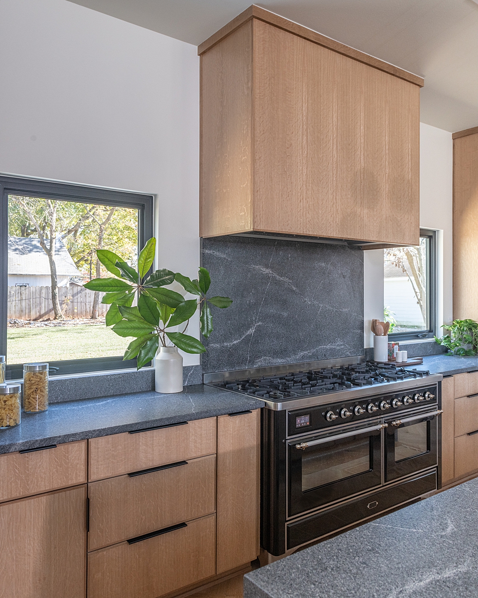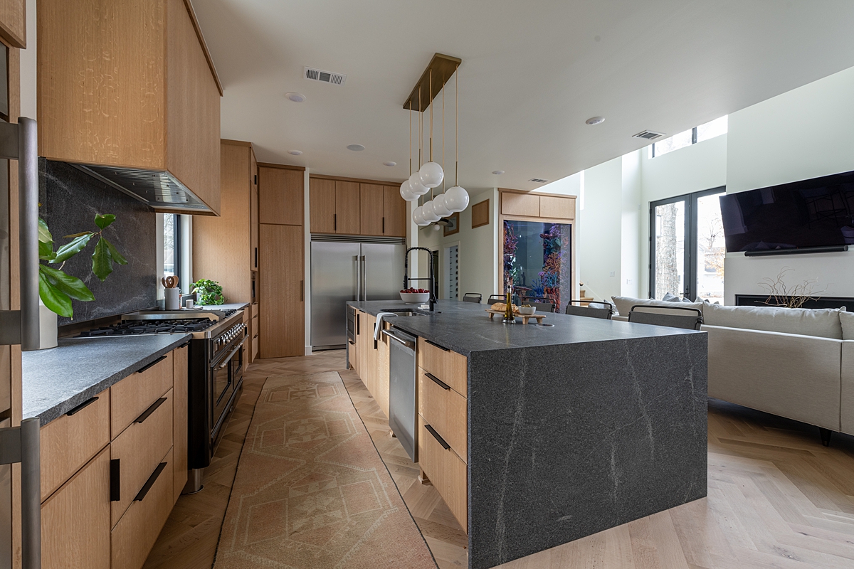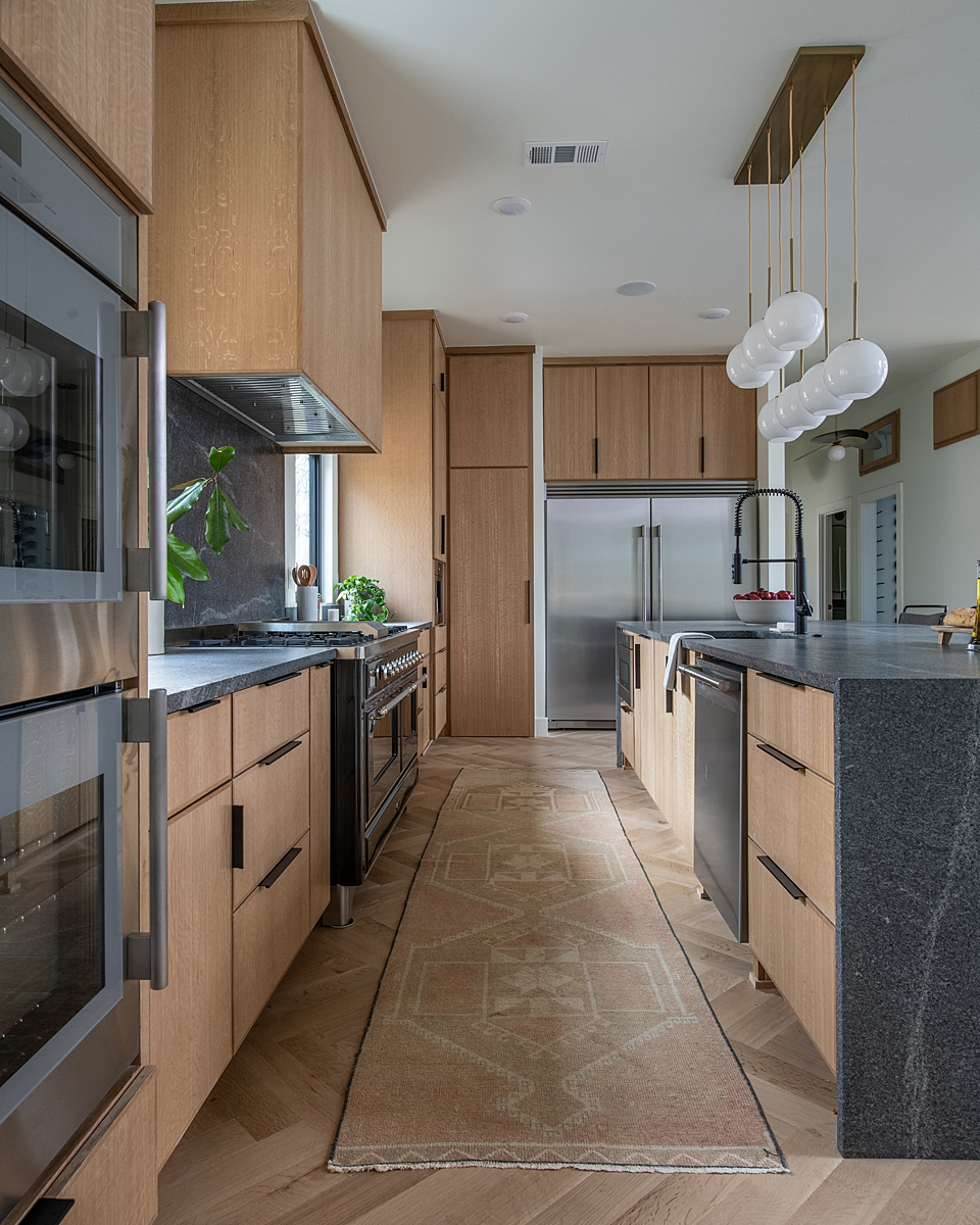As a professional chef, Rob needed a proper chef’s kitchen, and the open concept was a must for entertaining. Rob and Angie also love to host Sunday Family dinners, and I’m happy to be on the receiving end! We have a big family and need a lot of space in this kitchen. We provided them with plenty of counter space for prep, lots of cabinet storage, an incredible 60″ Italian range and a total of four ovens. The quarter-sawed white oak cabinetry created the kitchen of my dreams! It’s modern, yet the natural materials help to create a warm and welcoming space.