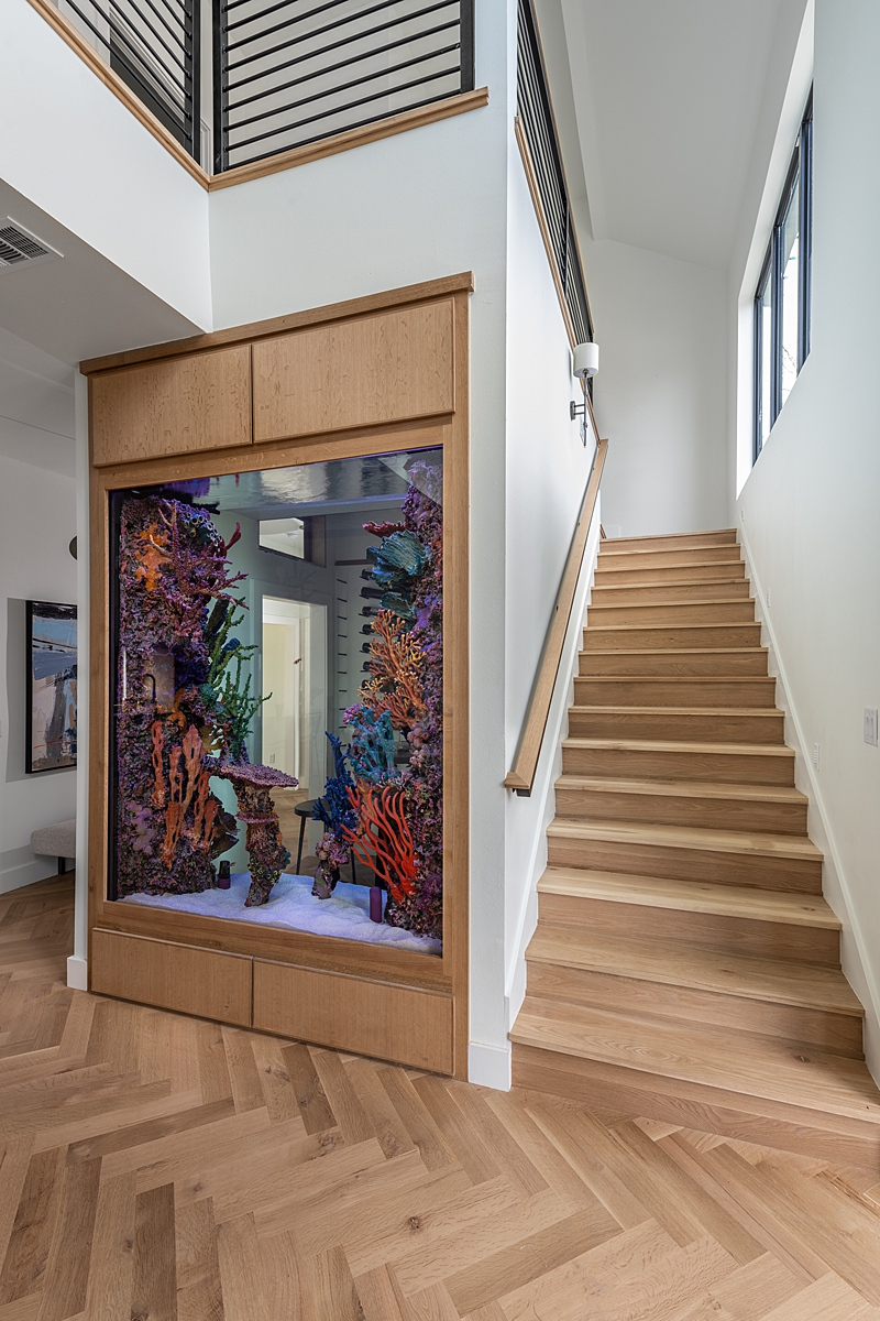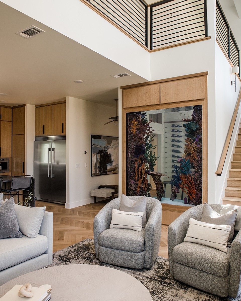 We wanted to surprise them with a dramatic entrance to the house. Rob asked for an aquarium to give a nod to their time living in Florida and in Hawaii, and we took it to the next level. This extra-large aquarium holds 1,000 gallons of salt water, houses a custom coral surround and serves as an interesting window into the wine room. For the wine room, Dave created a floor-to-ceiling wall rack with steel dowels to rest the bottles, and we added a small high-top table. Now, it’s a perfect spot to sit and view the beautiful fish while enjoying a glass of wine.