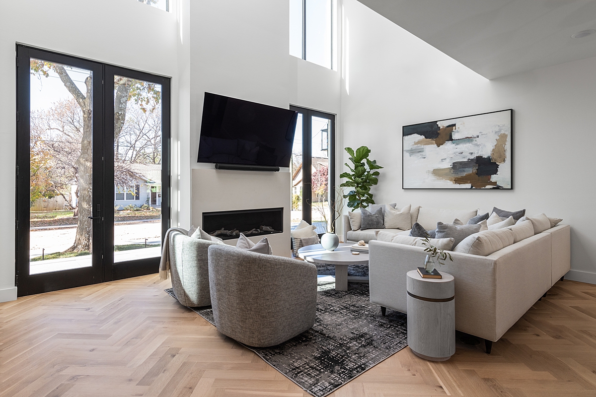 In the living room, the high ceiling and large windows let in plenty of natural light. The white paint throughout the open area adds brightness to the house, while the gas fireplace anchors the living room and keeps it feeling cozy.
