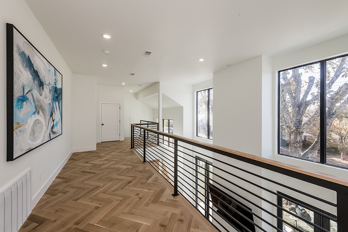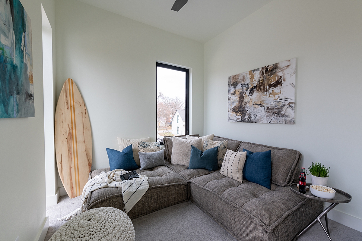 Since we added a second floor to the house, this whole area is new. The metal handrail that Dave and Matt welded is an added touch that keeps with the modern flow of the house. I’m so glad the guys didn’t drop it! The boys each have their own rooms upstairs and a Jack-and-Jill bathroom they share. I think they were really happy with the comfy game room we added, complete with a handmade surfboard by Dave. One of the places where the Nelsons have lived is Hawaii. So, we thought the surfboard – along with the large aquarium – were a nice nod to their previous home.