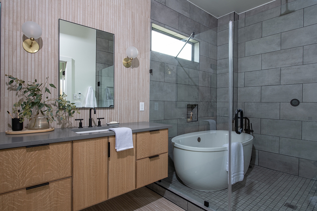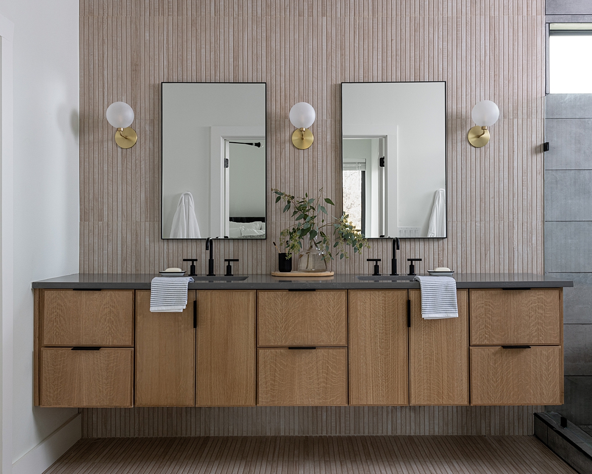 We took the side of the house where the three small bedrooms used to be and created a master suite with a gorgeous spa-like bathroom. In the bathroom, we installed floating oak cabinets that are cohesive with the kitchen. We added a double vanity, steam shower and a soaking tub. This is probably my favorite floor tile of all time and I love how it runs all the way up the wall to create visual interest.