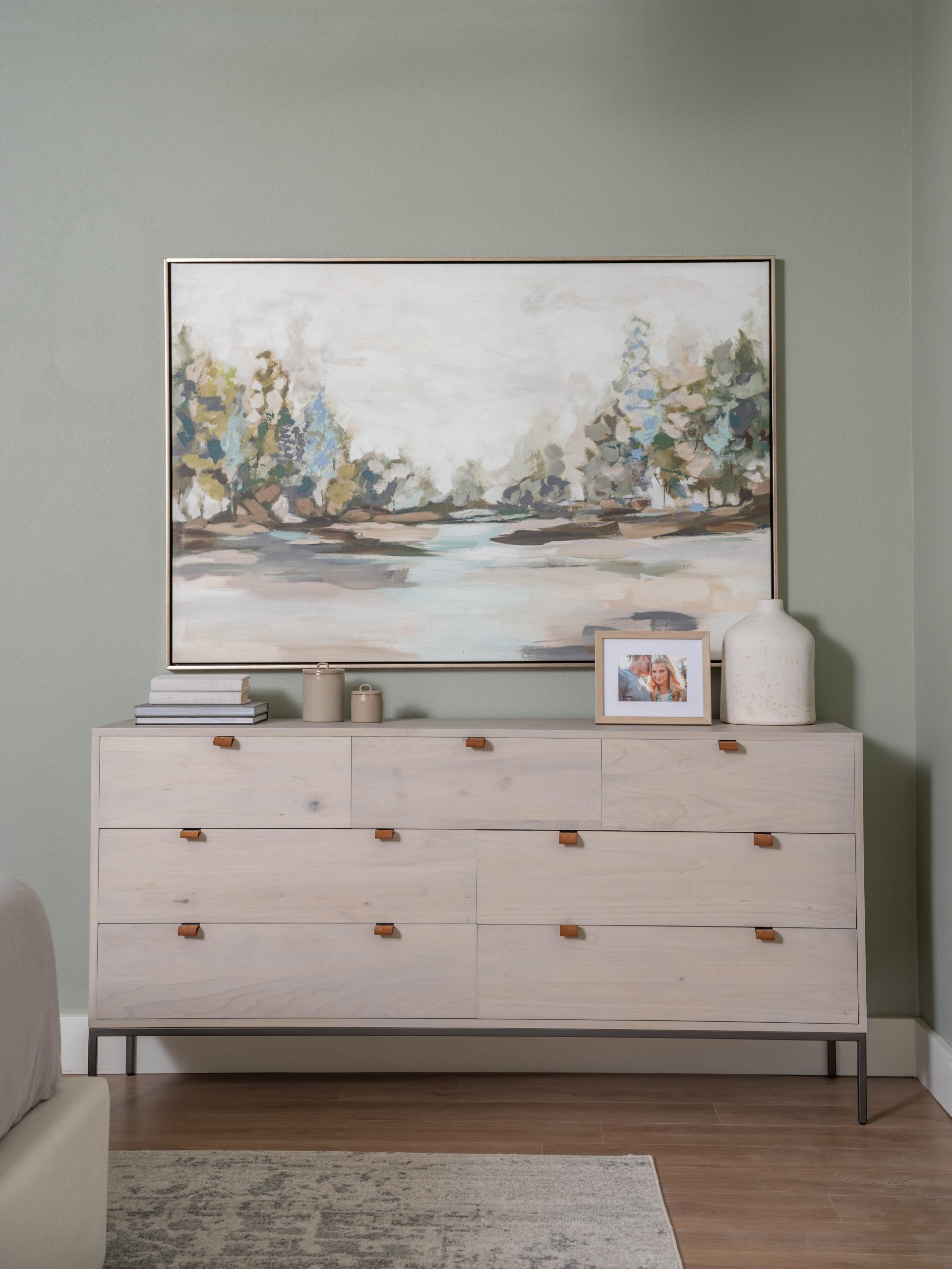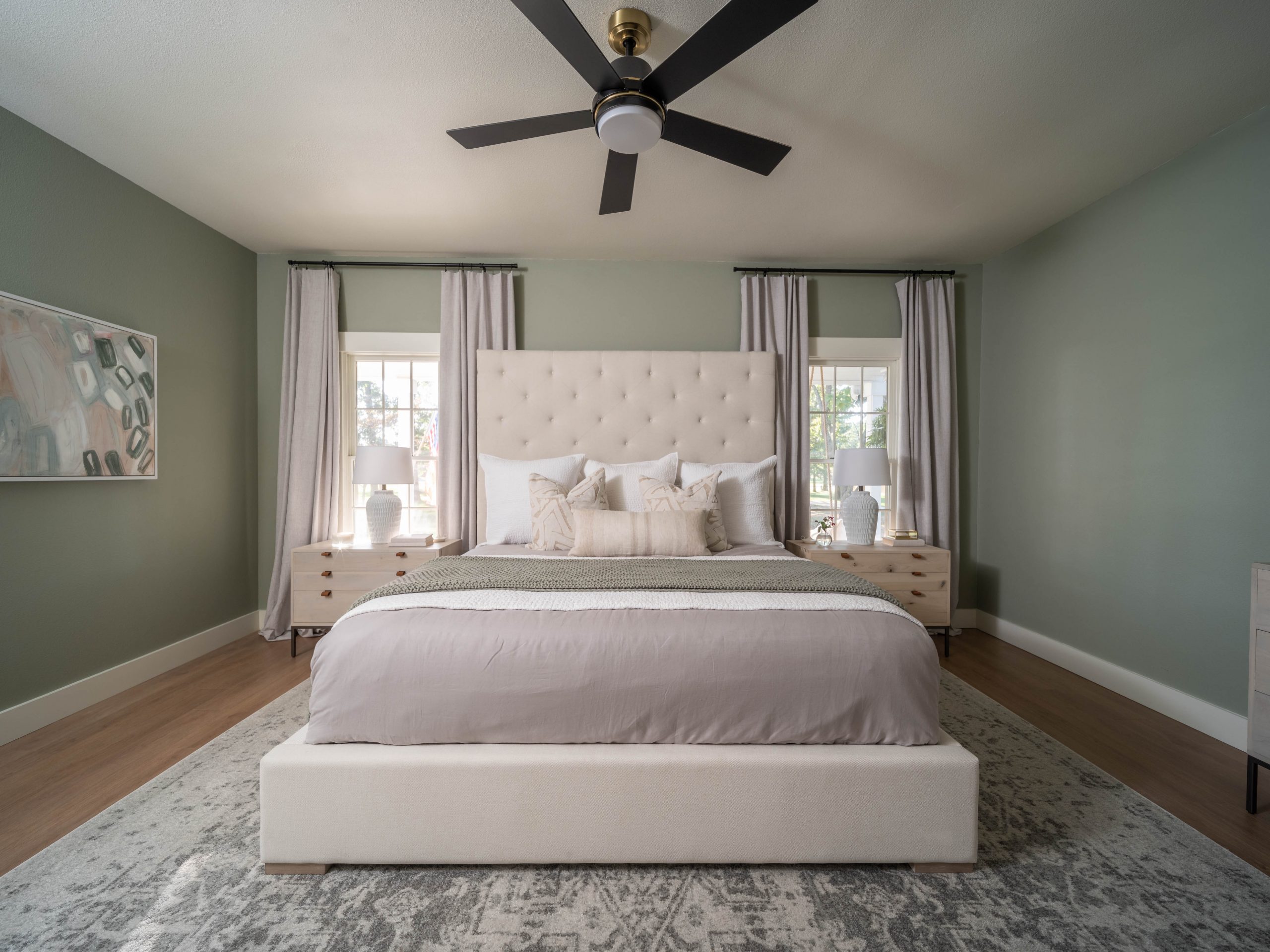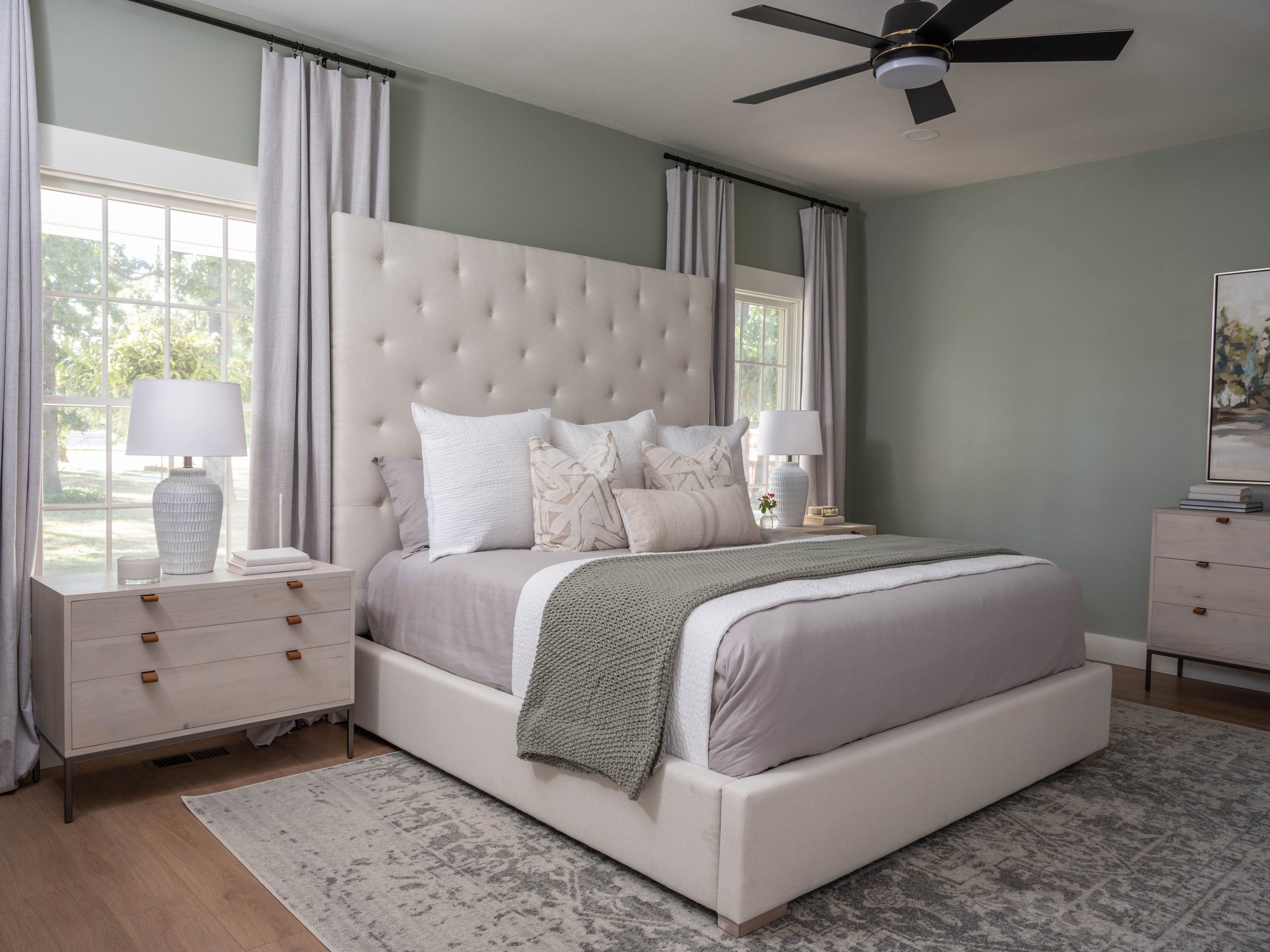 I wanted to give Nick and Shea a serene and cozy bedroom, so I chose soft neutral colors for this space. We were able to give them a bigger closet by stealing a little space from the other side and moving the door.