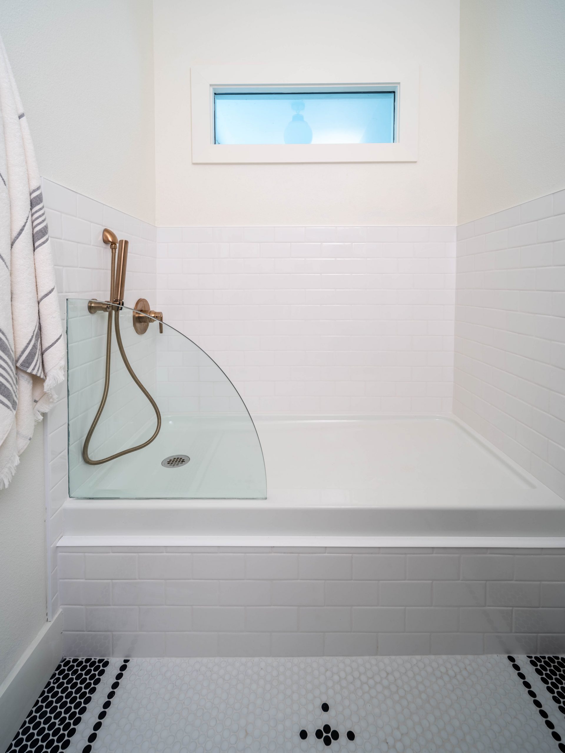 This turned out to be a fun surprise for the Frakes! We turned their laundry room into a laundry room/dog bathing station. Now that they have a lot of land, their dog Honey (and now their new puppy, as well!) is going to be having the time of her life running around and getting dirty. The pet shower is going to get used a lot! We added the same classic white subway tile in here to tie in with the kitchen and finished off the classic look with black and white penny tile.