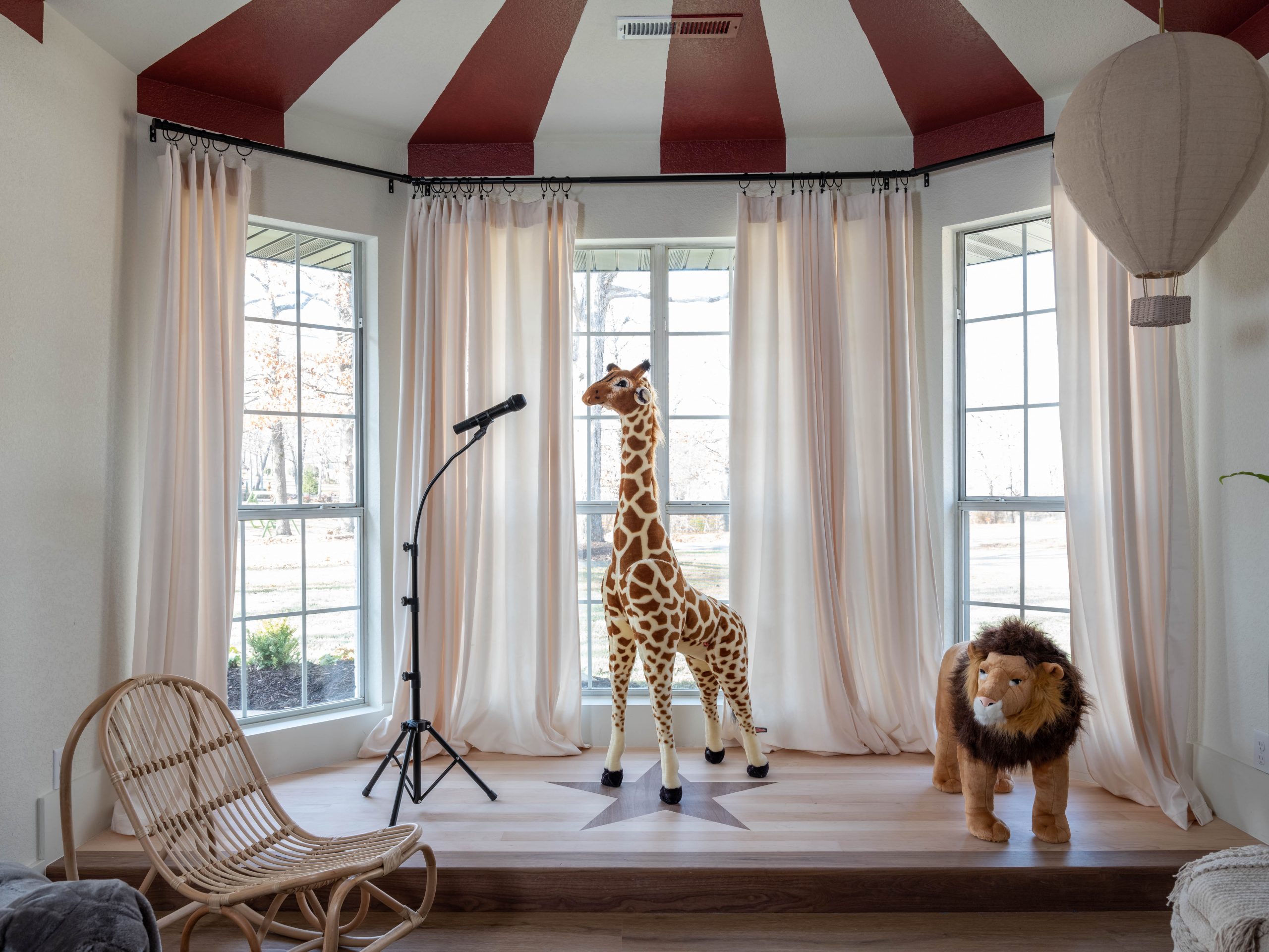 Like many families with small children, the formal dining room was not a space the Layugens pictured themselves using much. Instead, since it’s right off the kitchen, it would serve a better purpose as a play area right off the kitchen and living room where a family spends most of its time. This is where Dave and I felt we could make the greatest impact for this sweet family. We wanted the kids to be excited about their new house and happy about their move to Arkansas. For this room, we ran with the circus tent theme by painting the ceiling with red and white stripes like a big top. Then, we incorporated the red into funky, whimsical bookcases made by Dave, and added a fun custom stage in front of the bay window – complete with a special star design in the center. I can picture the kids putting on shows or using it as a reading nook.