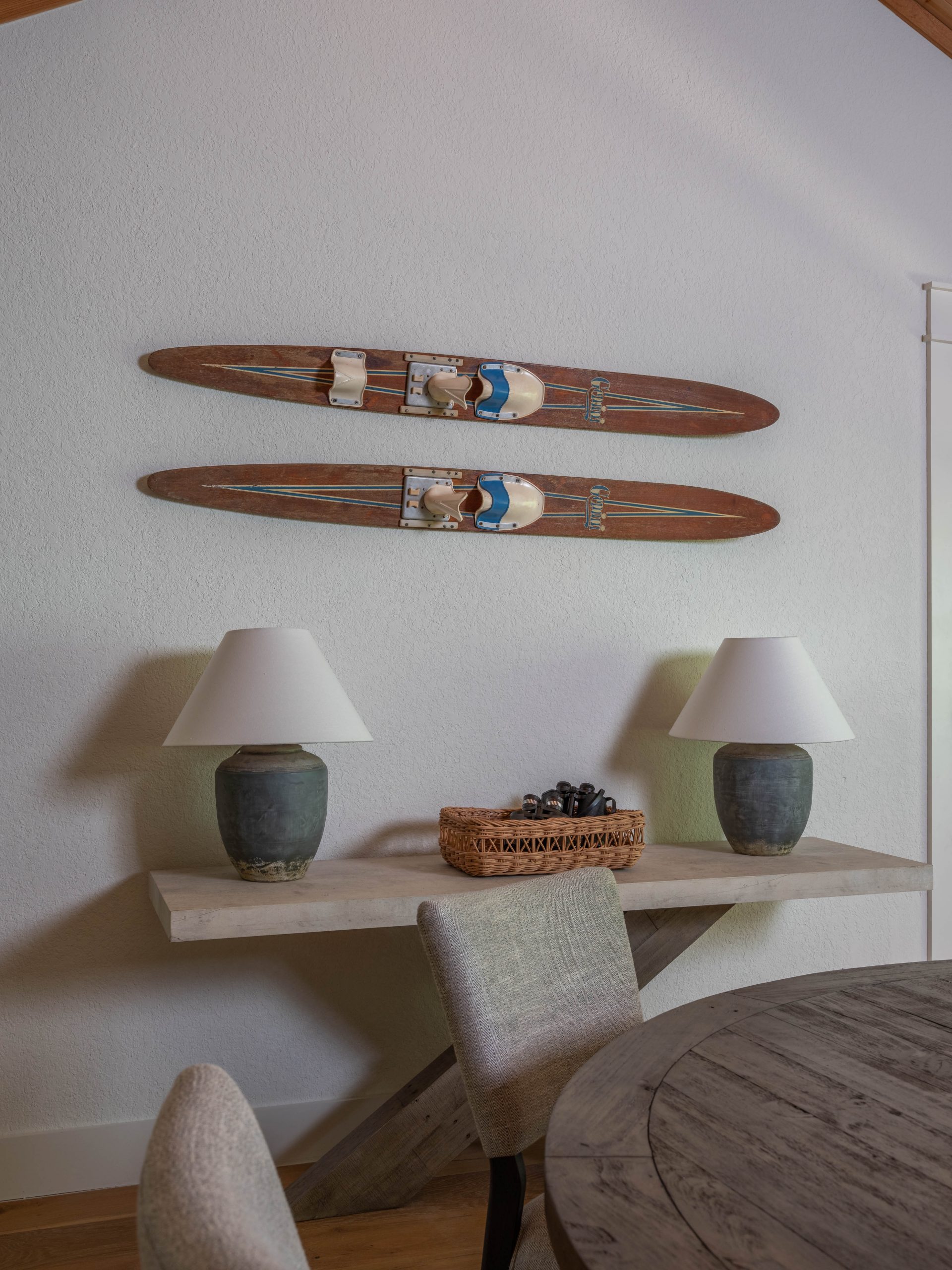 I just love how this area was completely transformed. The interior of the house used to be oddly-shaped – beginning with a front door that opened up to a potential fall down a staircase. We switched the direction the front door opens so that now, when you open it, it swings in to block the staircase. Crisis averted. We also softened the “drop zone” with the warmth of wood on the wall and replaced the dated railing. Dave created a one-of-a-kind driftwood handrail to honor Aaron’s love of this specific type of wood.