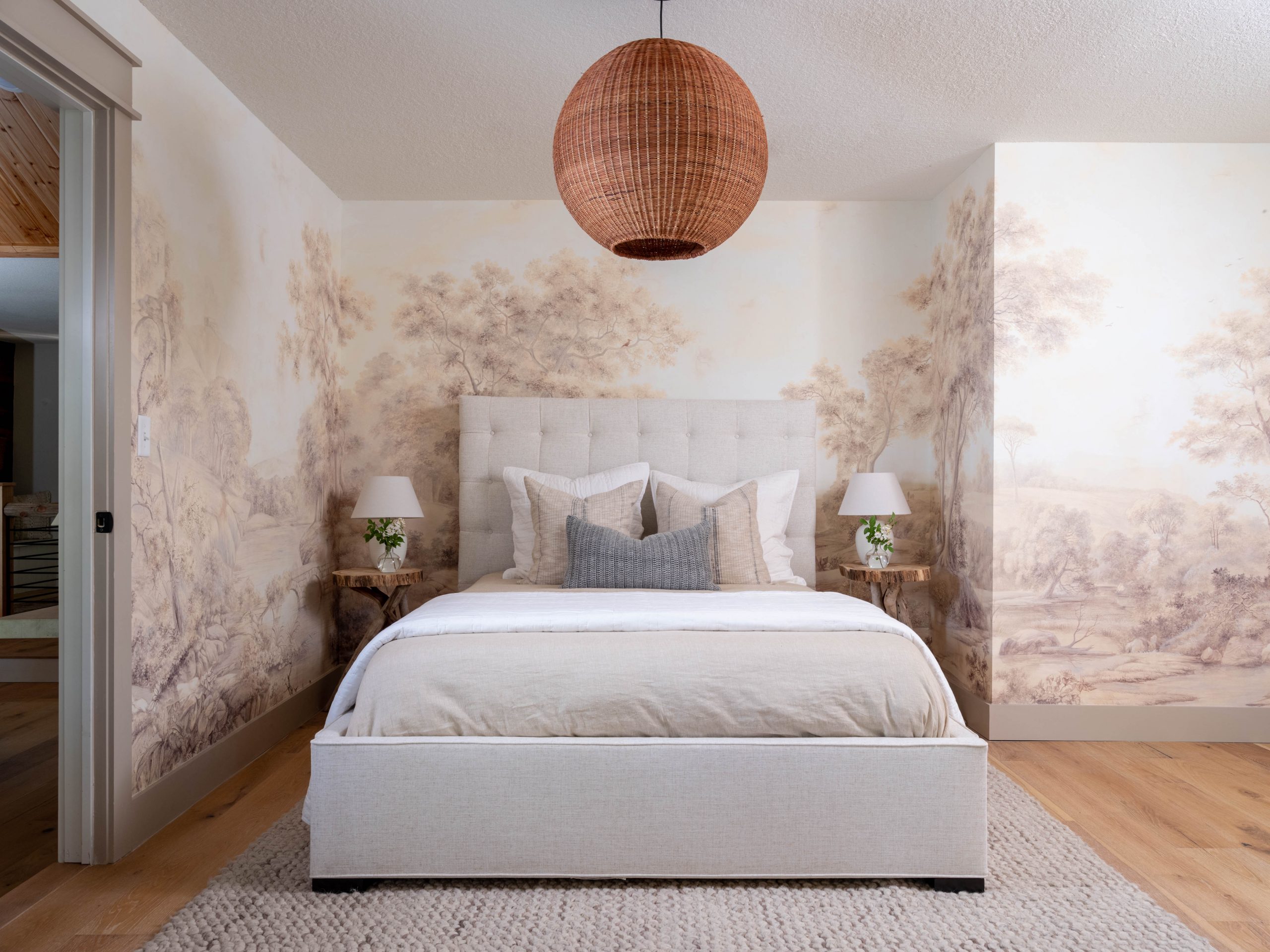 The best view in the house was through a window in the laundry room. That just didn’t seem right. So, when we reconfigured the main floor, we took that space – plus the old dining room – and made it into a bedroom with a bathroom. Originally, the main bedroom was in the basement with no view. For this room, I was able to find a wallpaper print of a soft, serene wooded scene. I enlisted a local artist to hand paint two small woodpeckers onto the trees in soft, muted tones. This was a beautiful way to honor the memory of Allyn’s mother, and I’m so happy she liked it.