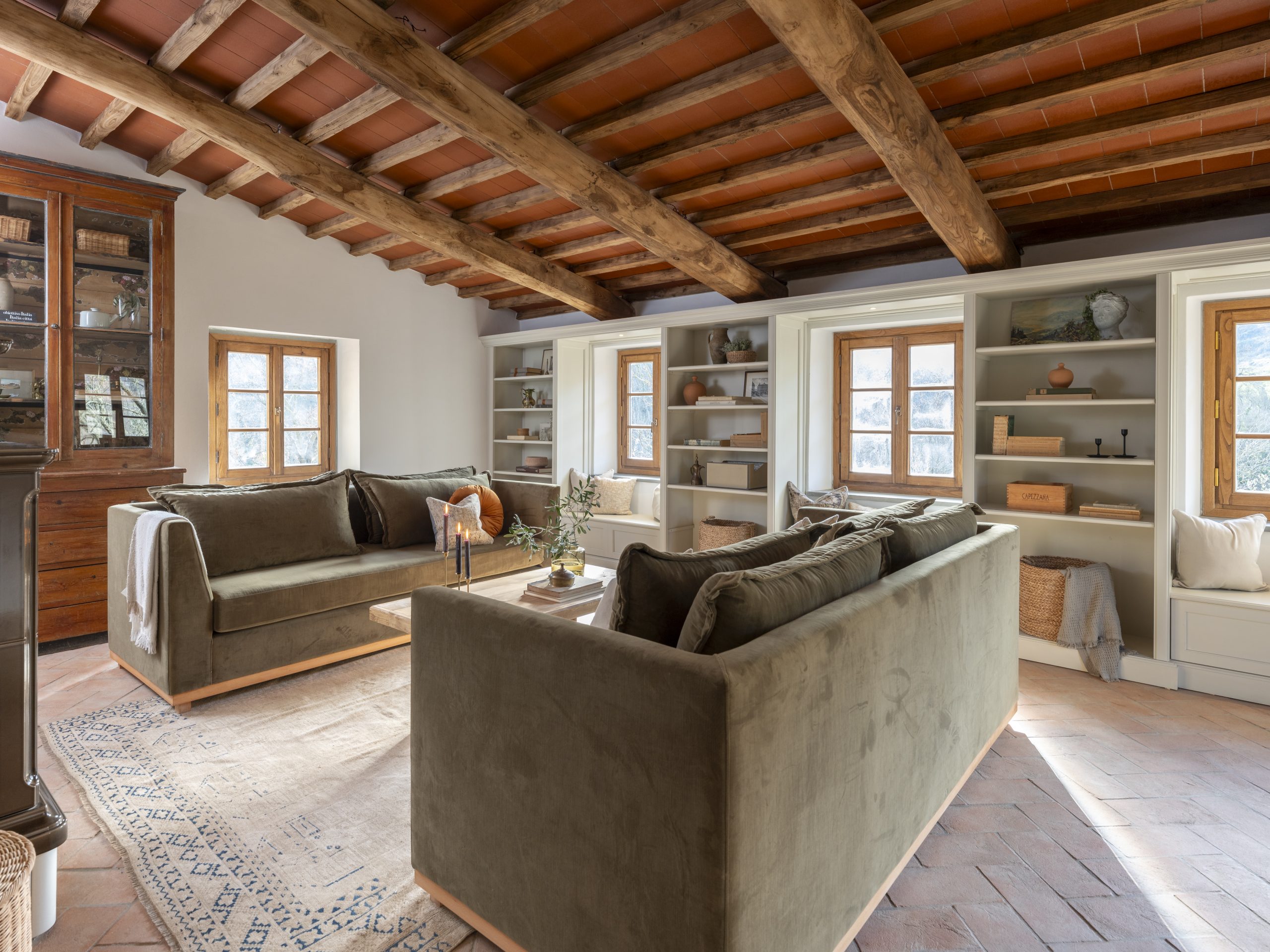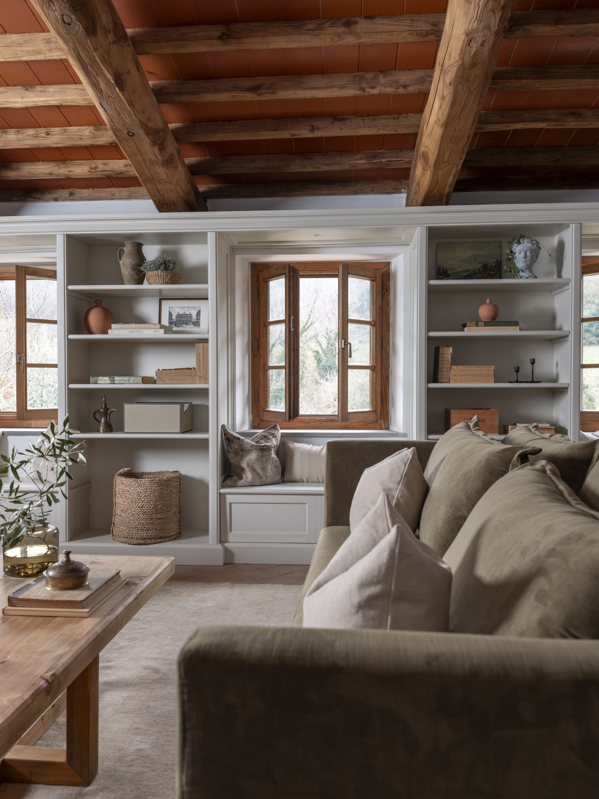 The biggest change in the living room happened when we added two new windows and a built-in bookshelf surrounding the windows. We almost didn’t get the bookshelf completed in time but I really pushed for it and I’m so thankful I did. I love, love, love the bookshelf and the window seats. In my opinion, reading a book in a window seat is the absolute epitome of a Tuscan exhale. 🤍