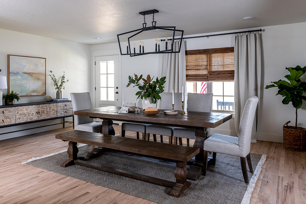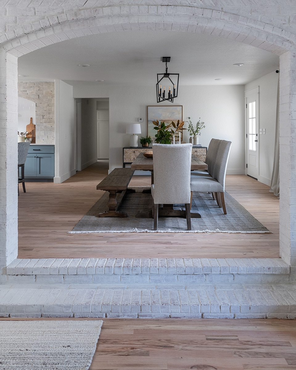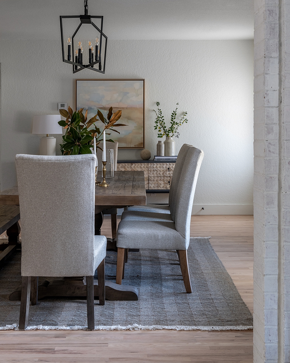 Sondra mentioned turning this area into a large dining room that included a sitting area for putting away the electronics and playing games with the family. We felt this room could flow right into the kitchen and almost function as one cohesive space. Lighter walls and floors brighten the look and helped liven the home’s interior in these main living spaces.