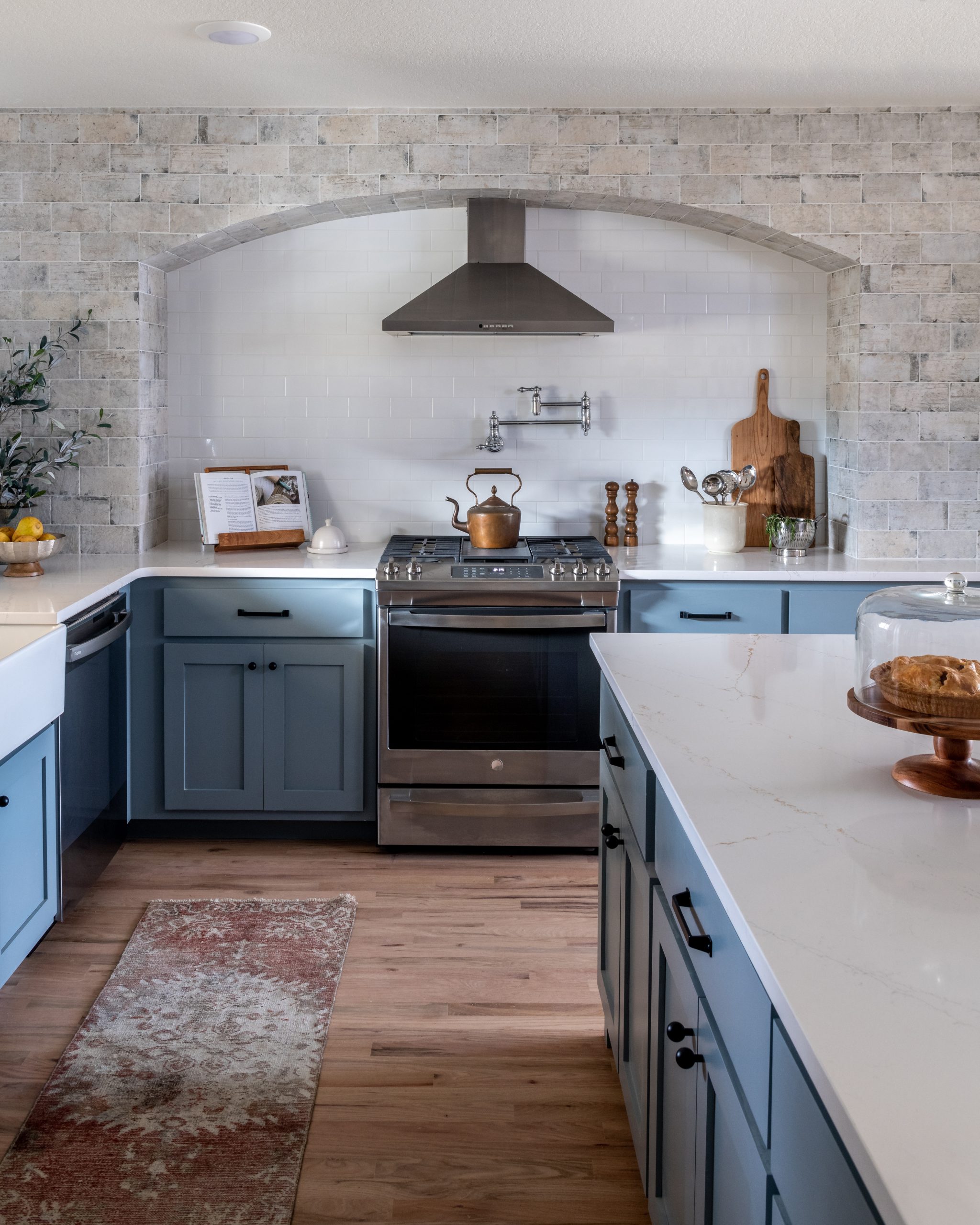 The Puorro’s home already had one arched brick opening leading into the new family room that just needed to be softened up. I wanted to tie the original arch in with the new range enclosure in the kitchen to create a eye-catching architectural detail. I love how this small change made such a big impact. It now feels like a beautiful, layered, olde-world kitchen.