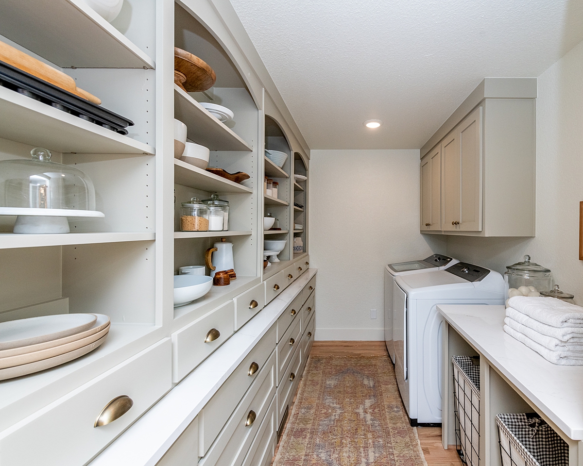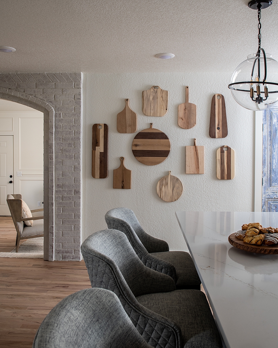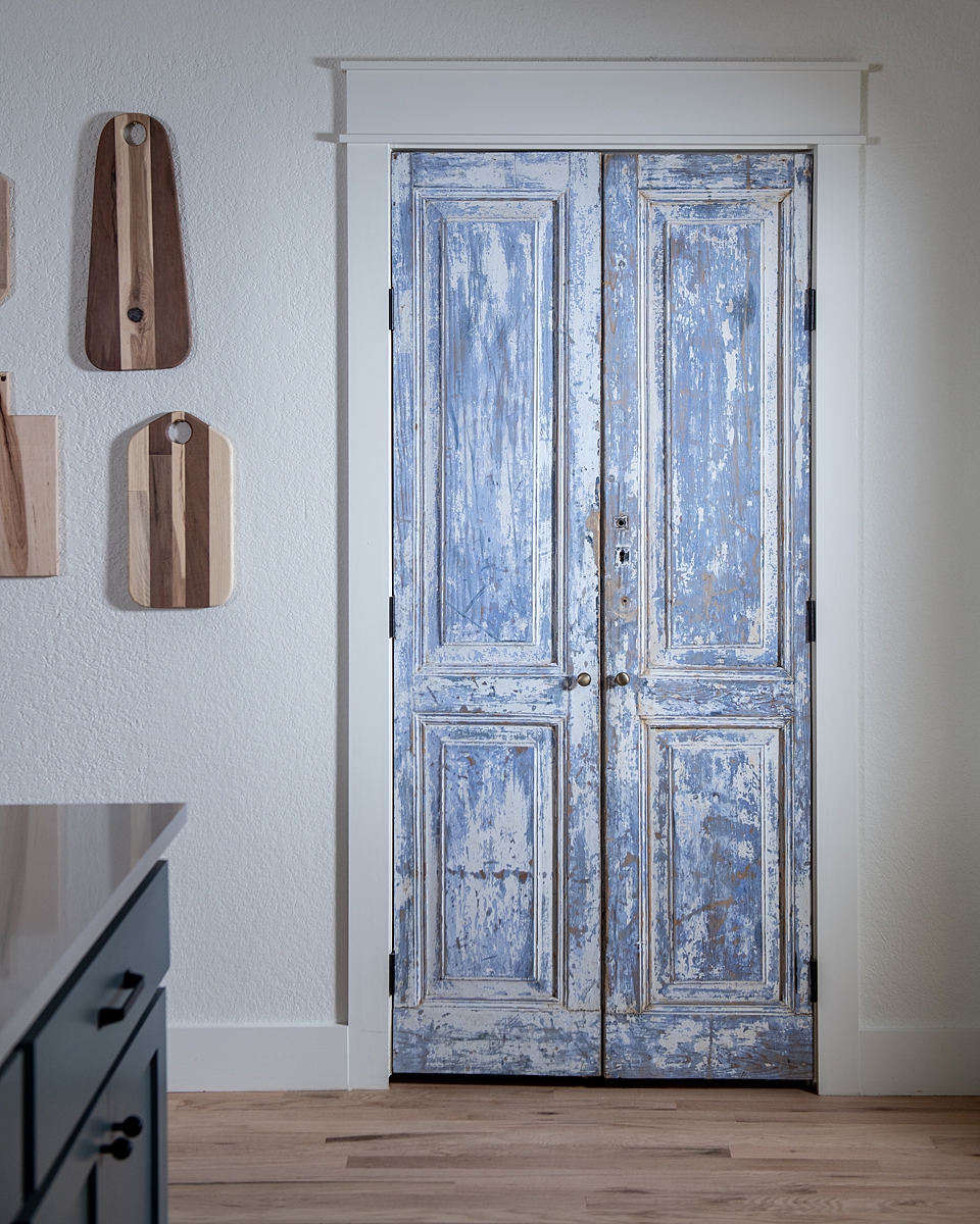 I chose a warm blue for the cabinets, inspired by Tom’s favorite space: the old barn out back. Speaking of the barn, we were able to repurpose a gorgeous set of vintage doors Sondra had been storing in the barn to lead into the new pantry. And, this isn’t a typical pantry. We utilized the former dining room to create an incredible walk-in pantry and new laundry room. One other personalized touch is the gallery wall of handmade cutting boards. Dave built these boards as a nod to Sondra’s love of baking and I loved using them to create a unique focal wall in the kitchen.