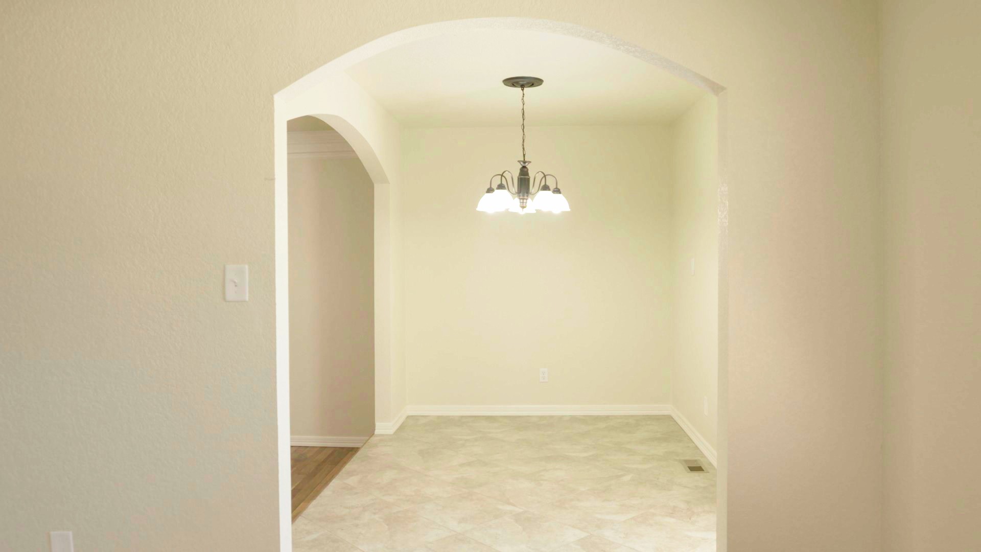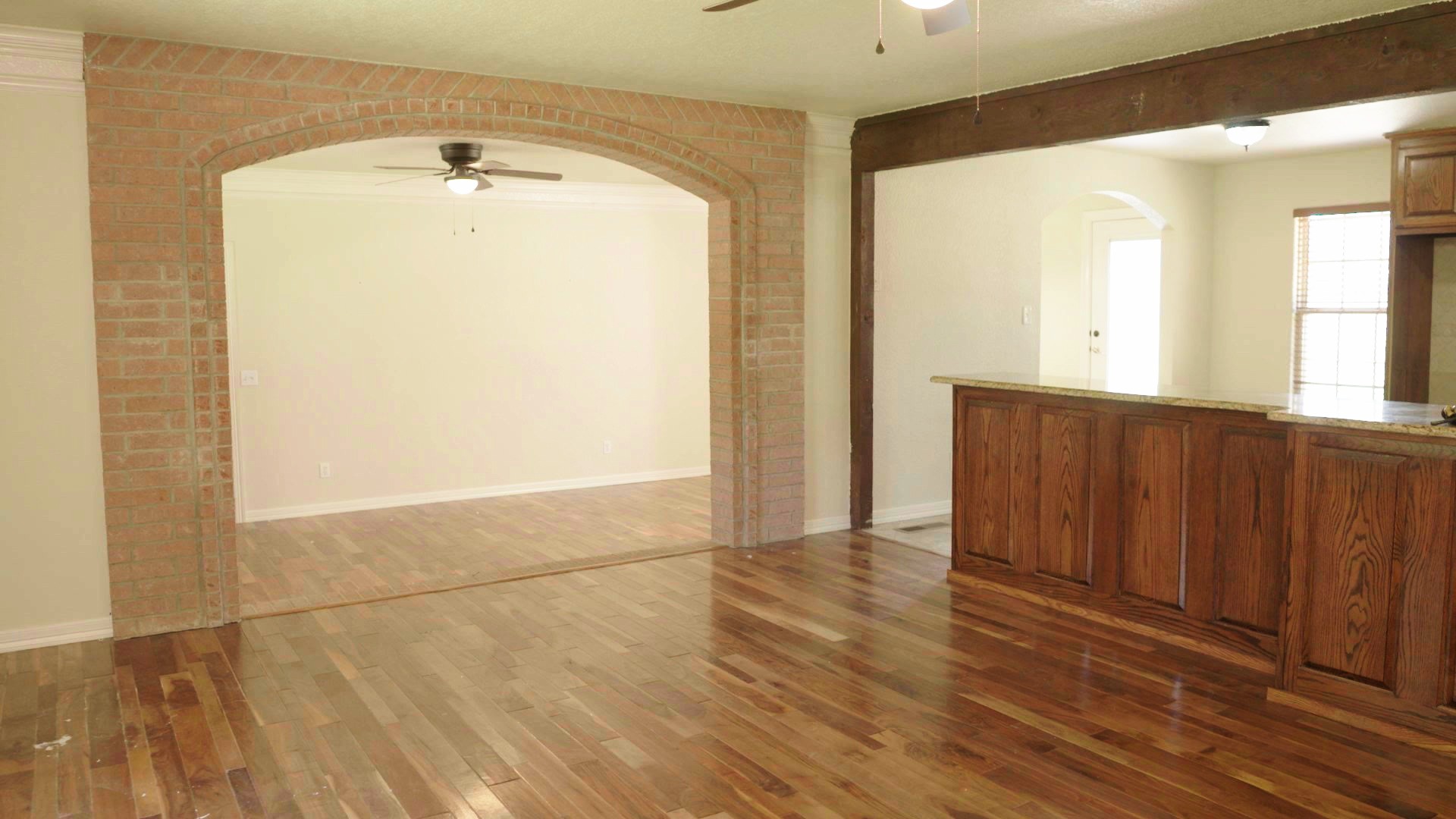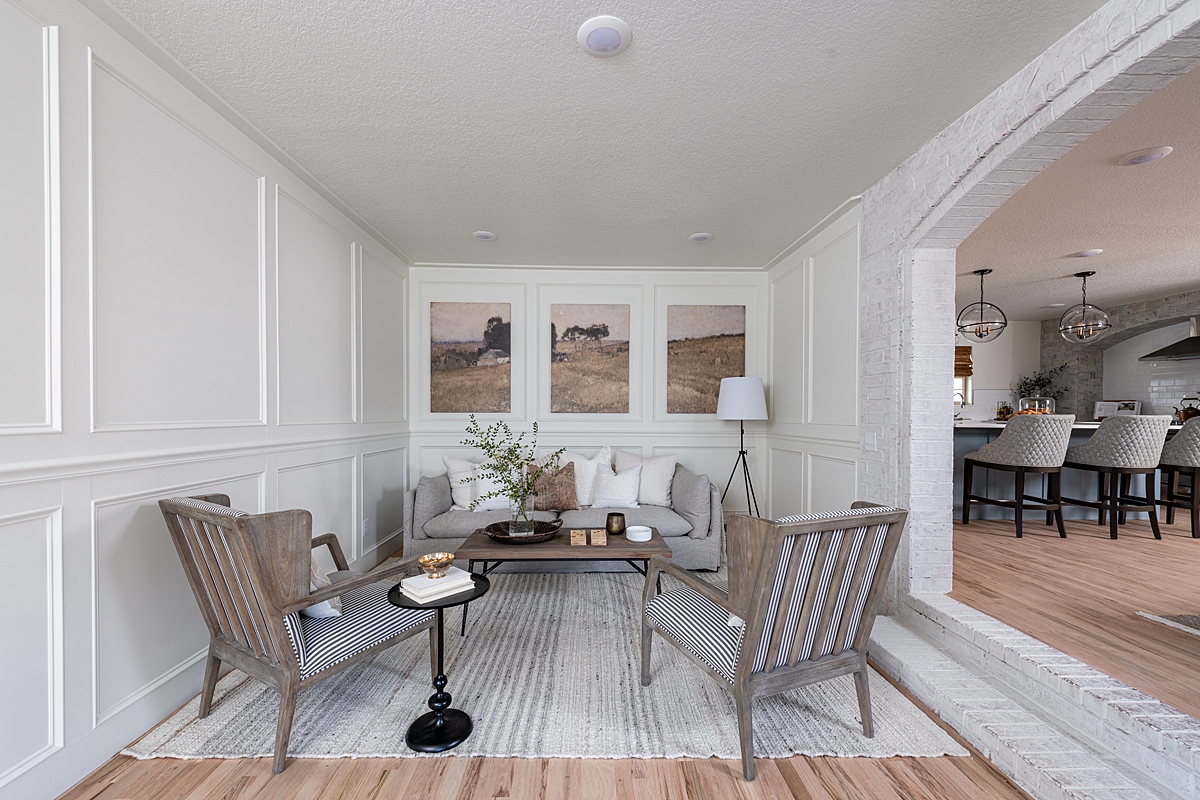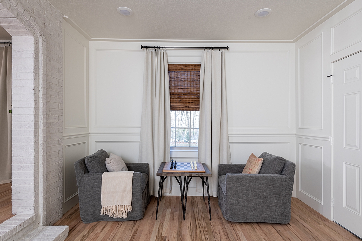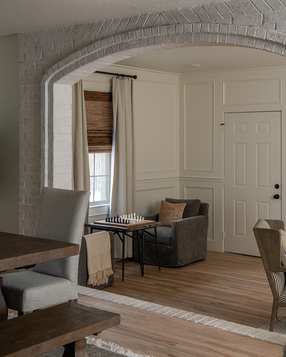 The sunken bonus room off the garage was the perfect space to create a cozy, welcoming place to relax and read or play games. A soft wash on the brick arch helped lighten the room’s entry and created a cohesive feel with the new colors in the dining room and kitchen. Decorative trim on the wall adds elegance and sophistication to this cozy room.
