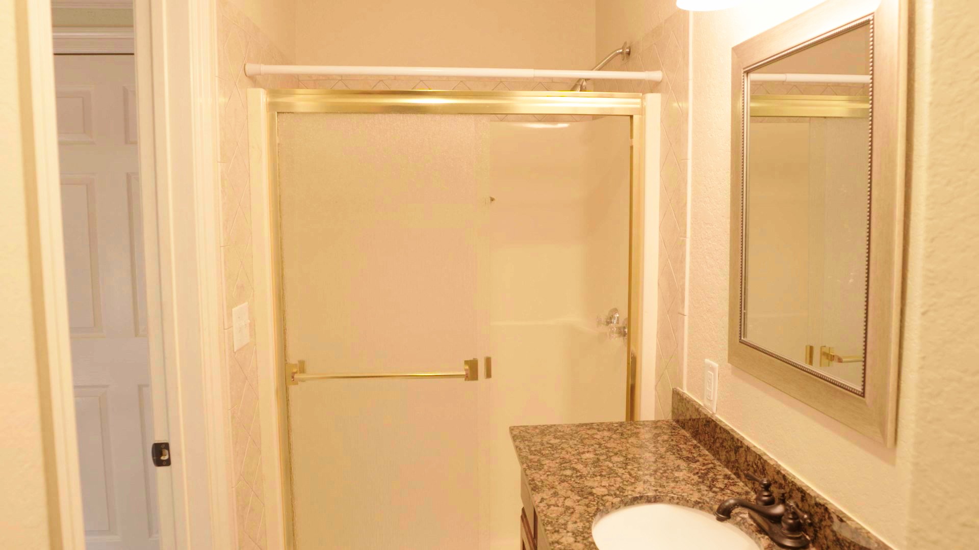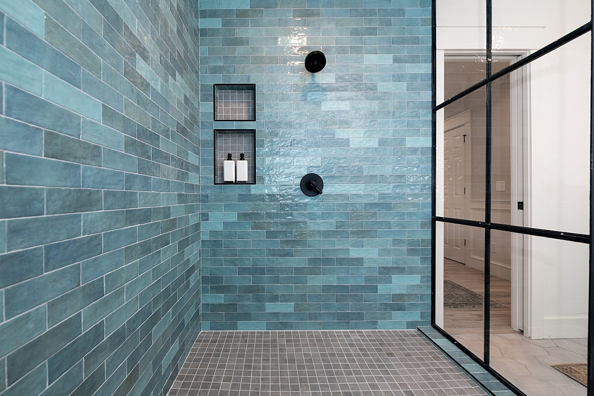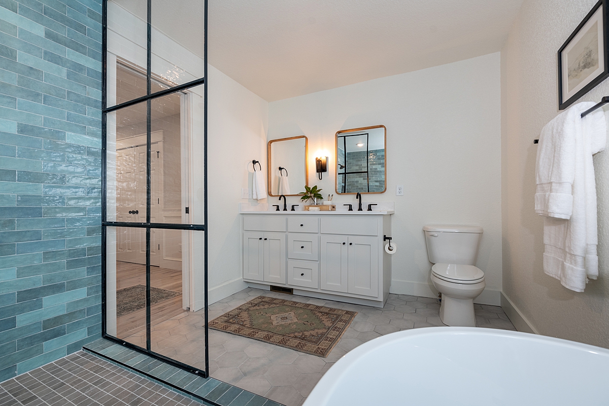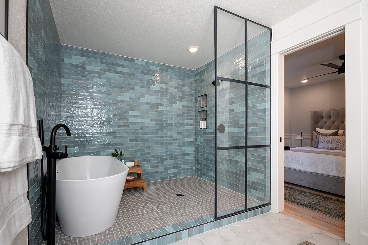The main bedroom and bathroom didn’t have any character and were pretty small. The bathroom, in particular, was incredibly cramped. We were able to steal space from the guest bathroom (and former laundry room) after we moved the laundry room out of the bathroom to the new pantry. This gave us about 60 extra feet to work with for the new main bathroom and allowed us the space to add a new vanity, a floating tub, and a large walk-in shower. Blue porcelain tile and the custom built shower door panel made by Dave and his brother, Matt, gave this bathroom a peaceful, spa-like ambiance.