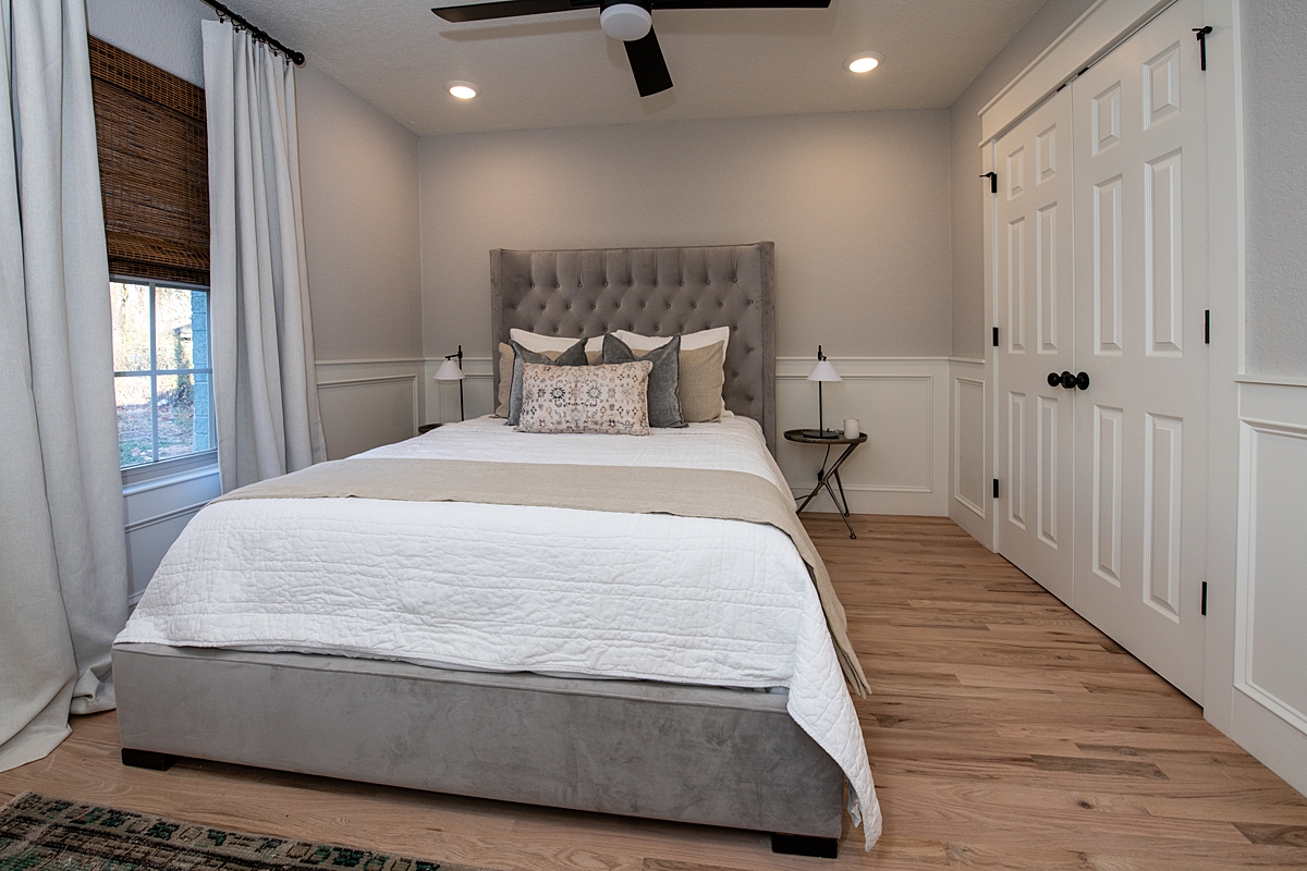 Meanwhile, we added decorative trim in the main bedroom to create a serene and elevated bedroom.