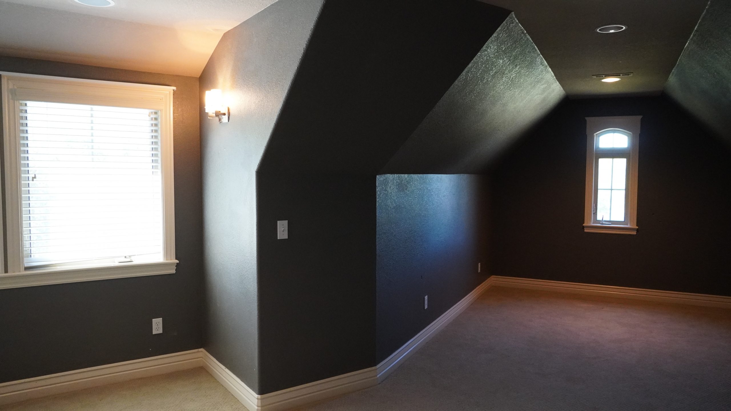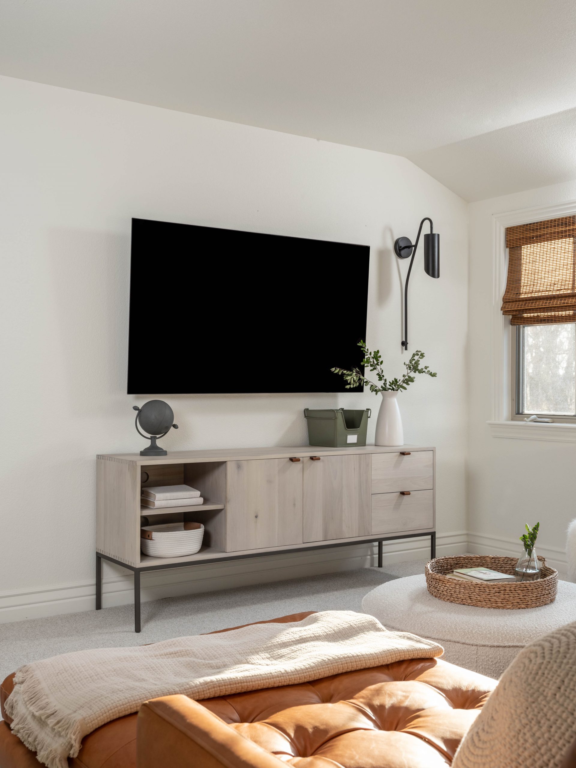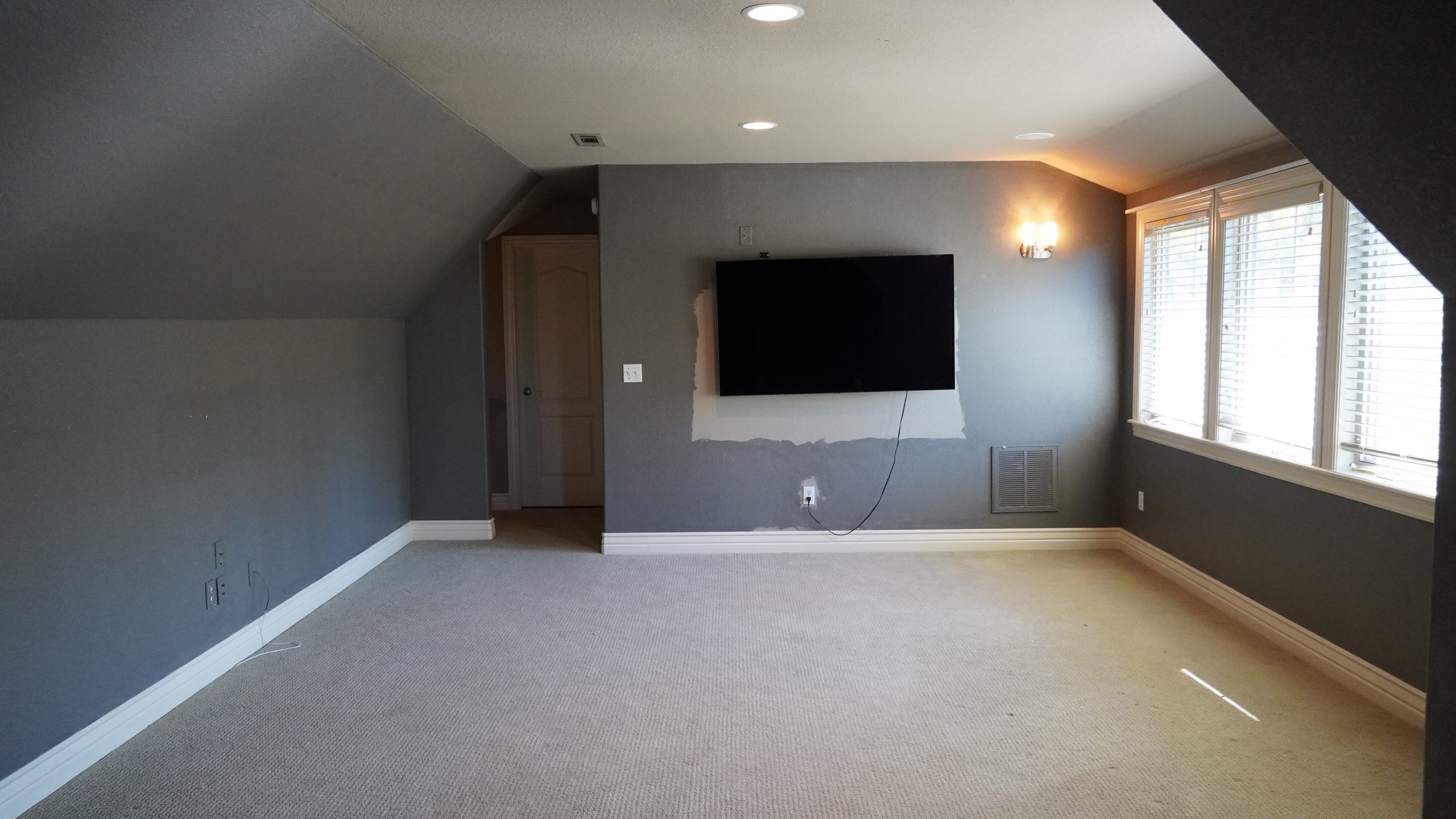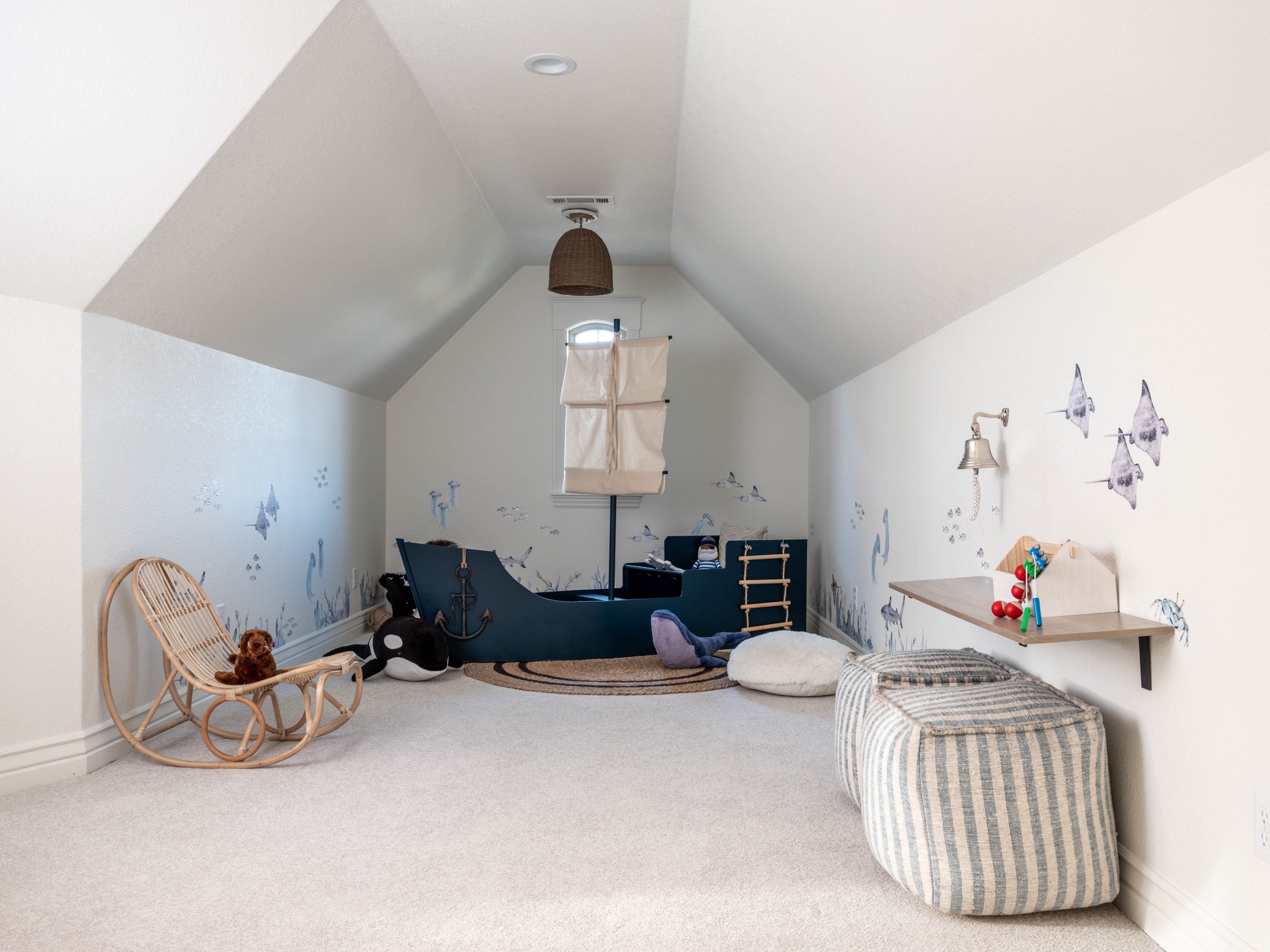 What a fun space to fix up! I love working with unexpected rooms that have unusual angles. The room had been originally painted a dark blue all around which had given it a cavernous feel. It was easy to freshen it up with new carpet, lighter paint and some fun sea animal decals. Dave built an amazing pirate ship play area for Finley that Luke tested out and approved. We also added a little built-in table for Finley to color or maybe build Legos when he’s a little bigger. For the larger, front part of the room, we maximized the space by turning it into a comfy TV viewing area.