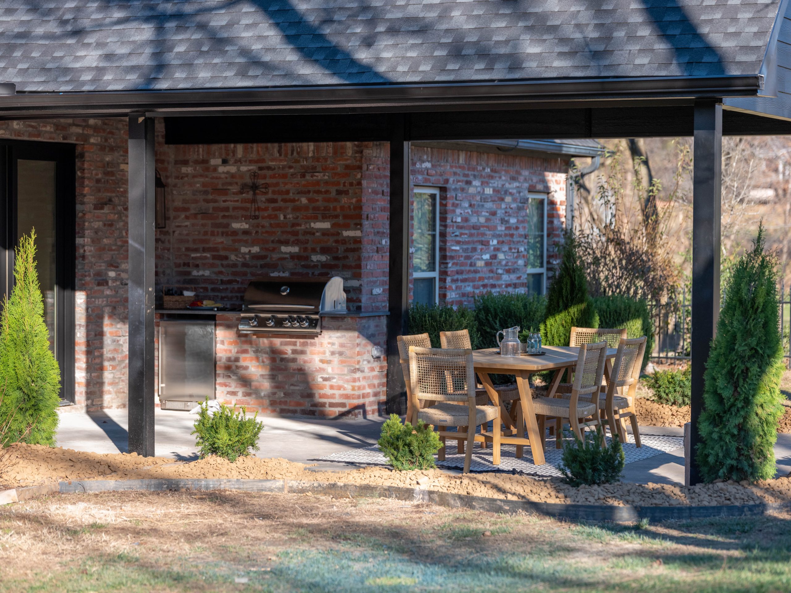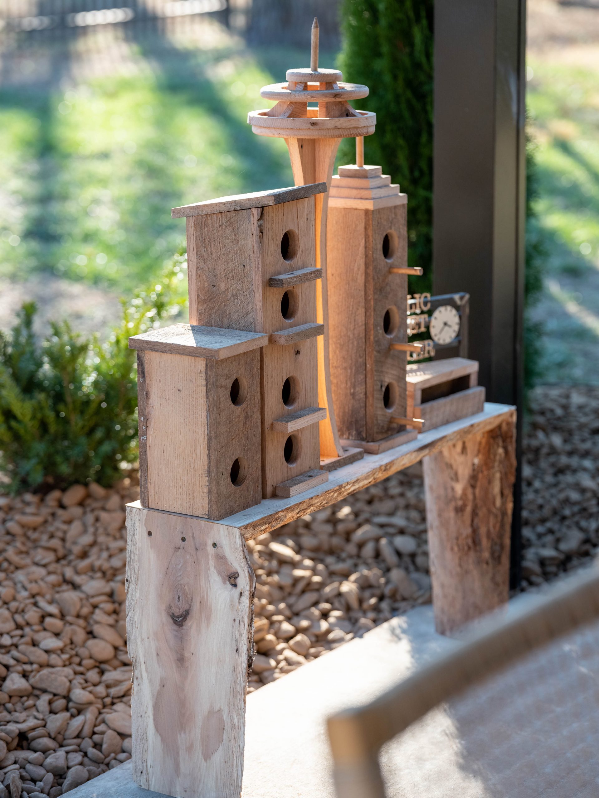 The Pryors have a beautiful property, so we definitely wanted to make sure they get to enjoy that as much as possible. The pergola they had in the backyard was pretty, but they really needed a more substantial cover in order to make it enjoyable out there. We extended the roof over the patio for more shade, and now that the living room has doors that lead directly to this spot, it’s all the more usable. We also added an outdoor kitchen with a small refrigerator and built-in grill. My favorite part, though, is the bird city! Dave really outdid himself with the Seattle-theme Space Needle bird feeder and skyline housing. I know Finley and his dad are going to love feeding the birds out here!