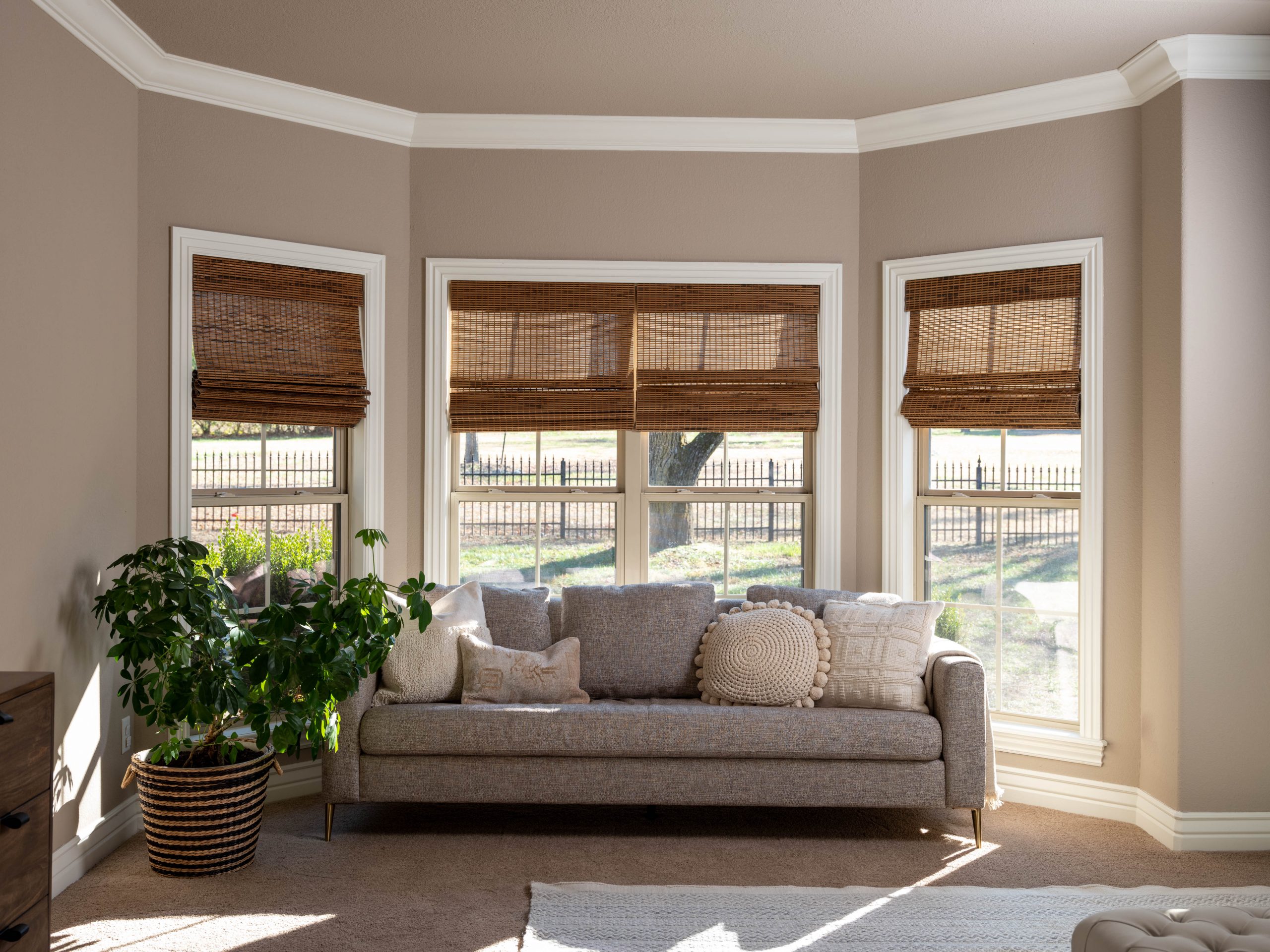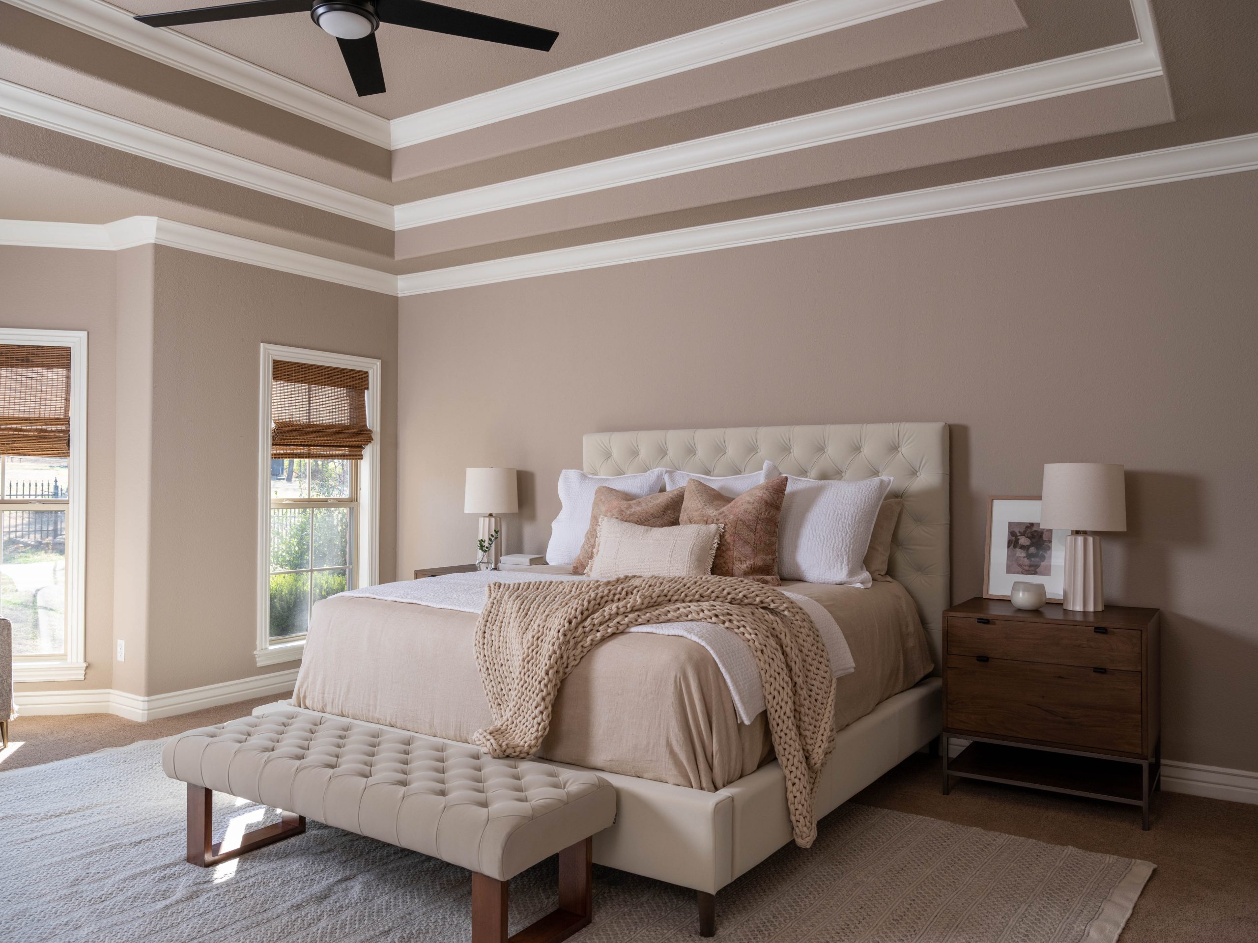 All the bedroom needed was a big touchup. We removed the metallic paint from the ceiling and took down the wallpaper and chandelier. Then, to make it feel calmer and more serene, we chose a lighter paint color. The textured window treatments add warmth, and the full sized sofa in front of the window maximizes that space for a cozy reading spot.