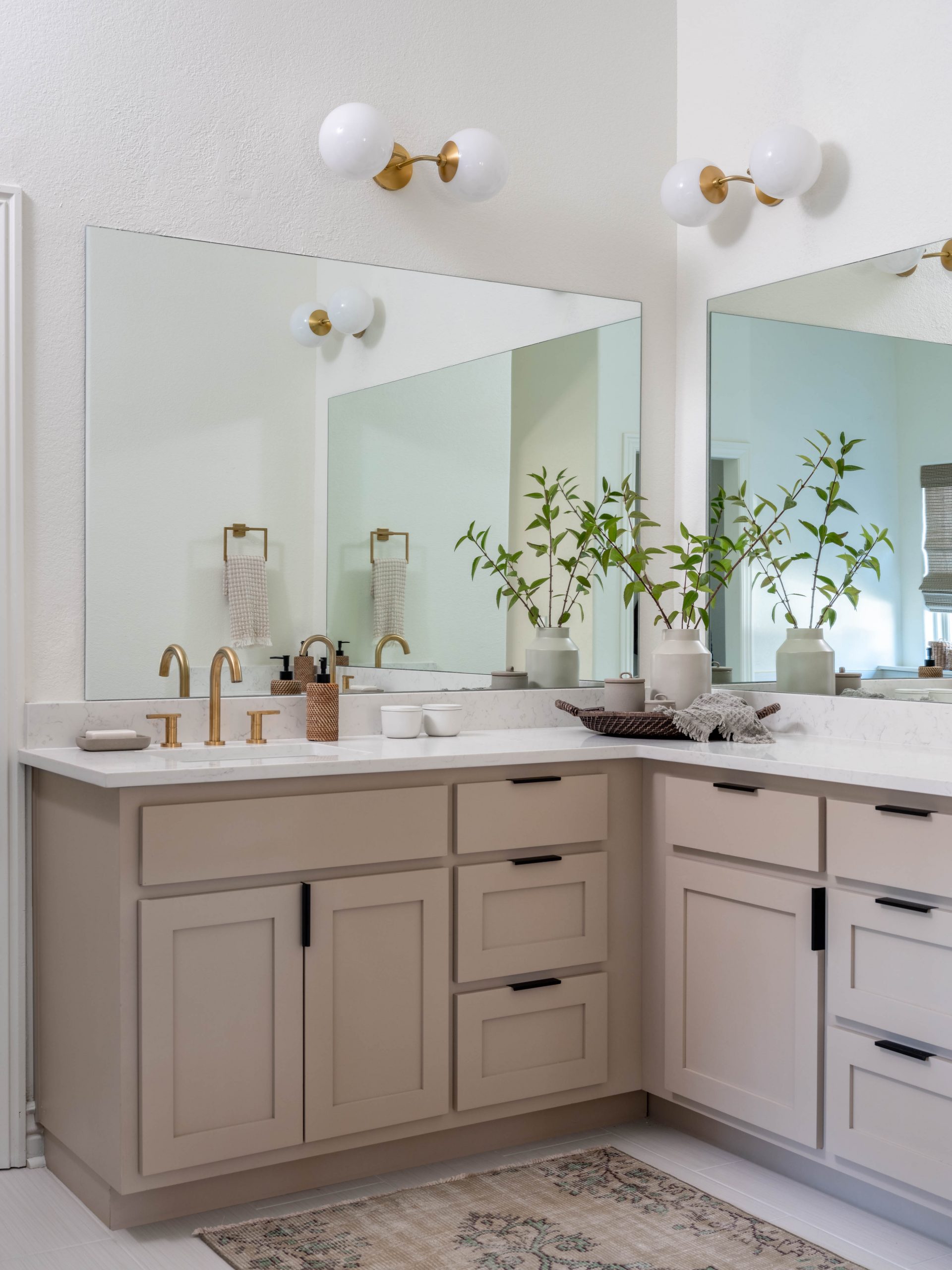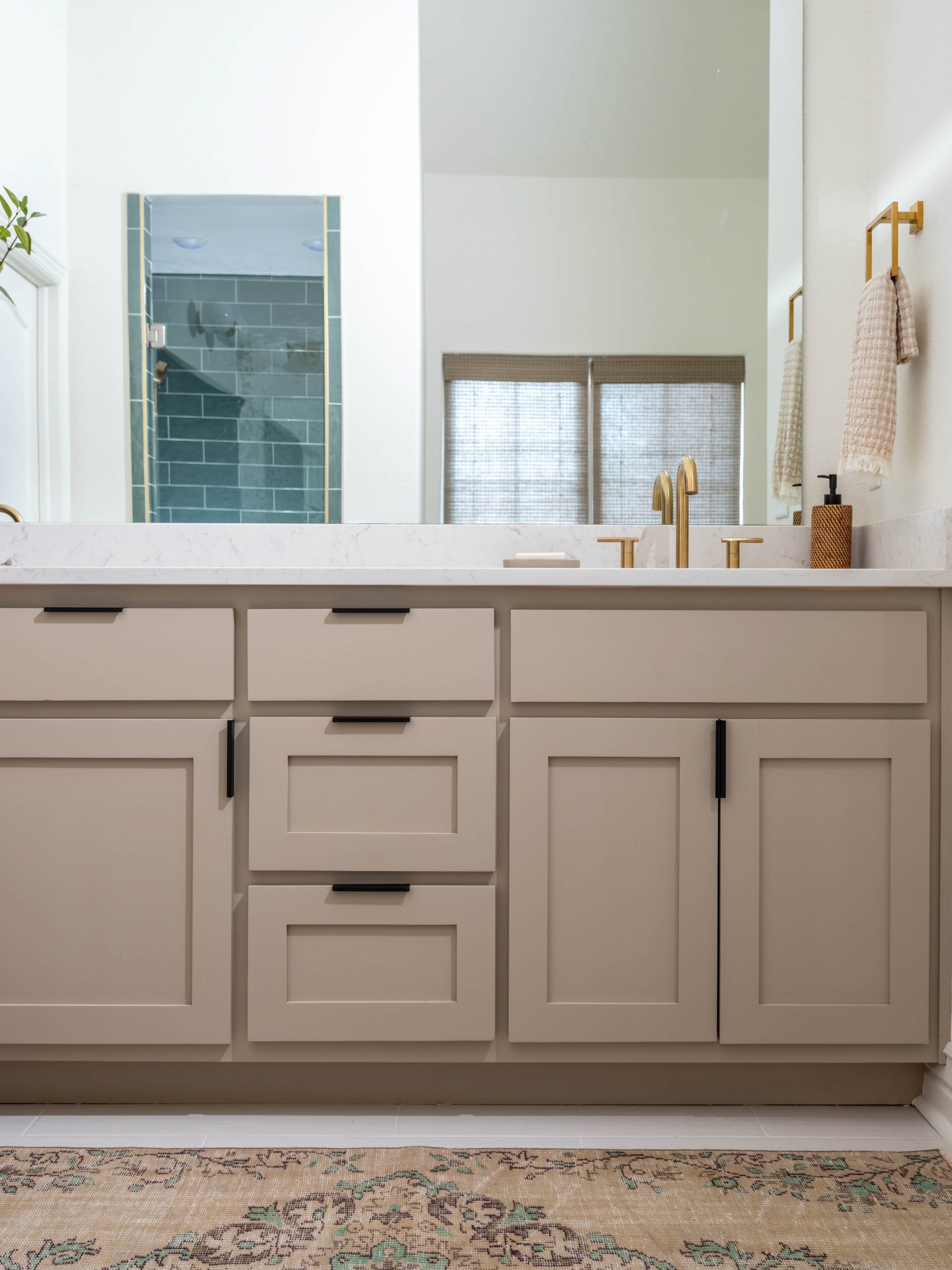 The bathroom was a little bit more work. There was a lot of tile to remove, including some very well-installed crown molding tile. We installed new flooring and light colored vanities with quartz countertops for a sleek look. The green tiles make the shower feel so serene, and the special-ordered handmade bathtub adds a luxurious modern touch to a traditional bathroom. I chose silver fixtures for the bathtub and brass for the shower and sinks. It’s OK to mix metals; different shades can still look cohesive and modern if you do it right.