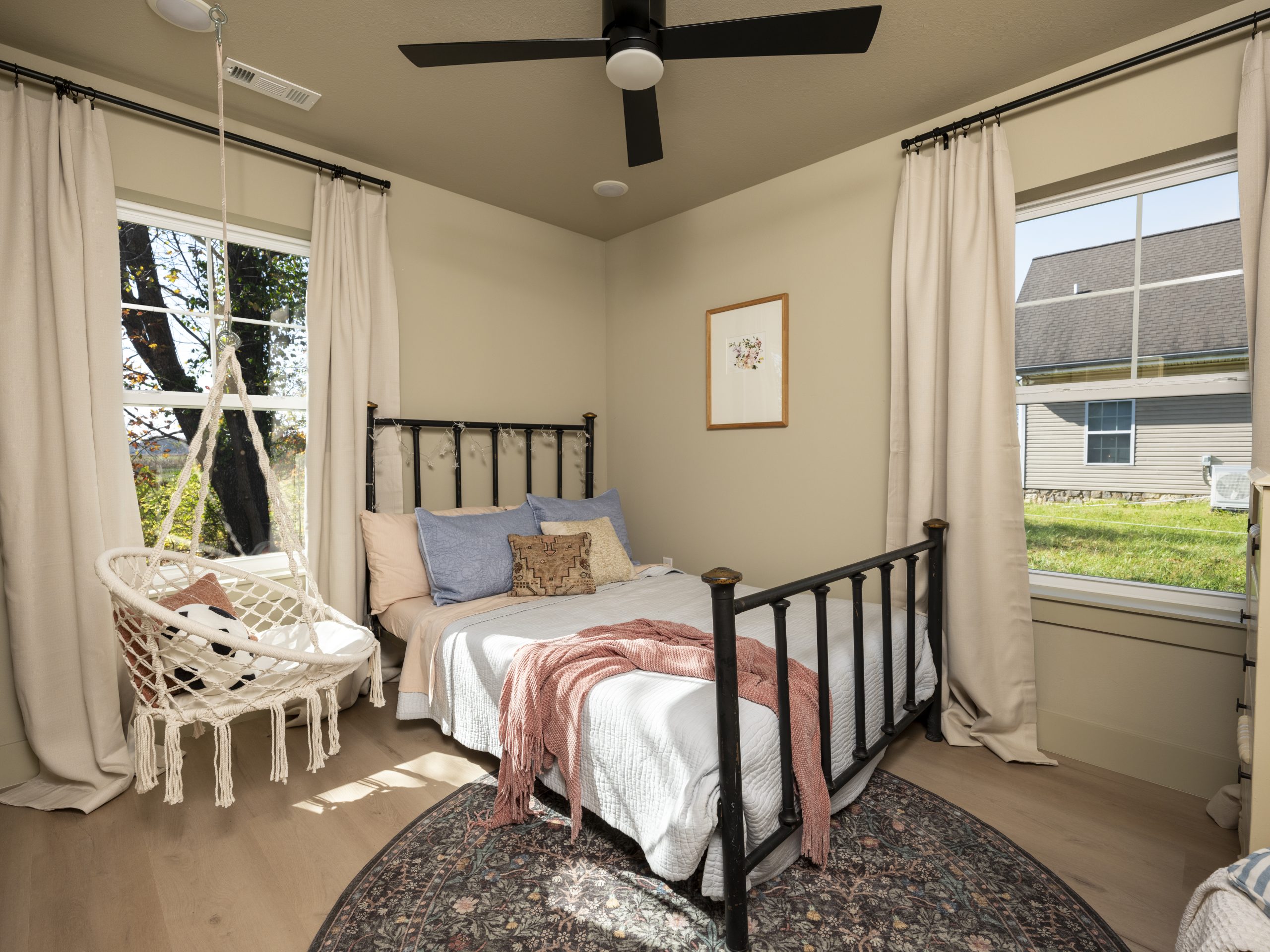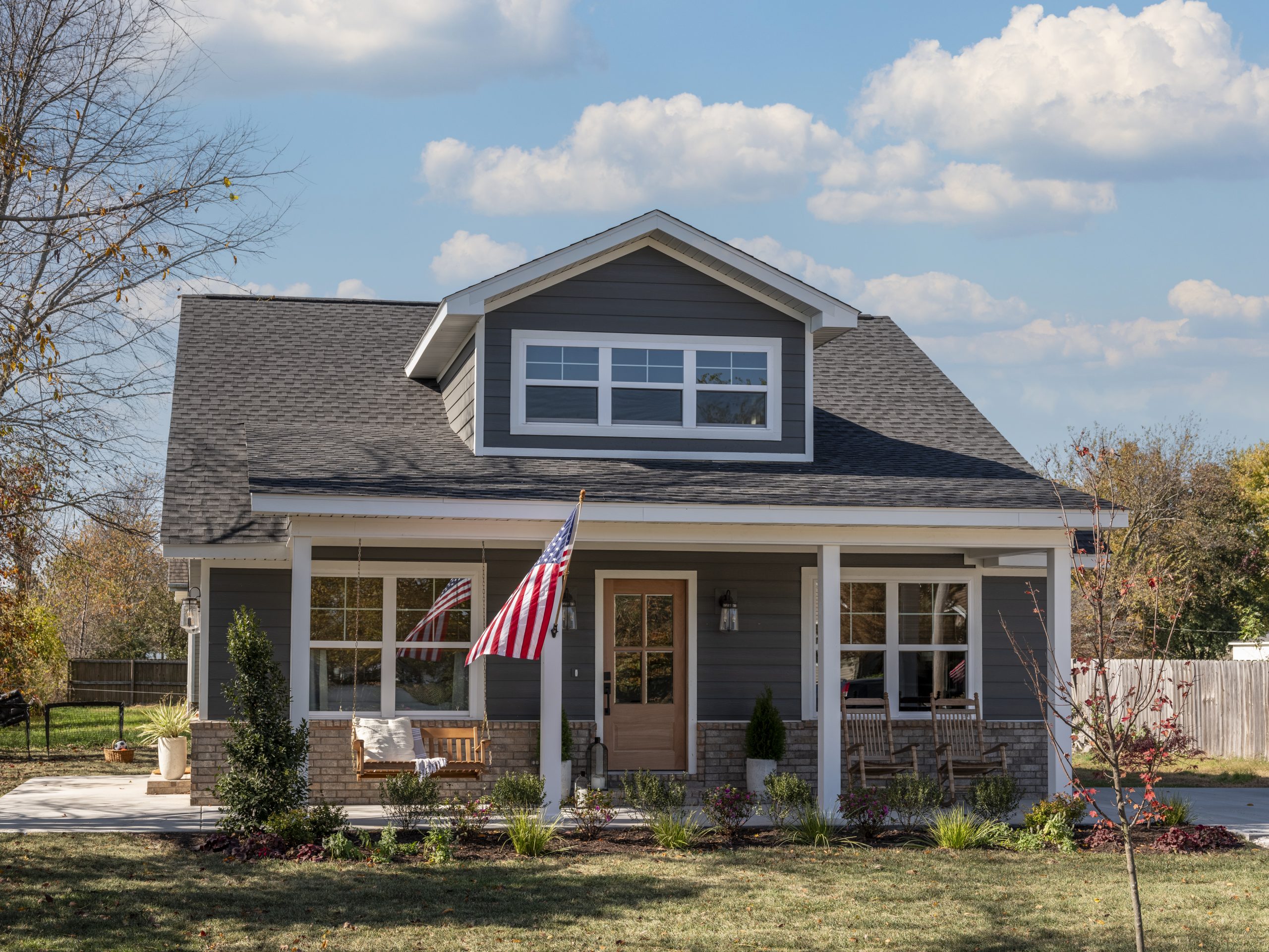 We added a classic front porch with rocking chairs and a swing. I can easily picture Amber sitting with her kids, enjoying the view of the new tree they planted together in the front yard. There’s plenty of room for Andrew to run and play and for Addie to practice soccer. The front steps include two special bricks—one with their names and another with the year the house was built. My hope is that these small, personal touches help this house feel even more like home for Amber and her kids.