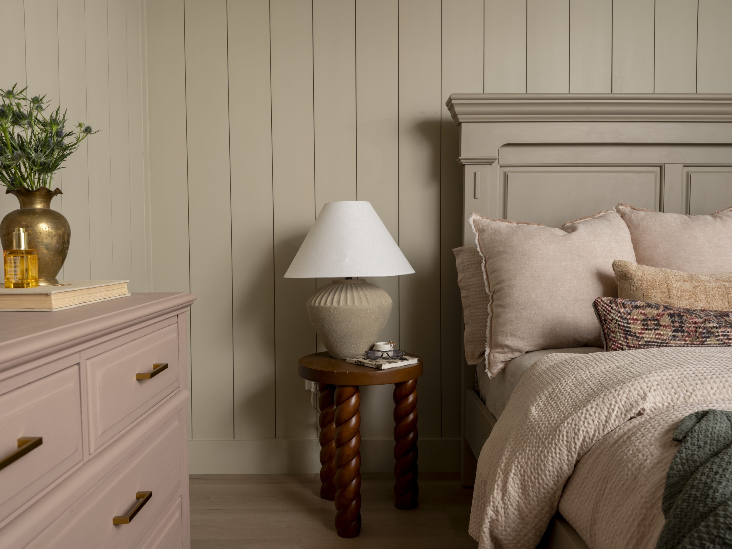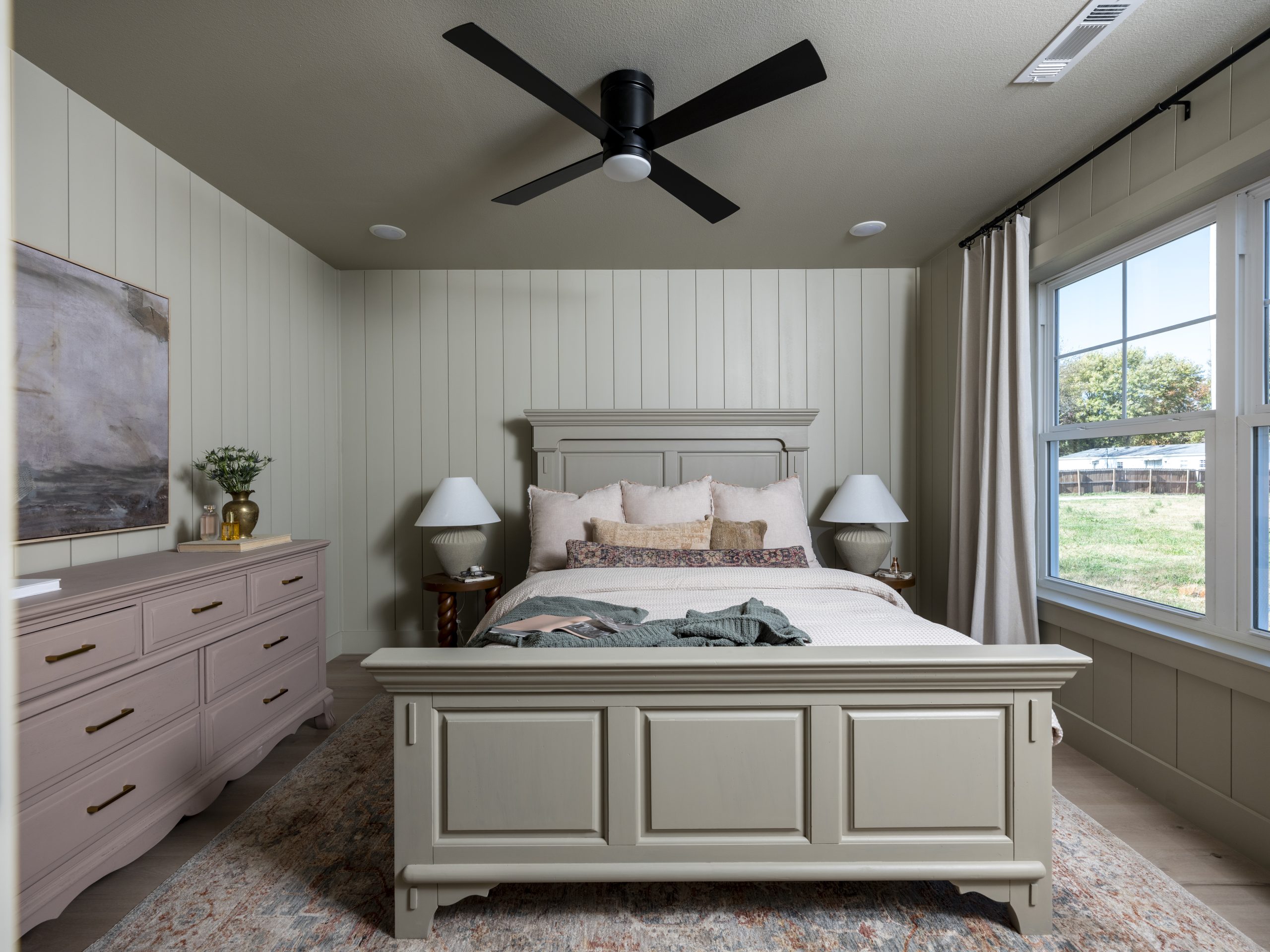 Amber is so selfless. When we asked what she wanted for her bedroom and bathroom, she told us she was happy with anything and just wanted everything to feel special for her kids. Knowing how hard she worked to make this house a home, we wanted to do something special just for her. We added paneling to all the walls to give the room more intention and character, then softened the space with shades of pink in the rug, pillows, and dresser. Those warmer elements are balanced by the modern ceiling fan and window treatments.
