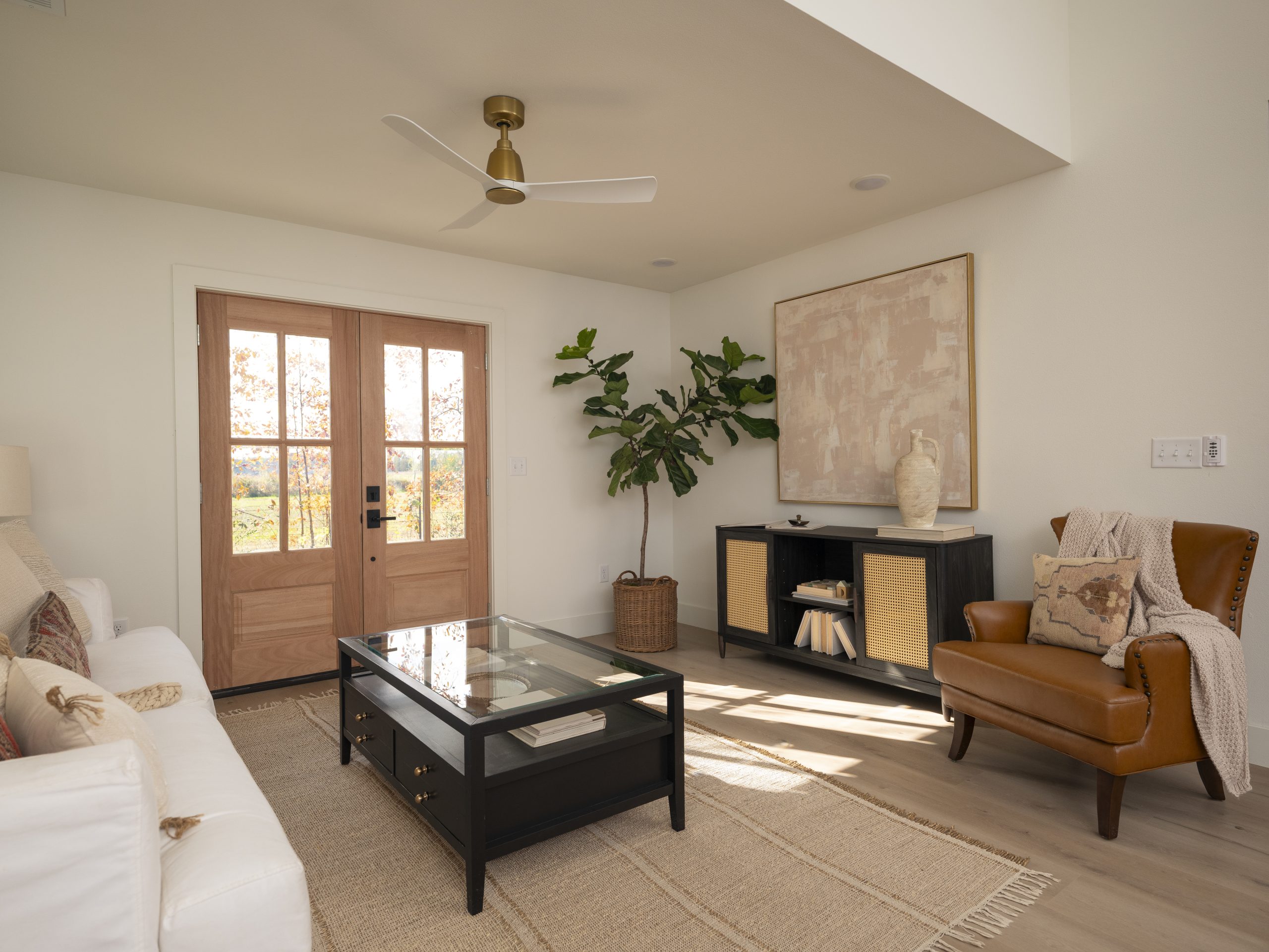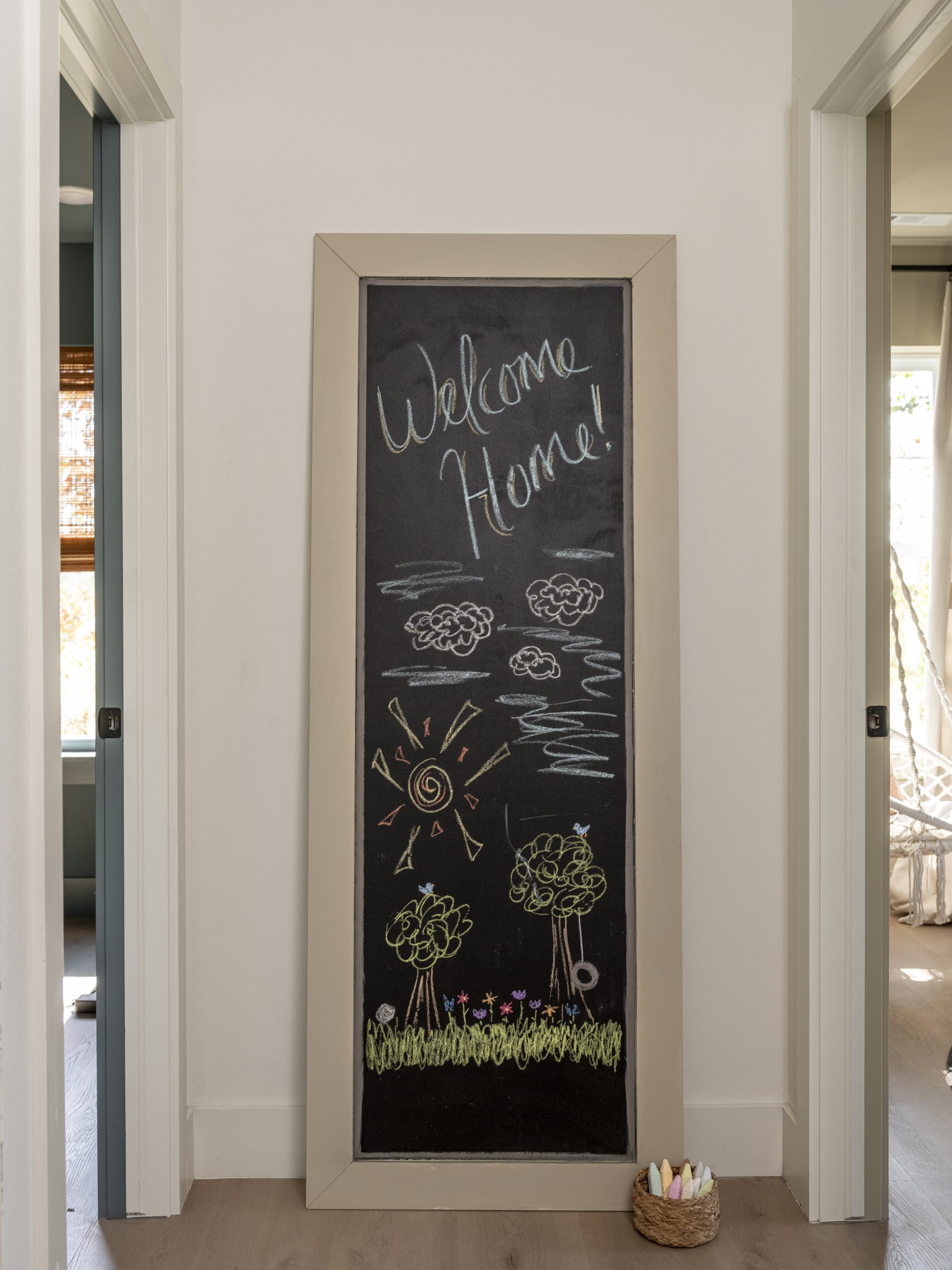 The living room was designed as a cozy hangout spot for everyday life. We used durable, kid-friendly LVP flooring so the space could stand up to real use. Dave built a large chalkboard, similar to the one we have at home, where Amber can write birthday messages and mark the first and last days of school for the kids. A beautiful statement chandelier anchors the room, while double doors lead out to the yard, making it easy for the kids to run in and out while Amber is nearby in the kitchen or living room. Warm, natural tones are mixed with modern metals, leather, and white finishes. Since this is a new build, we added photos of Amber and the kids to bring more of their personality into the space and help it feel more established.