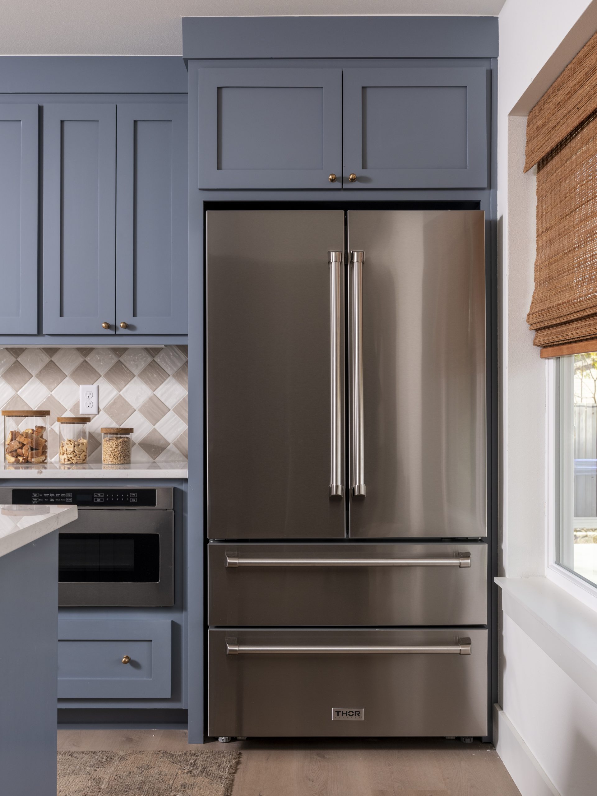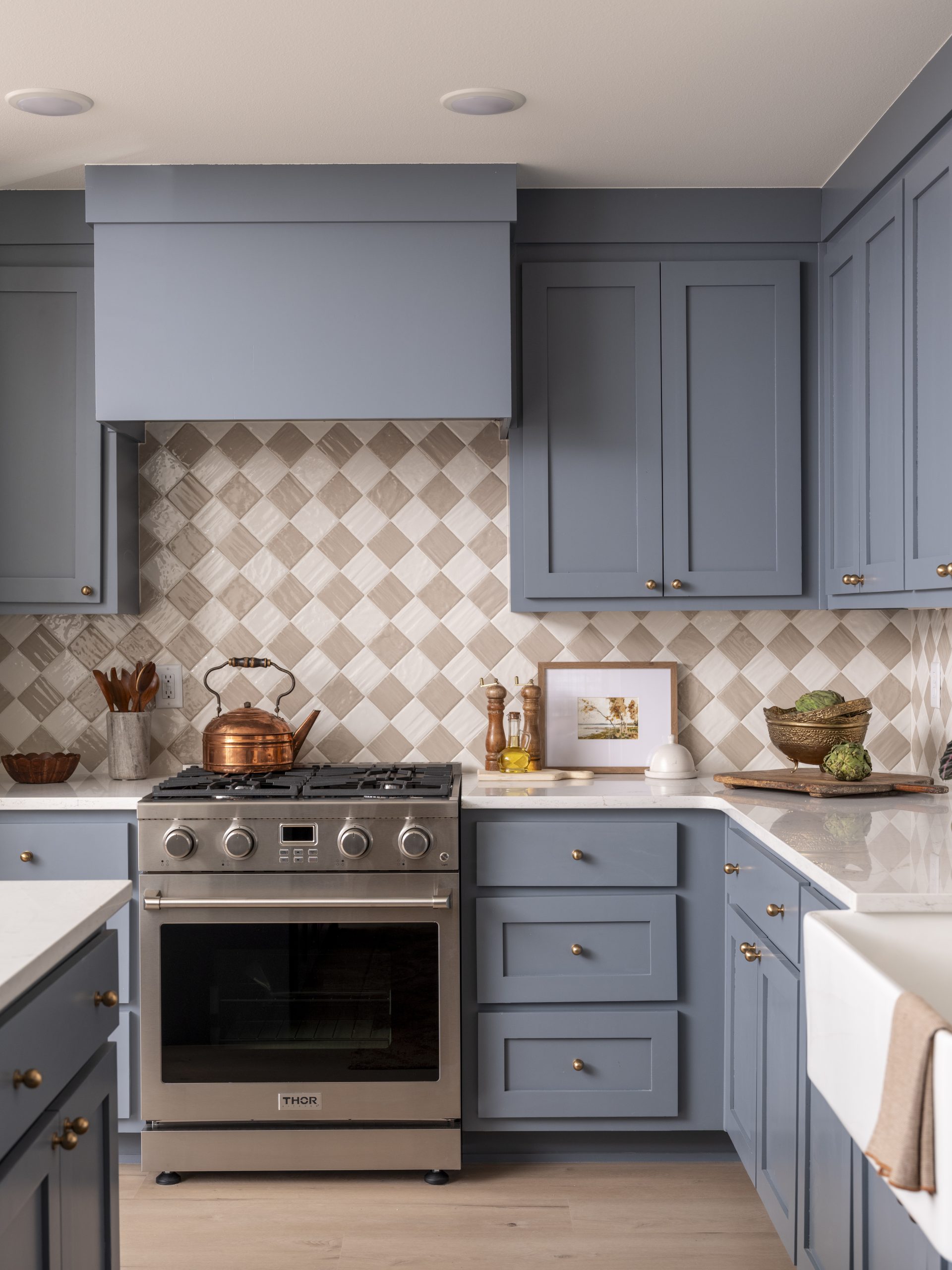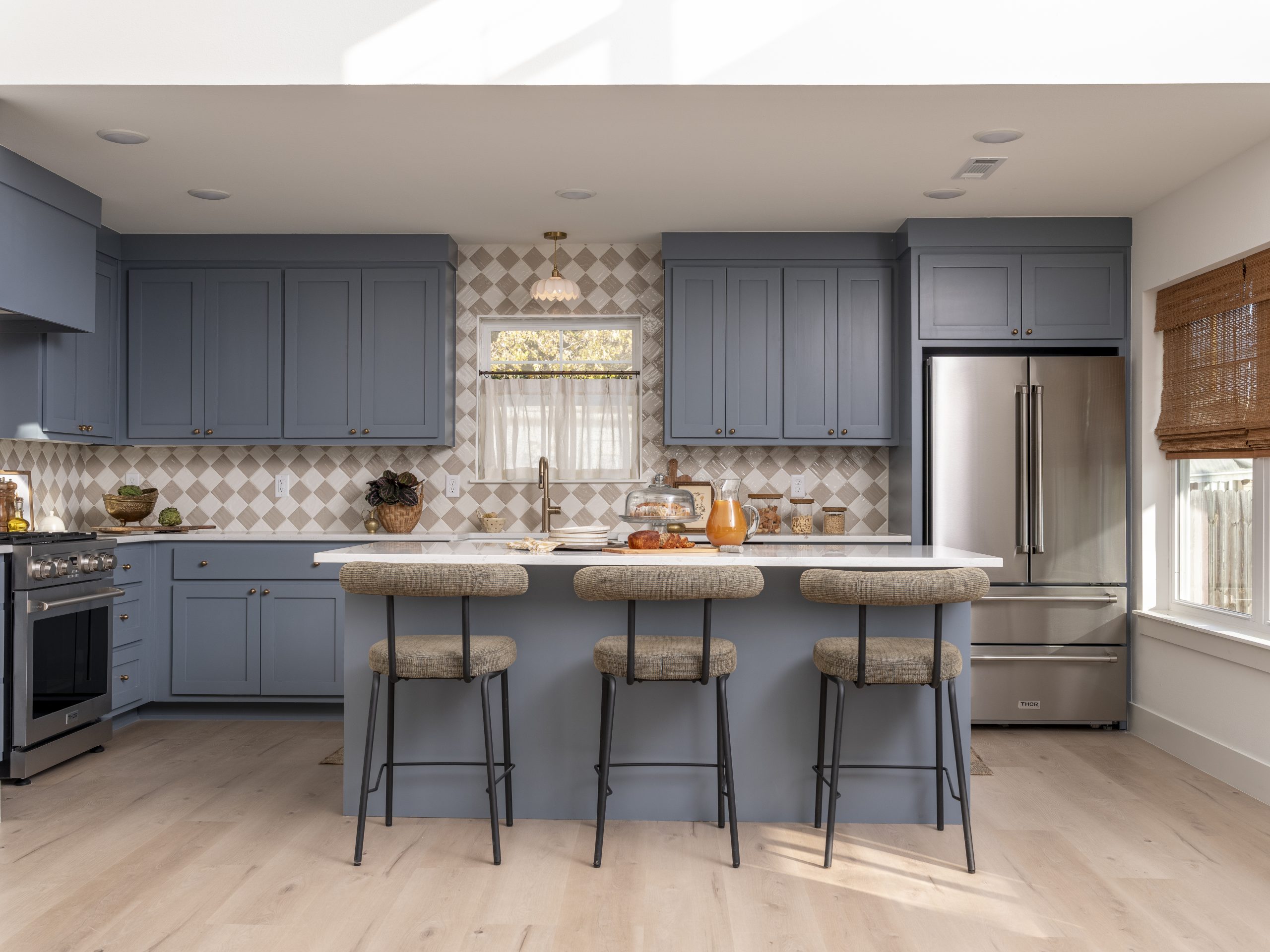 The kitchen has a farmhouse feel, with stainless steel appliances, stone countertops, a large island, and a tiled backsplash. Amber didn’t ask for anything specific, but as we got to know her, we learned she loved the color blue. We chose a soft blue for the cabinets and paired it with a cream-colored, checkered square backsplash for a classic farmhouse look.