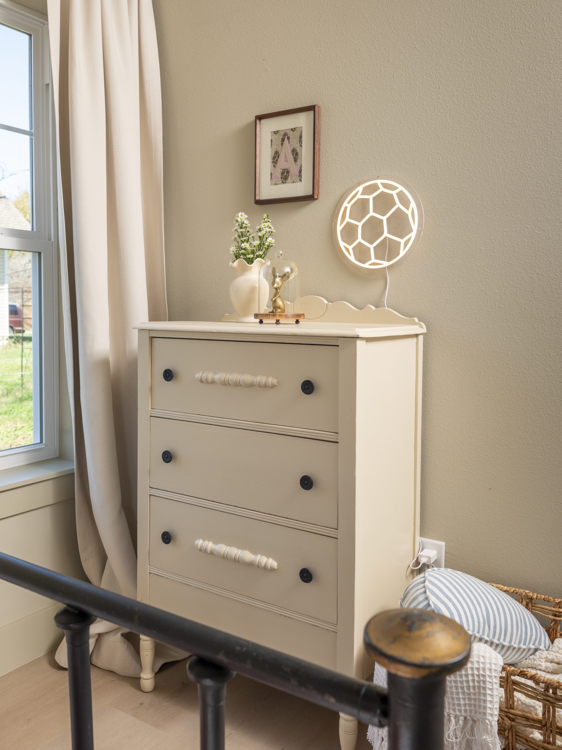 For Addie, we wanted her bedroom to reflect who she is, and knowing she loves soccer gave us the perfect starting point. Gather Goods generously donated the furniture for this room, including the cutest bed and dresser. We mixed traditional and modern elements, then added personality with the fun soccer ball wall light and a crocheted swing. The result is a sweet space that doesn’t feel overly girly, making it just right for a pre-teen.