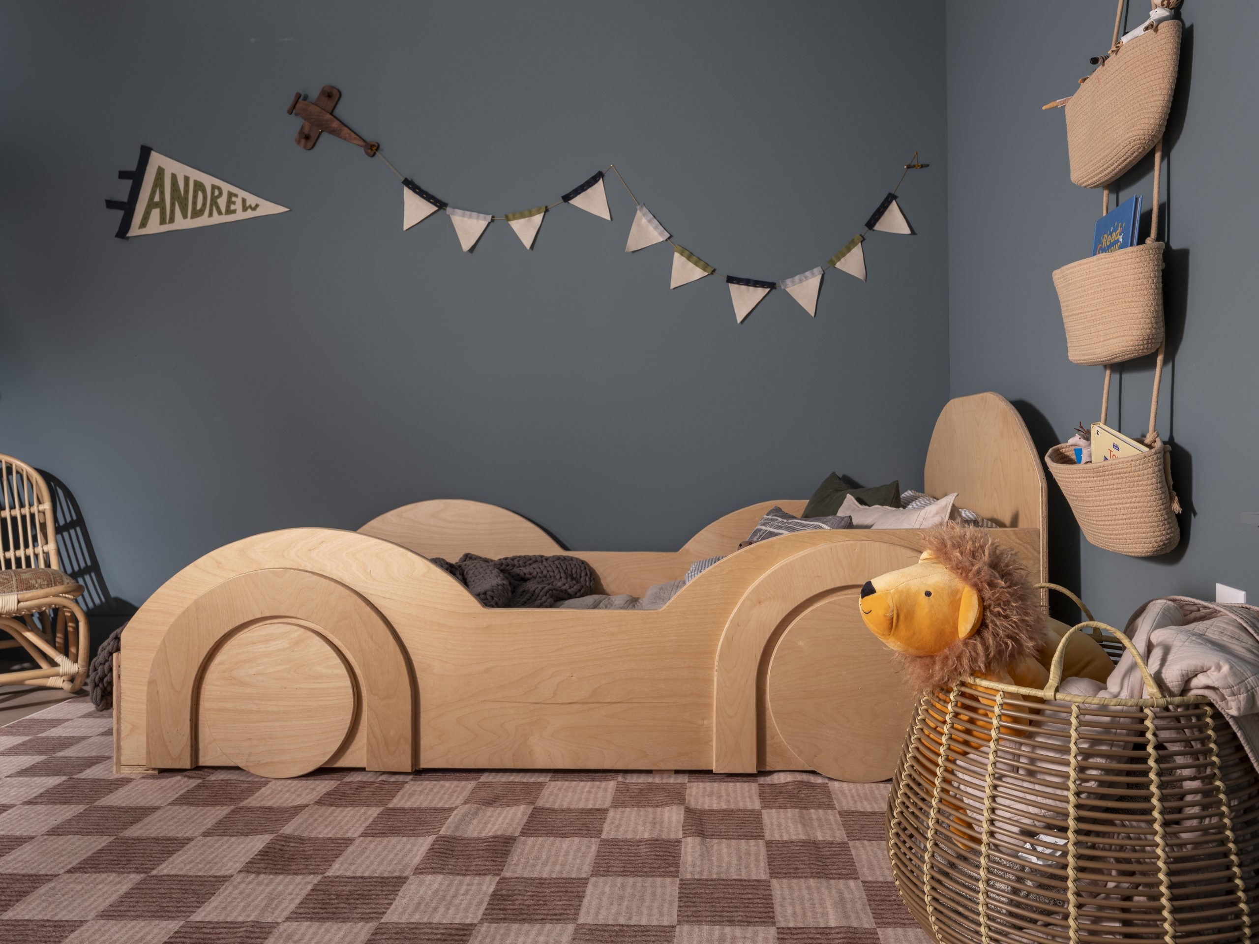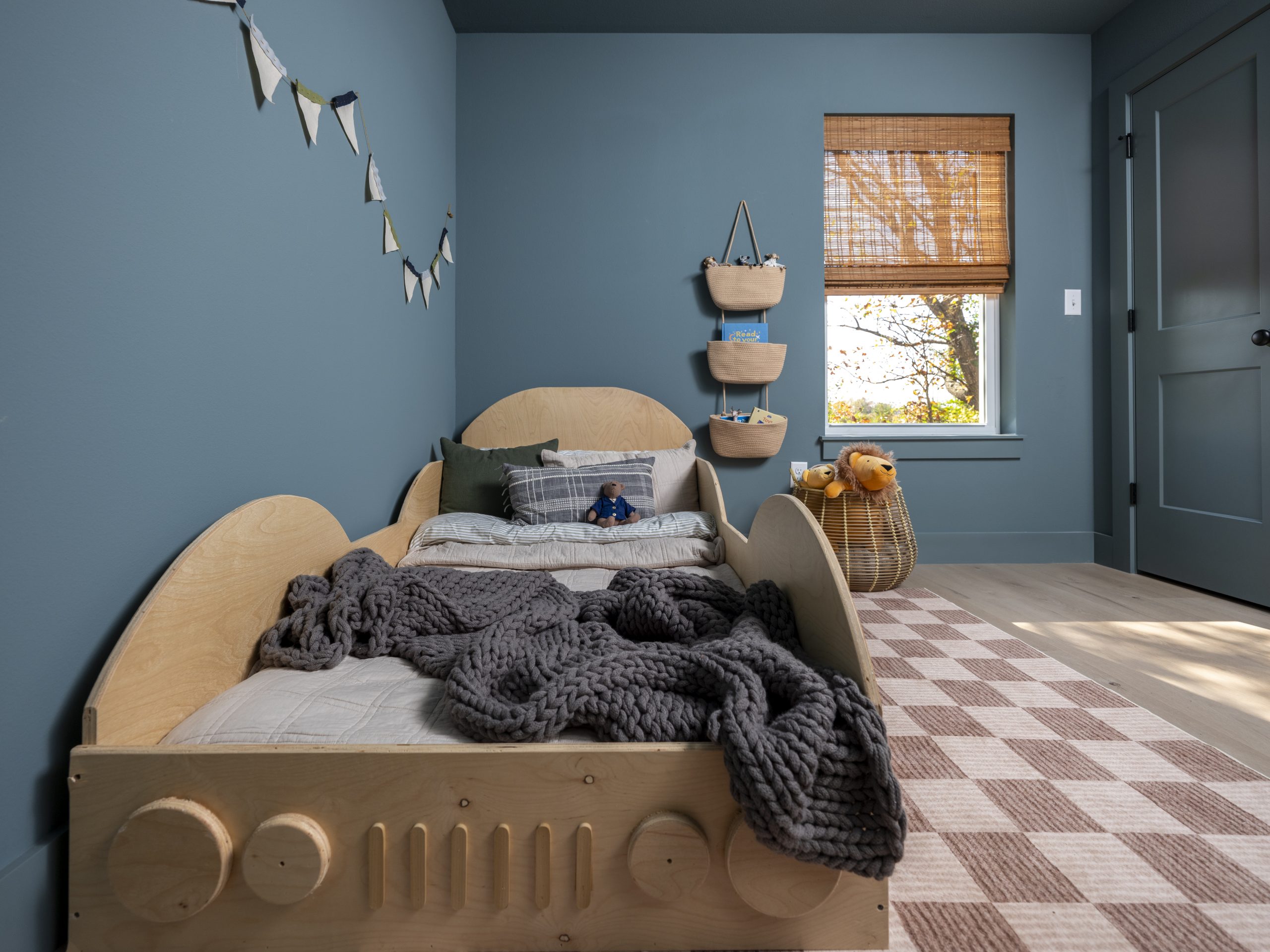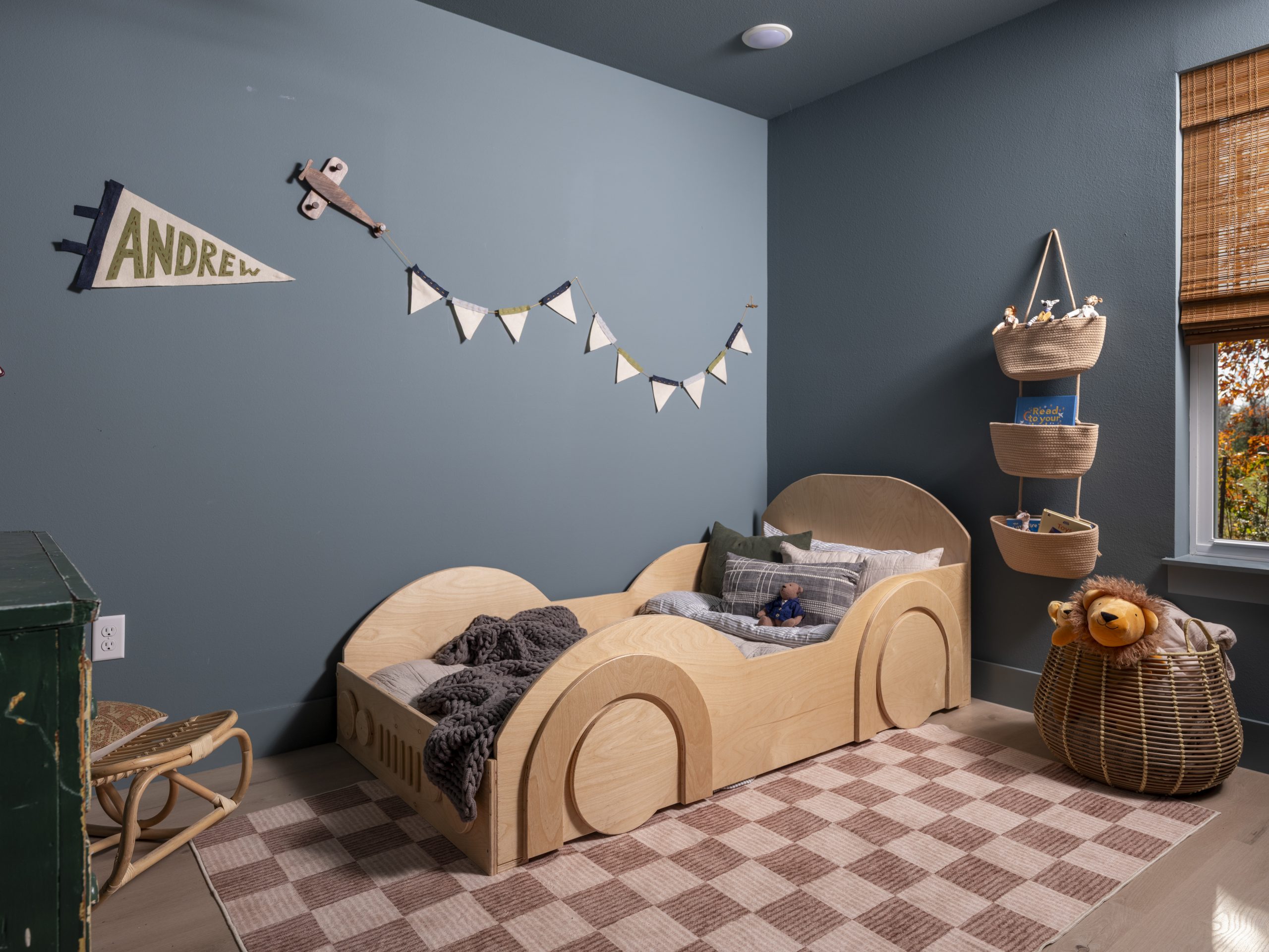 Like most little boys his age, Andrew loves cars. Dave made a one-of-a-kind car bed just for him, which became the centerpiece of the room. We painted the walls a darker shade to create contrast with the lighter, natural elements throughout the space, giving the room a cozy feel that still feels playful and fun.