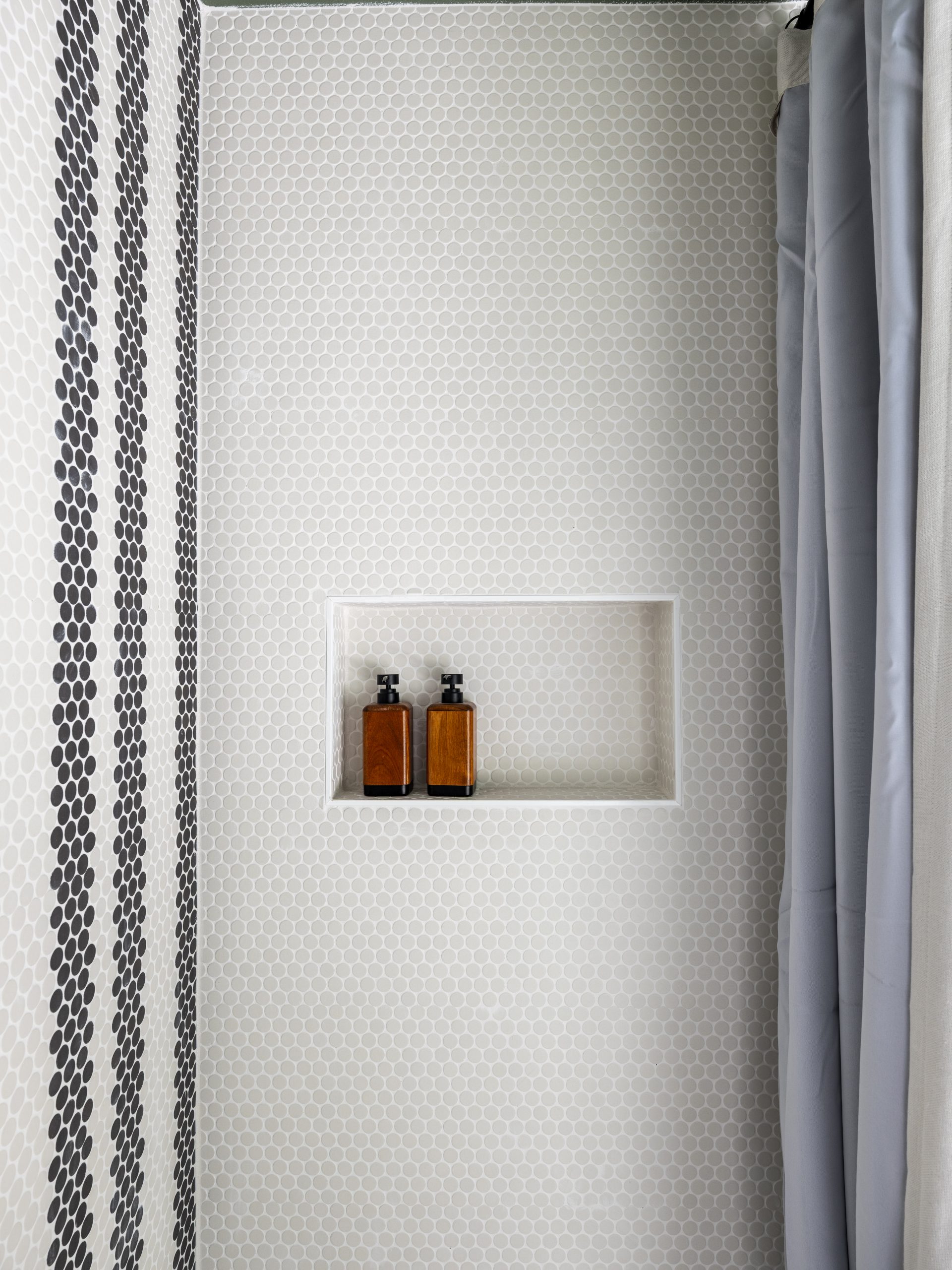 We continued the wood paneling in here to keep the flow consistent throughout the home. Mosaic tile was used on the floors, with marble subway tile surrounding the bathtub. A mix of gold fixtures and black accessories brings in contrast, and the brushed gold faucet paired with a clean-lined mirror reinforces the balance between modern and classic.