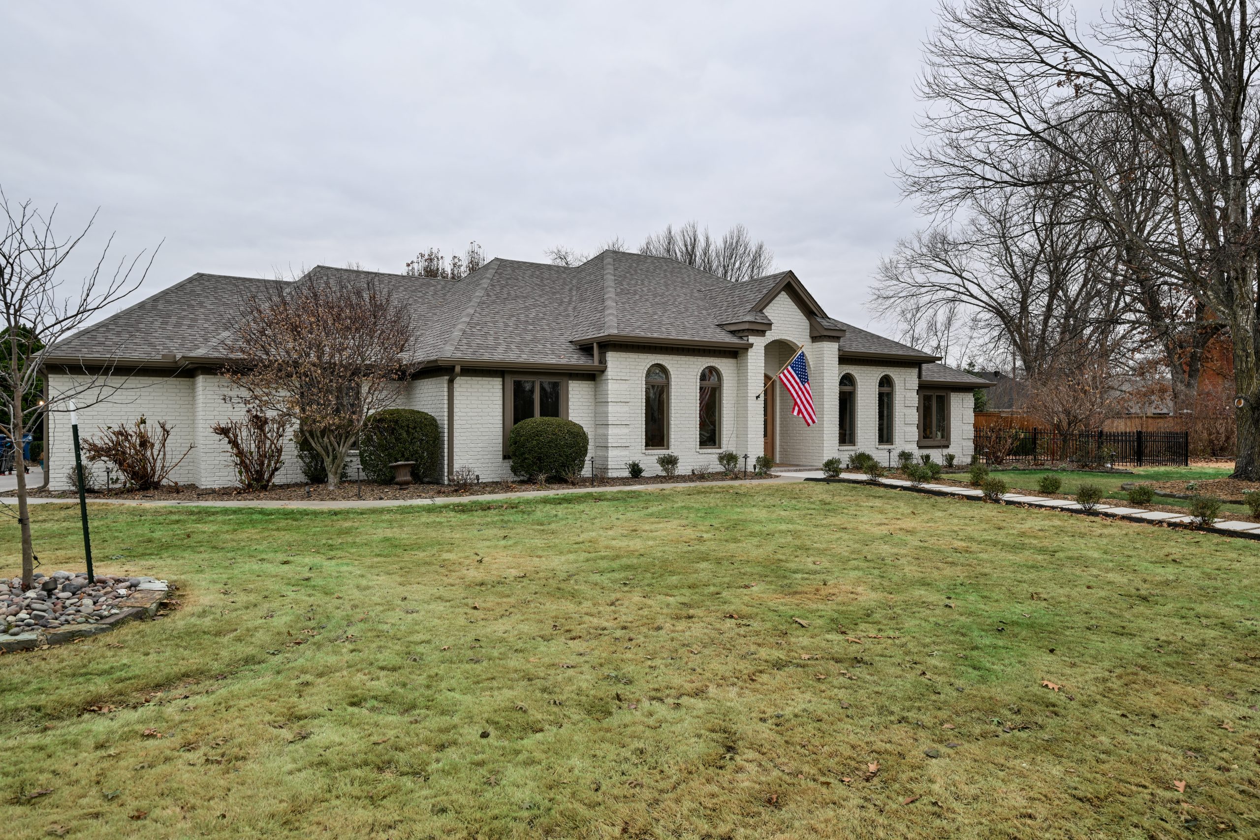 The house was in good shape on the outside and didn’t need any major repairs or reconstruction. It just needed a few impactful changes to feel more welcoming. At the Lundeens’ request, we removed two overgrown pine trees that were hiding the front entrance and installed a walkway from the street to the front door. Those two updates made a huge difference in curb appeal. Then we painted the old tan-colored trim a soft mushroom taupe and the brick an off-white to brighten everything up. The new natural wood front door adds warmth and character against the modern updates.